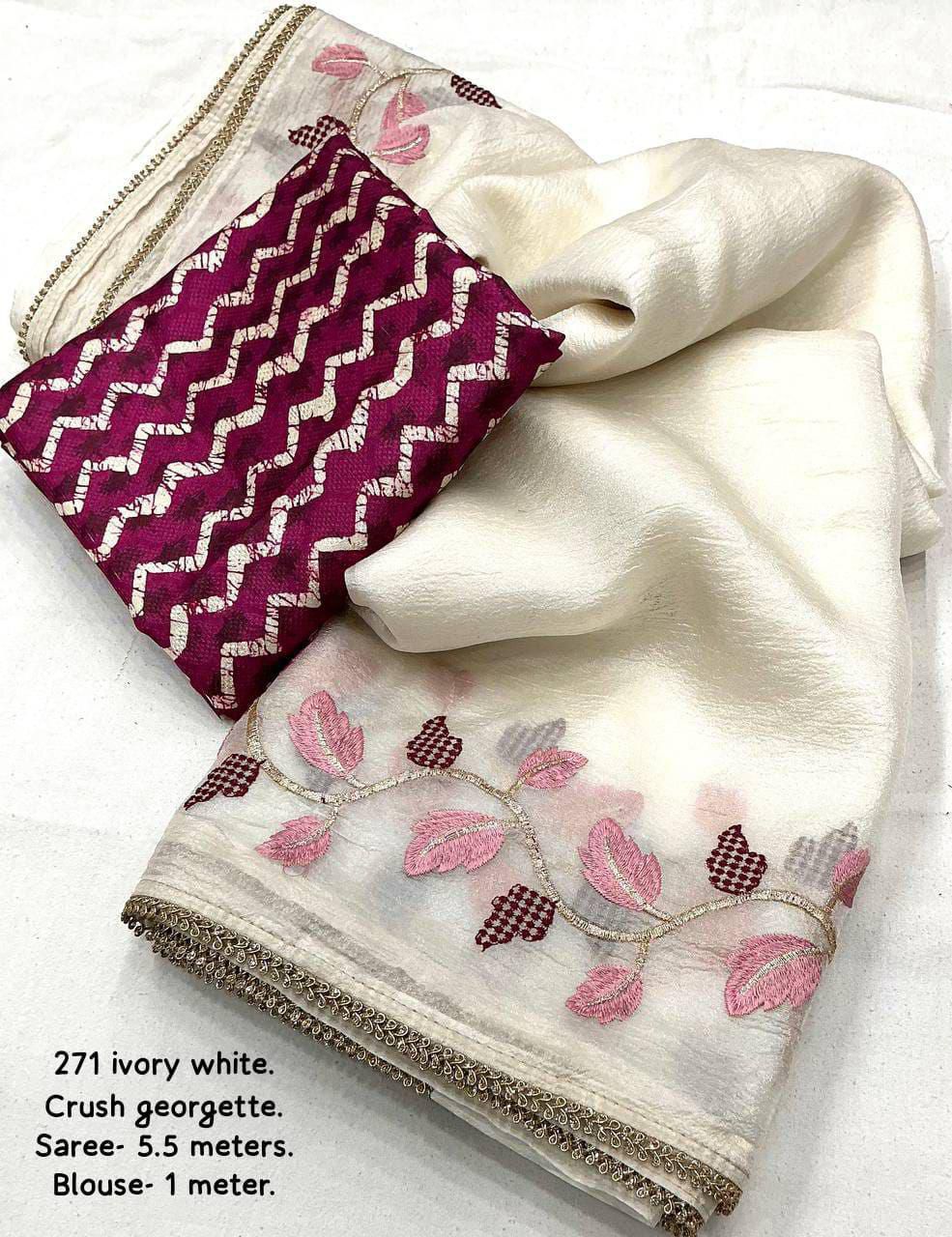 Elevate your ethnic wardrobe with this restocked premium single-color designer saree from AK, crafted in luxurious soft crush georgette that drapes effortlessly and feels feather-light on the body. The elegant white leaf embroidery spread across the saree adds a subtle yet sophisticated charm, making it perfect for both grand occasions and refined everyday elegance. Its beautifully designed C-pallu enhanced with a stylish patched lace border brings a modern designer finish while maintaining a graceful traditional appeal. Paired with a perfectly matched batik-style digital printed crepe silk blouse piece, this ensemble creates a striking contrast that enhances the overall look. With a generous 5.5-meter saree length and a 1-meter blouse fabric, it offers ample styling flexibility for a tailored fit. Designed for women who appreciate premium quality, timeless aesthetics, and understated luxury, this saree is an ideal choice for parties, festive gatherings, formal events, and special celebrations where you want to look effortlessly elegant and refined.