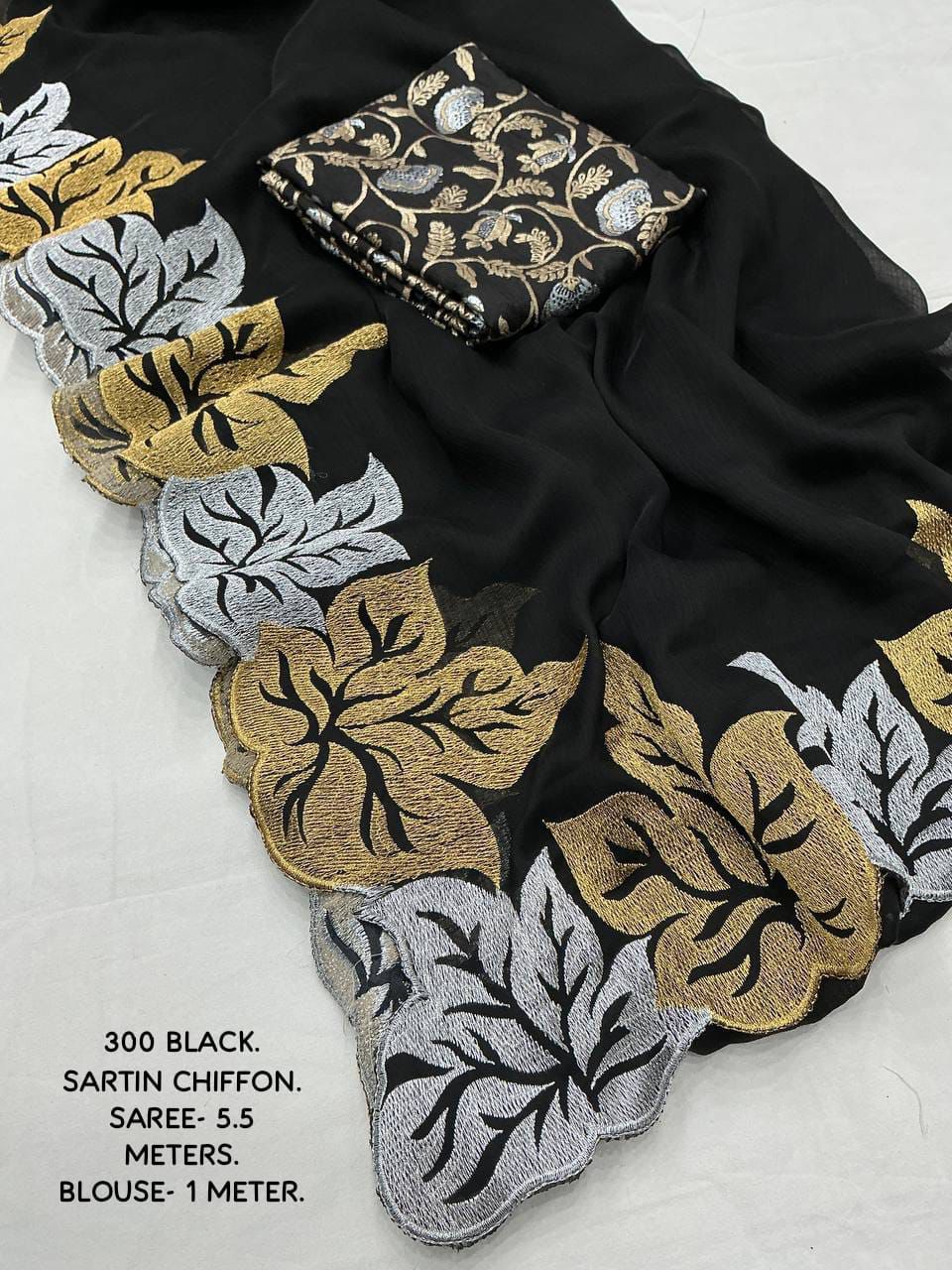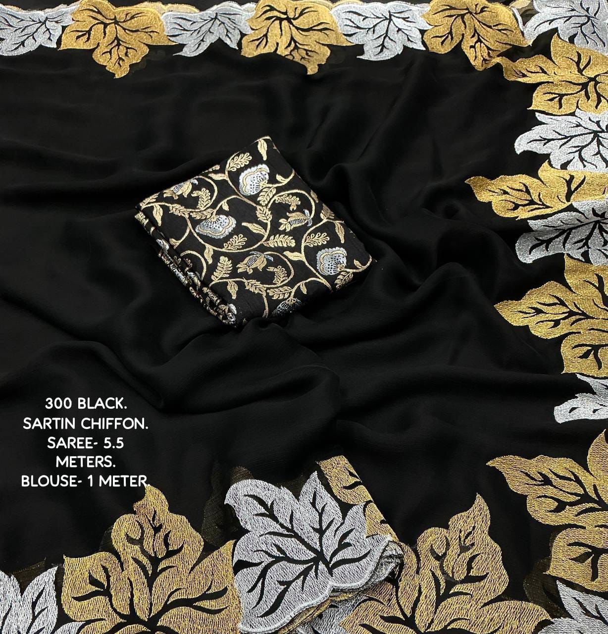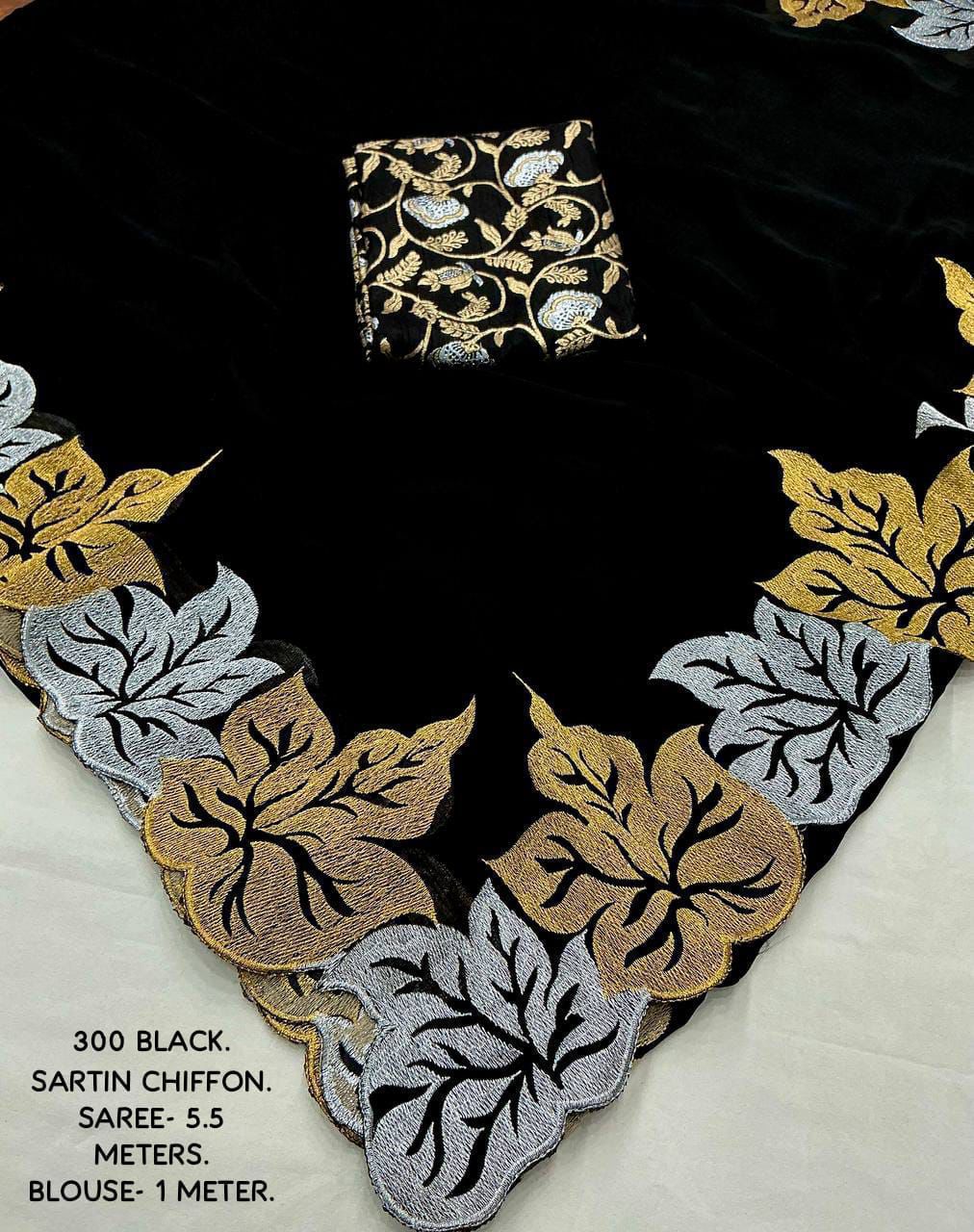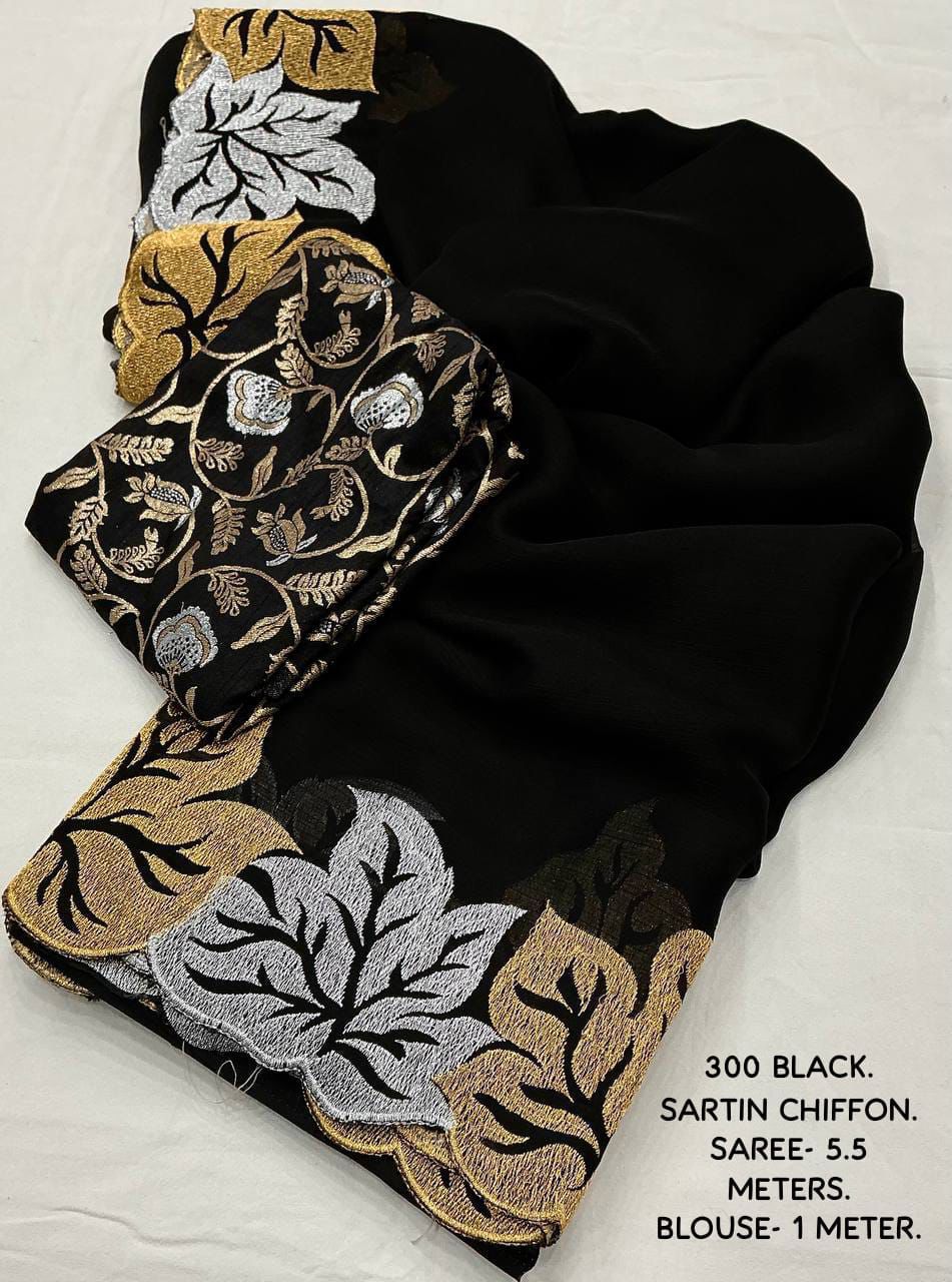 Back in stock with a stunning new colour addition, this new fancy satin chiffon embroidery saree in the exclusive single-colour Black Paan edition is designed to make a bold and elegant statement. Crafted from soft satin chiffon, the saree drapes beautifully with a smooth, lightweight feel, while the delicate leaf-inspired embroidery enhanced with fine cutwork adds a touch of artistic sophistication. The rich combination of silver and gold zari work creates a luxurious contrast against the deep black base, making it perfect for parties, festive occasions, and evening celebrations. Paired with a perfectly matched black Banarasi silk blouse featuring trendy tie-and-dye effects and intricate silver and gold zari woven designs, this ensemble delivers a complete premium look. With generous saree and blouse lengths and top-grade finishing, this premium quality saree is an ideal choice for those who love timeless glamour blended with modern trends.