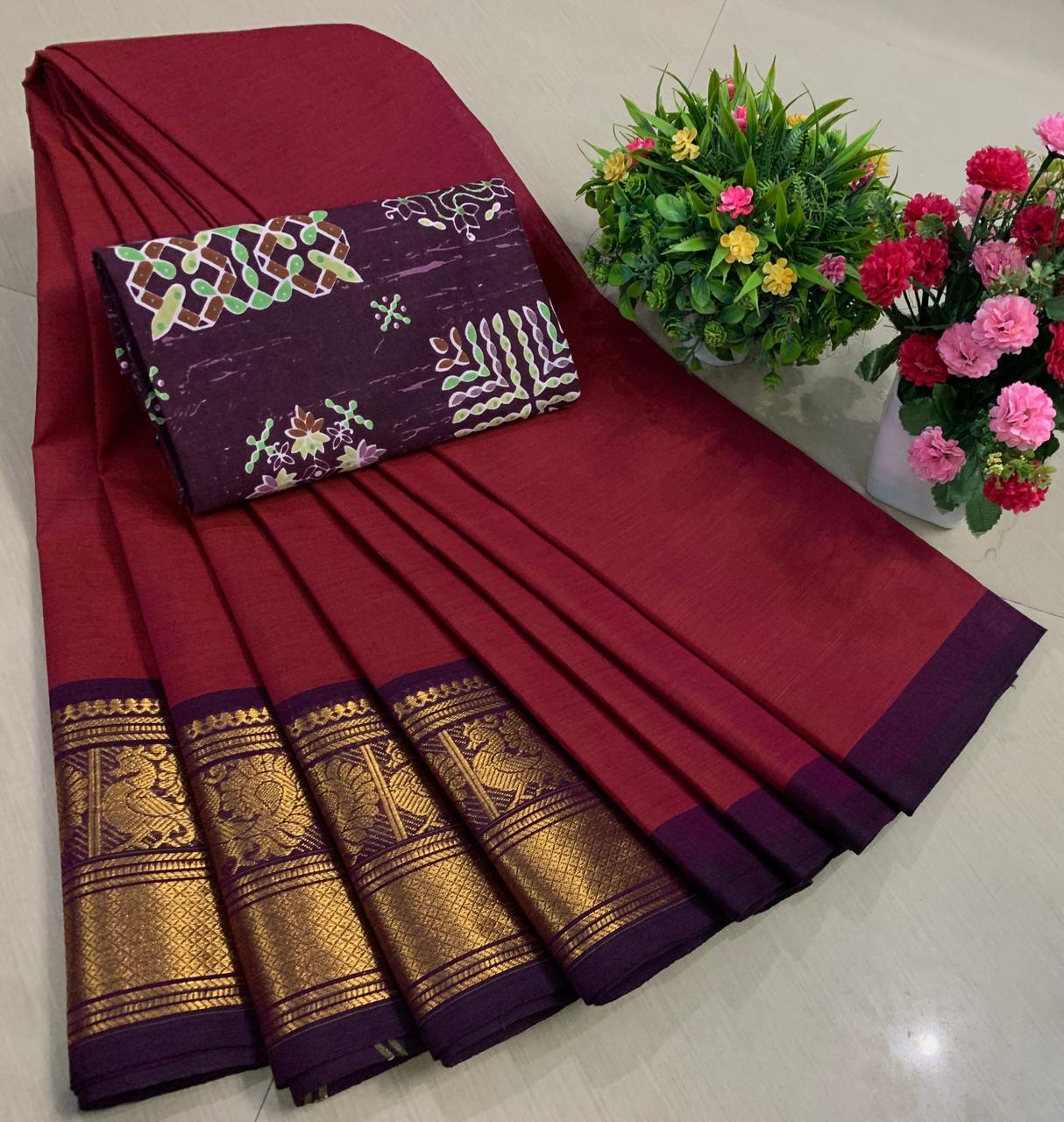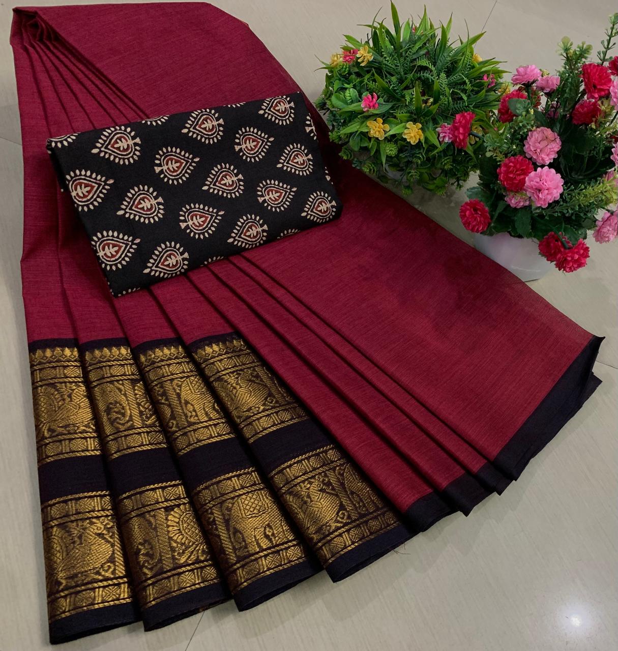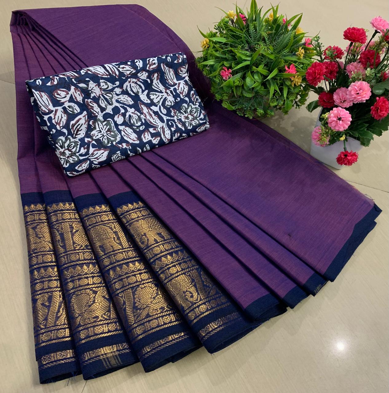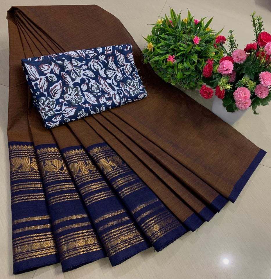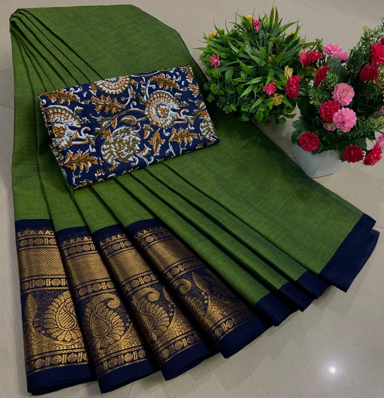 Experience the beauty of tradition with these elegant Chettinadu Pure Cotton Sarees with Kalamkari Blouse, designed to bring comfort, heritage, and style together. Crafted from 100% pure cotton with fine 80 count fabric, these sarees offer a soft, breathable, and lightweight feel, making them perfect for all-day wear in any season. The highlight of the saree is its bold and eye-catching big borders, which add a classic and rich look inspired by traditional Chettinadu weaving. The saree is paired with a beautiful Kalamkari blouse, featuring artistic prints that enhance the overall ethnic appeal and create a perfect contrast. With a generous length, it allows for versatile draping styles while maintaining elegance and ease. Ideal for daily wear, office use, casual outings, or cultural occasions, this saree blends simplicity with timeless charm. The natural cotton texture ensures comfort, while the traditional design makes it a graceful addition to your wardrobe. Whether styled in a classic or modern way, this Chettinadu cotton saree with Kalamkari blouse is a must-have for those who appreciate authentic Indian craftsmanship with a stylish touch.