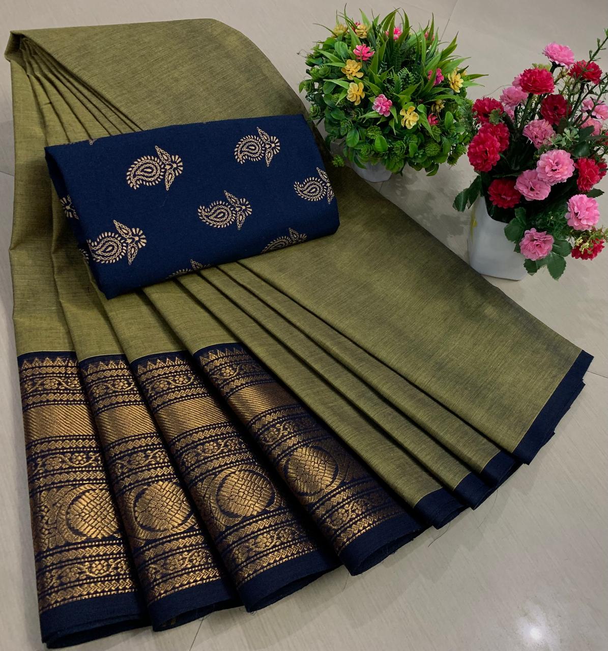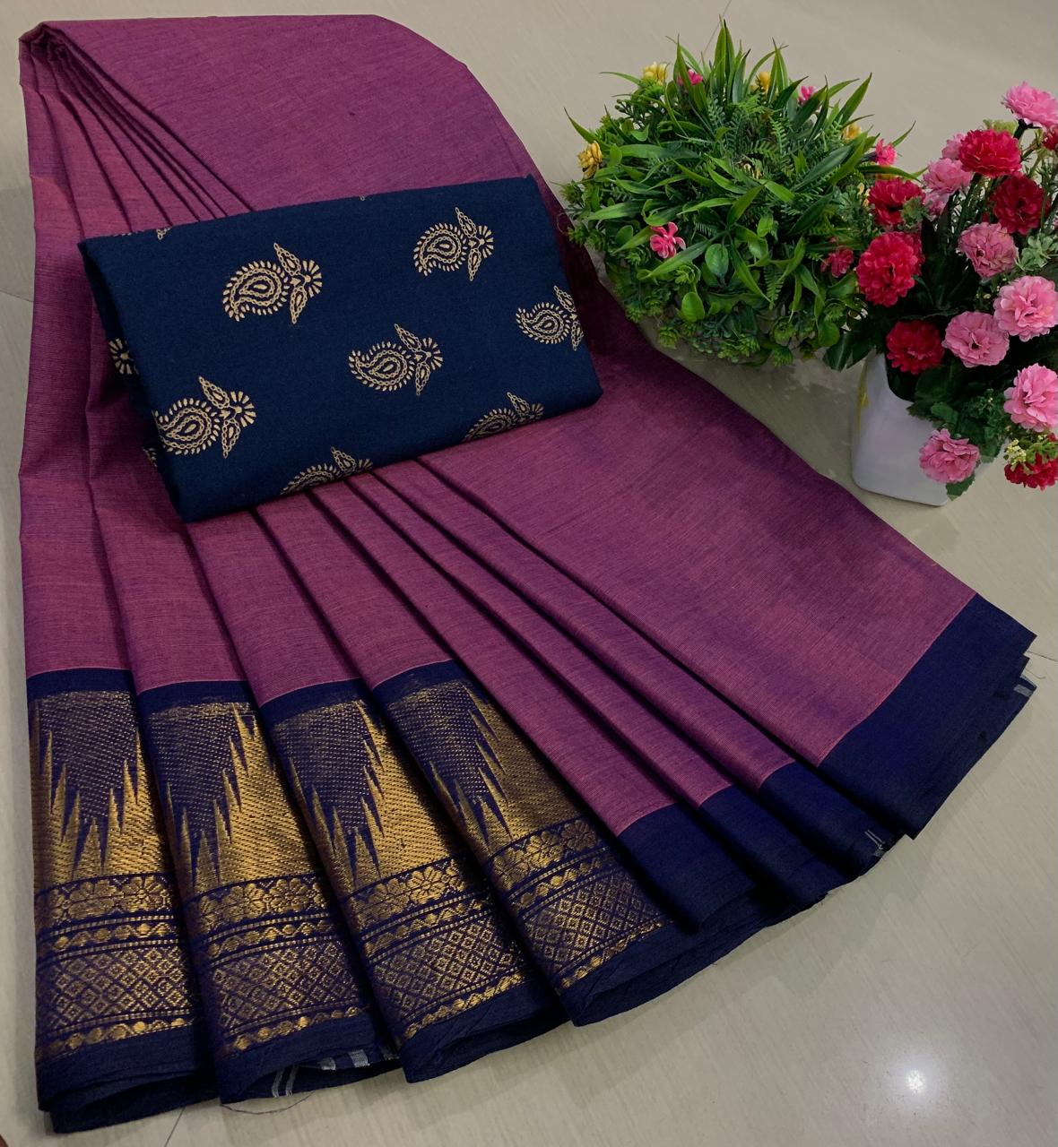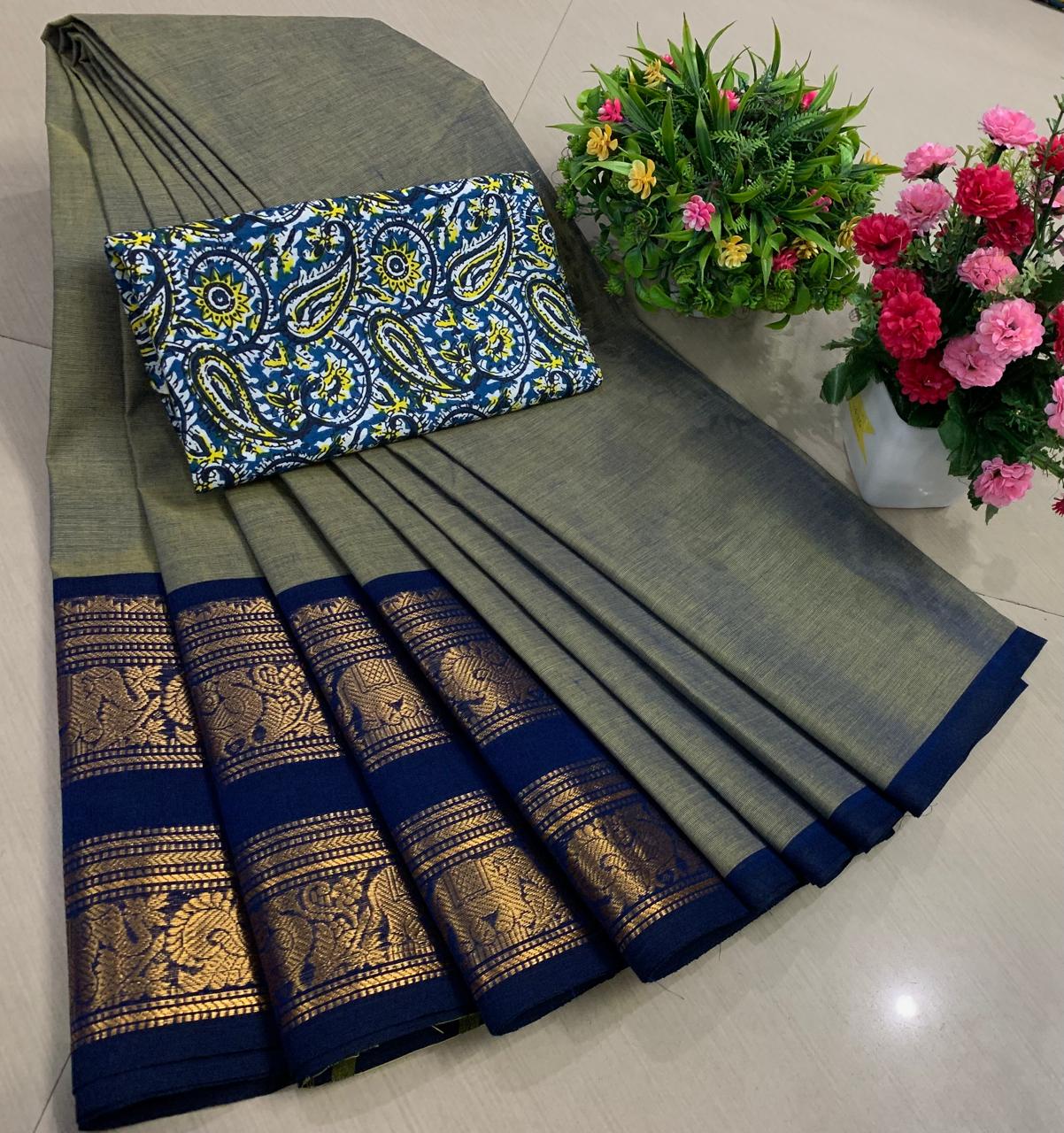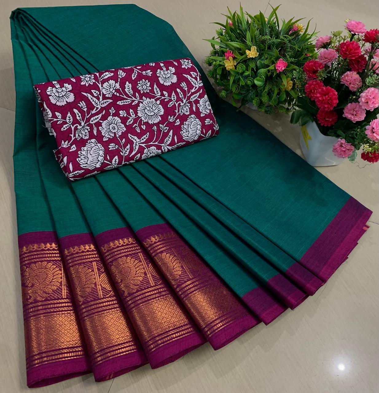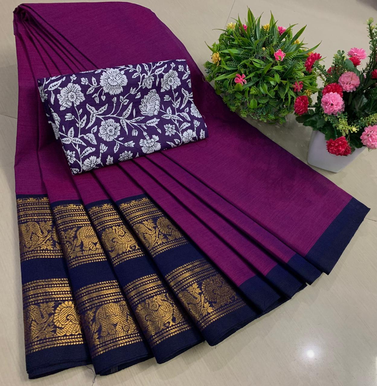 Experience the beauty of tradition with these elegant Chettinadu Pure Cotton Sarees with Kalamkari Blouse, designed to bring comfort, heritage, and style together. Crafted from 100% pure cotton with fine 80 count fabric, these sarees offer a soft, breathable, and lightweight feel, making them perfect for all-day wear in any season. The highlight of the saree is its bold and eye-catching big borders, which add a classic and rich look inspired by traditional Chettinadu weaving. The saree is paired with a beautiful Kalamkari blouse, featuring artistic prints that enhance the overall ethnic appeal and create a perfect contrast. With a generous length, it allows for versatile draping styles while maintaining elegance and ease. Ideal for daily wear, office use, casual outings, or cultural occasions, this saree blends simplicity with timeless charm. The natural cotton texture ensures comfort, while the traditional design makes it a graceful addition to your wardrobe. Whether styled in a classic or modern way, this Chettinadu cotton saree with Kalamkari blouse is a must-have for those who appreciate authentic Indian craftsmanship with a stylish touch.