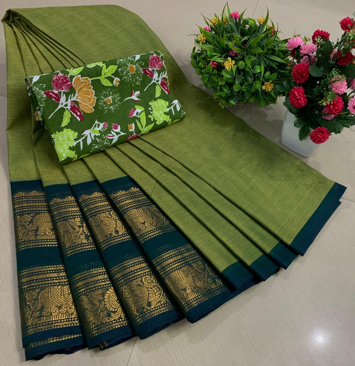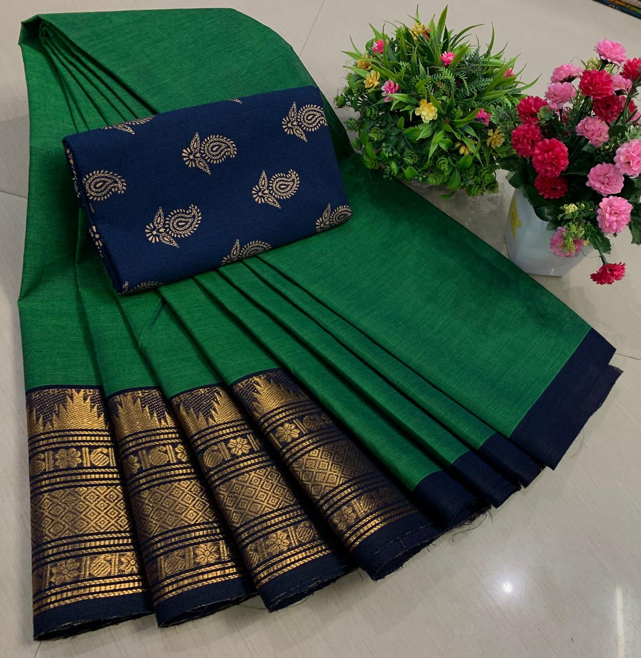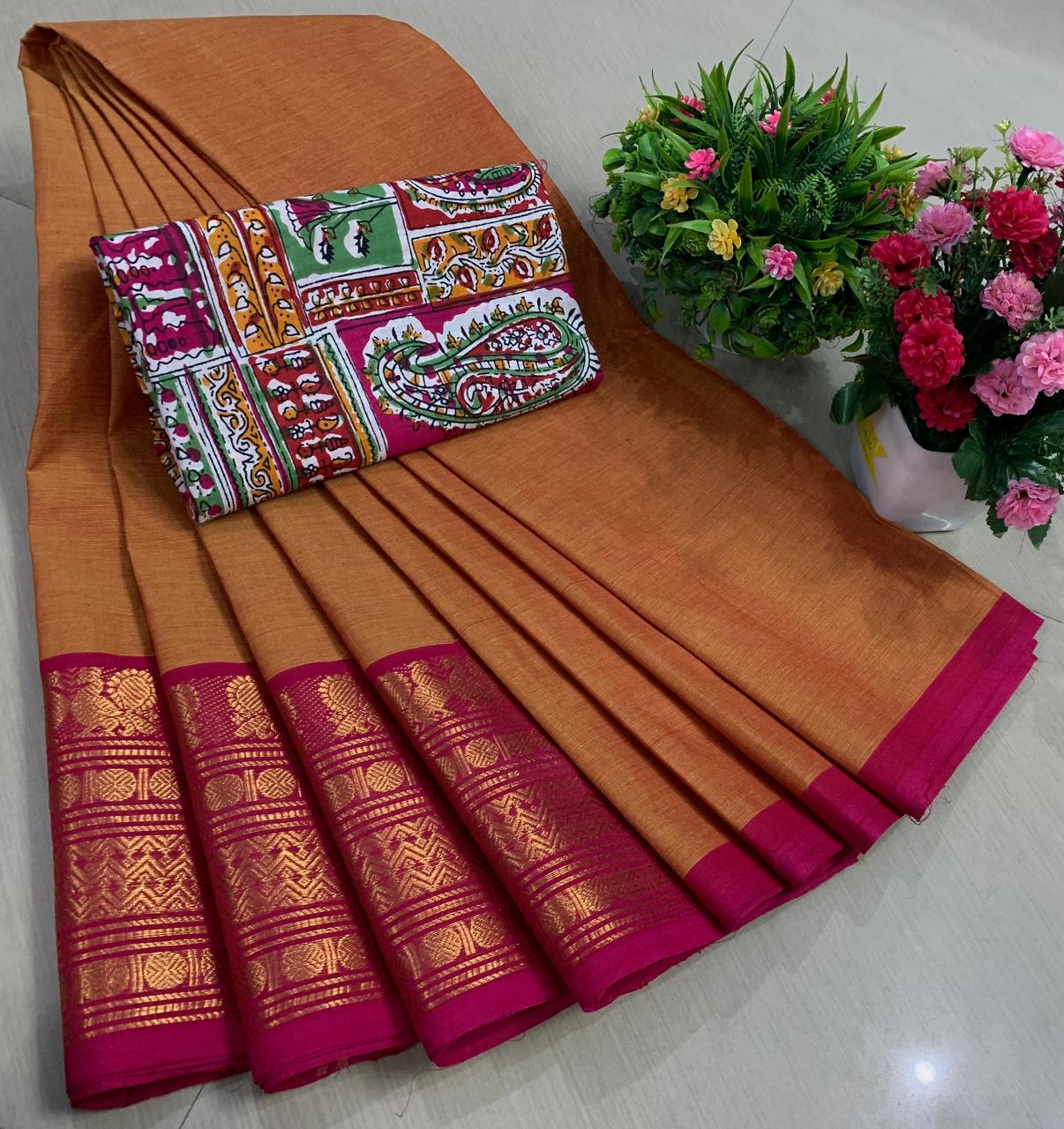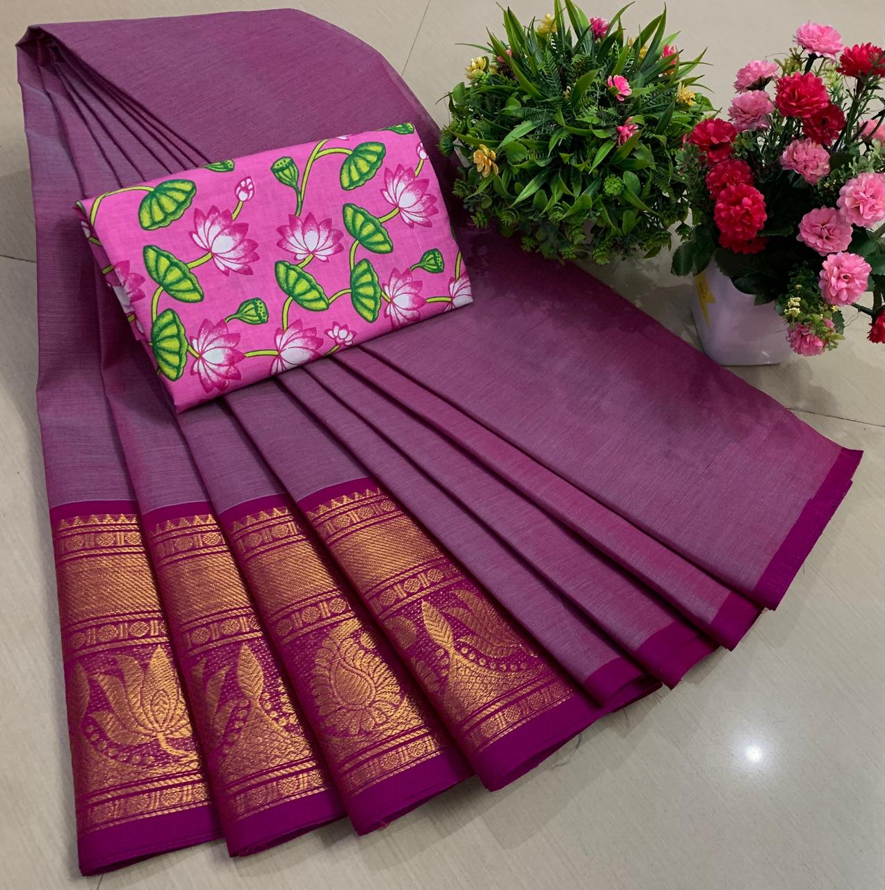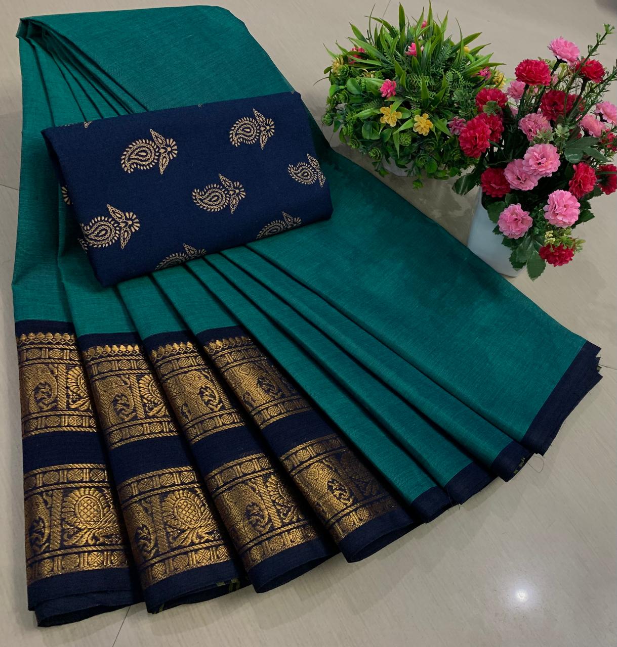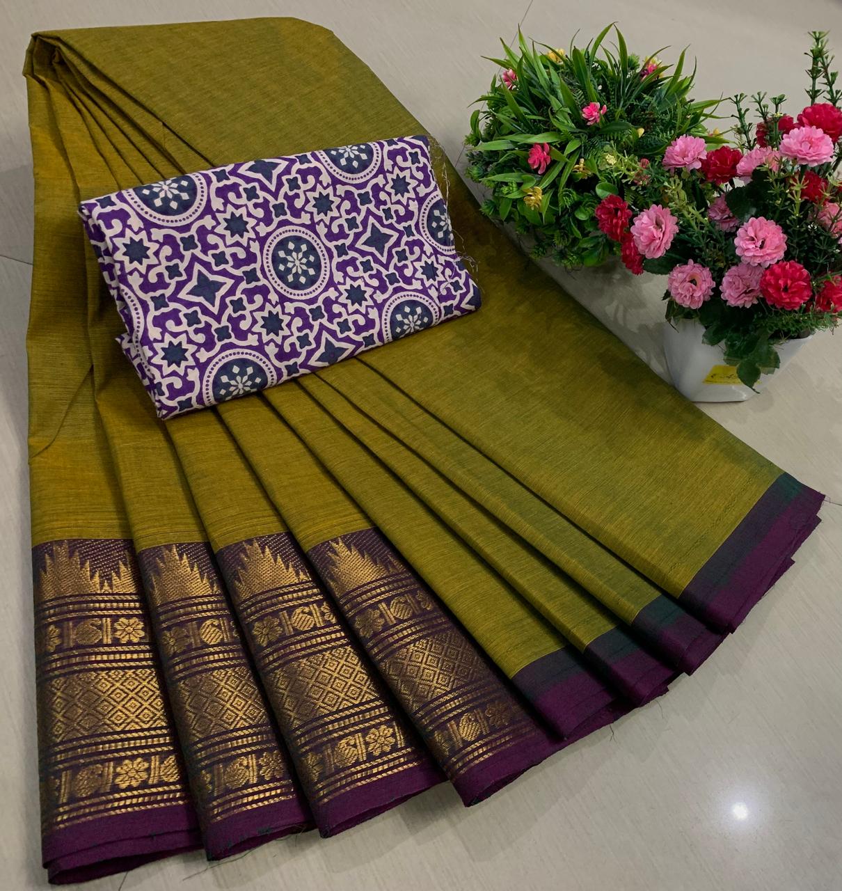 Experience the beauty of tradition with these elegant Chettinadu Pure Cotton Sarees with Kalamkari Blouse, designed to bring comfort, heritage, and style together. Crafted from 100% pure cotton with fine 80 count fabric, these sarees offer a soft, breathable, and lightweight feel, making them perfect for all-day wear in any season. The highlight of the saree is its bold and eye-catching big borders, which add a classic and rich look inspired by traditional Chettinadu weaving. The saree is paired with a beautiful Kalamkari blouse, featuring artistic prints that enhance the overall ethnic appeal and create a perfect contrast. With a generous length, it allows for versatile draping styles while maintaining elegance and ease. Ideal for daily wear, office use, casual outings, or cultural occasions, this saree blends simplicity with timeless charm. The natural cotton texture ensures comfort, while the traditional design makes it a graceful addition to your wardrobe. Whether styled in a classic or modern way, this Chettinadu cotton saree with Kalamkari blouse is a must-have for those who appreciate authentic Indian craftsmanship with a stylish touch.