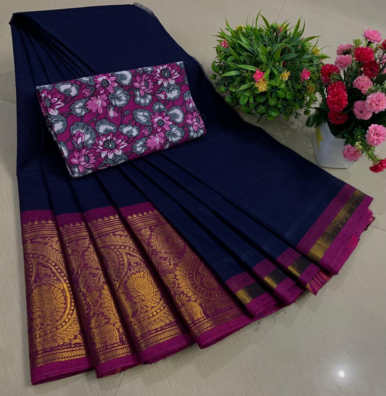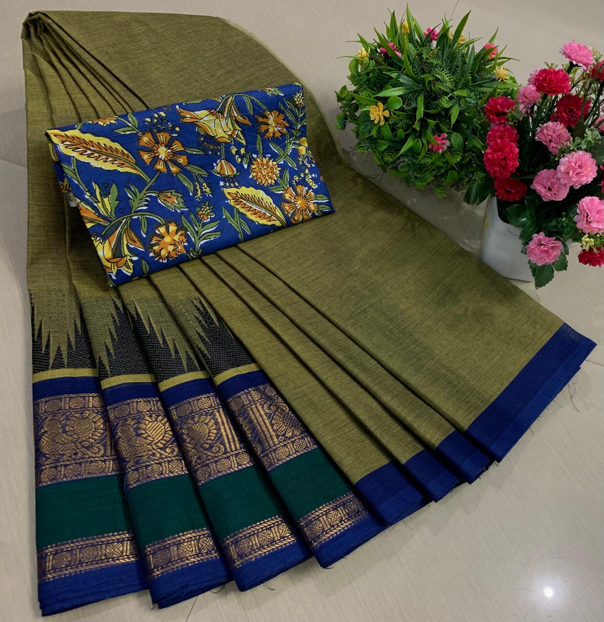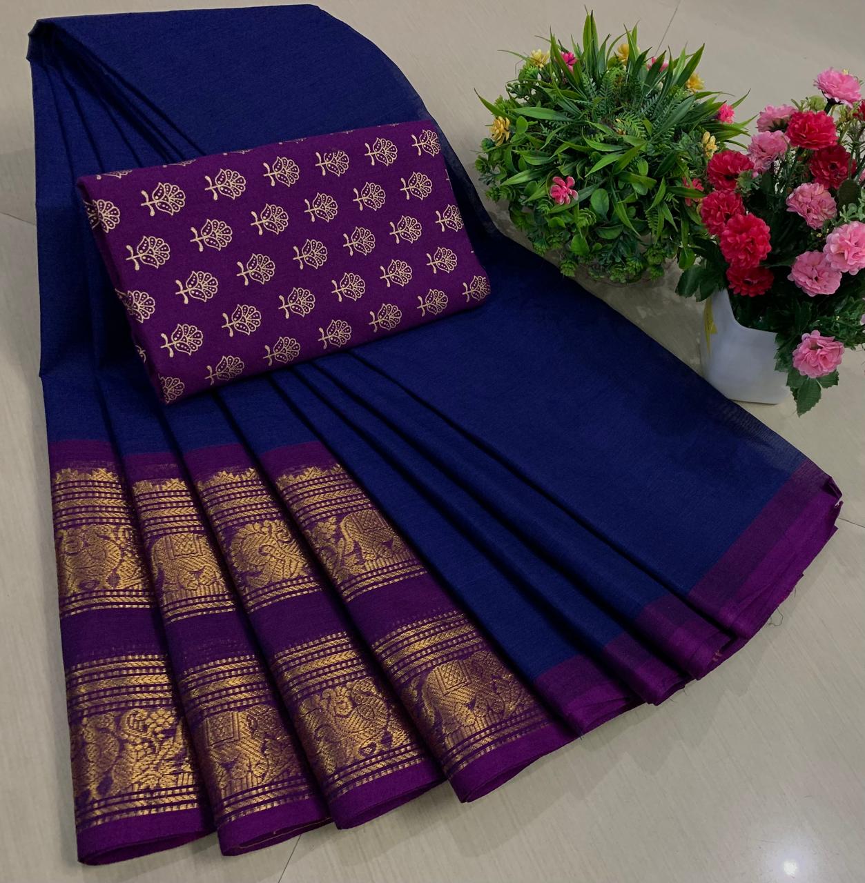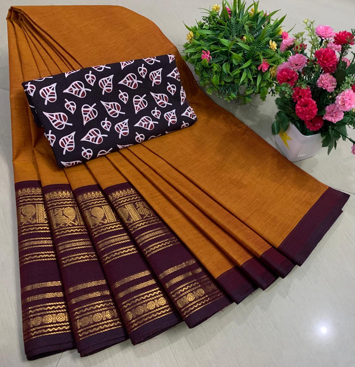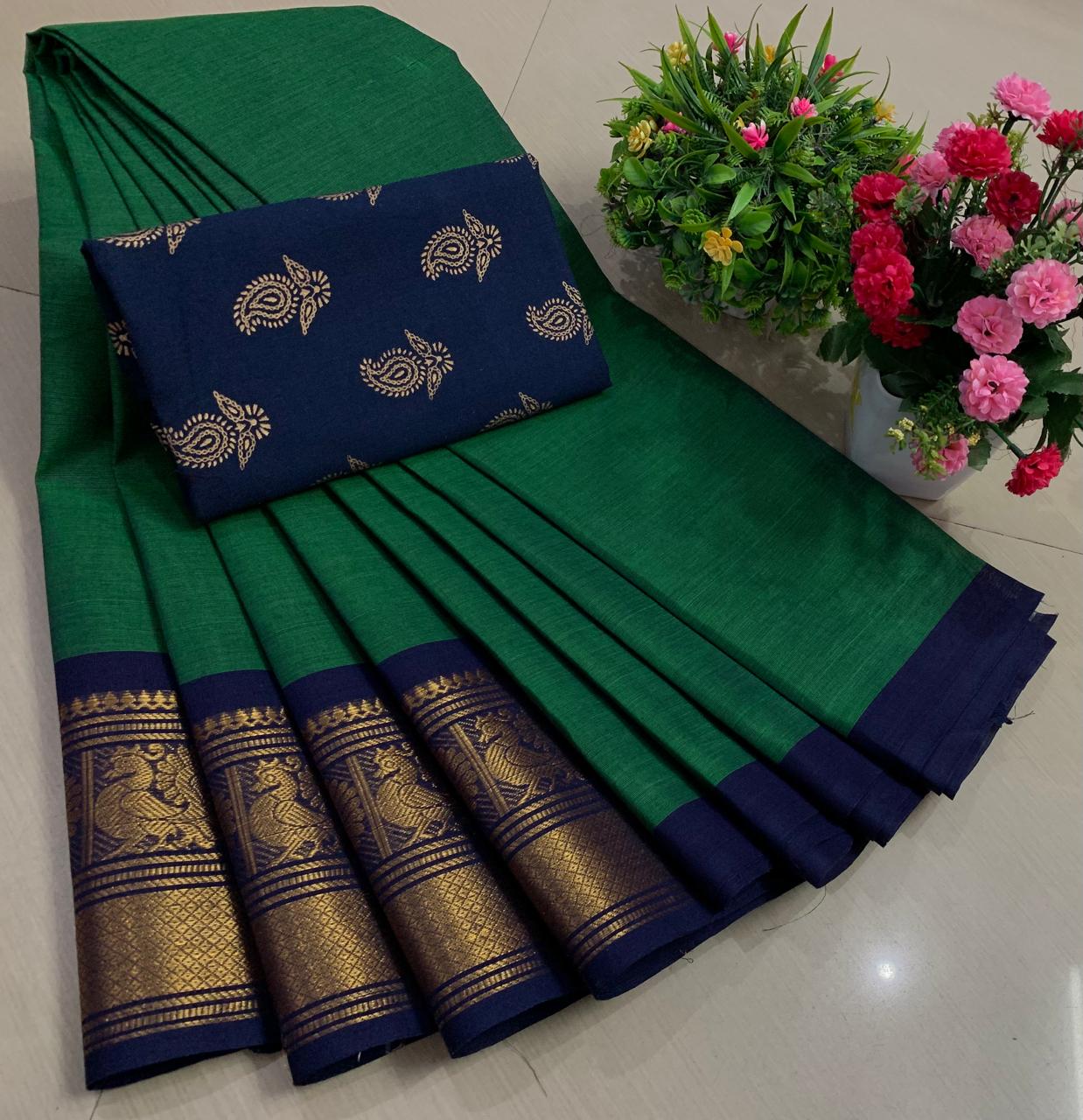 Experience the beauty of tradition with these elegant Chettinadu Pure Cotton Sarees with Kalamkari Blouse, designed to bring comfort, heritage, and style together. Crafted from 100% pure cotton with fine 80 count fabric, these sarees offer a soft, breathable, and lightweight feel, making them perfect for all-day wear in any season. The highlight of the saree is its bold and eye-catching big borders, which add a classic and rich look inspired by traditional Chettinadu weaving. The saree is paired with a beautiful Kalamkari blouse, featuring artistic prints that enhance the overall ethnic appeal and create a perfect contrast. With a generous length, it allows for versatile draping styles while maintaining elegance and ease. Ideal for daily wear, office use, casual outings, or cultural occasions, this saree blends simplicity with timeless charm. The natural cotton texture ensures comfort, while the traditional design makes it a graceful addition to your wardrobe. Whether styled in a classic or modern way, this Chettinadu cotton saree with Kalamkari blouse is a must-have for those who appreciate authentic Indian craftsmanship with a stylish touch.