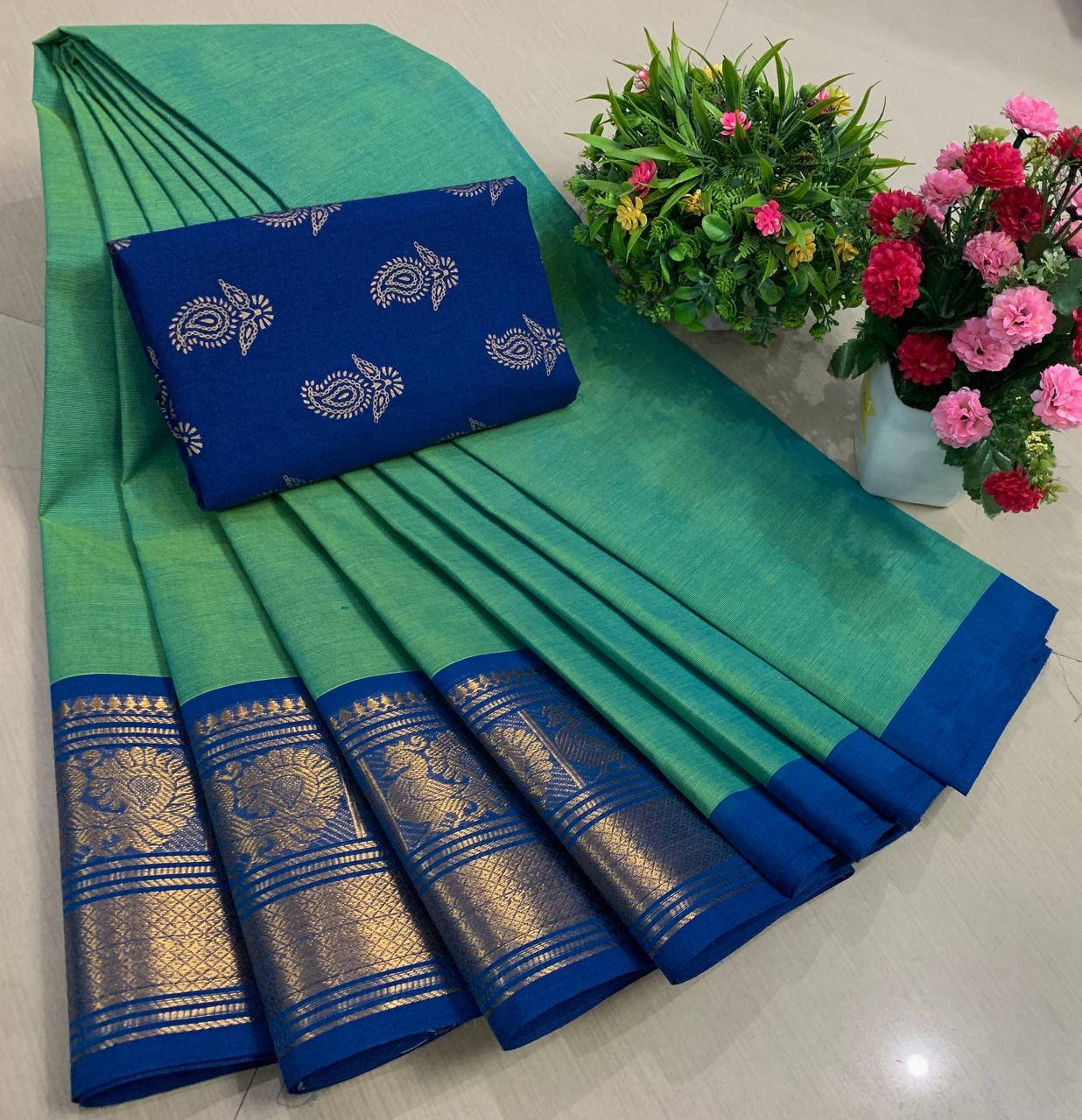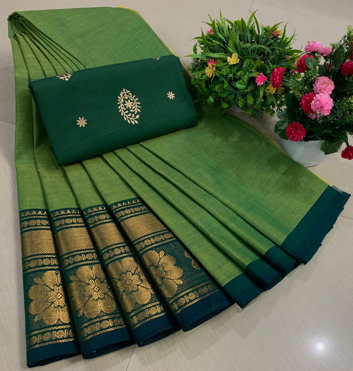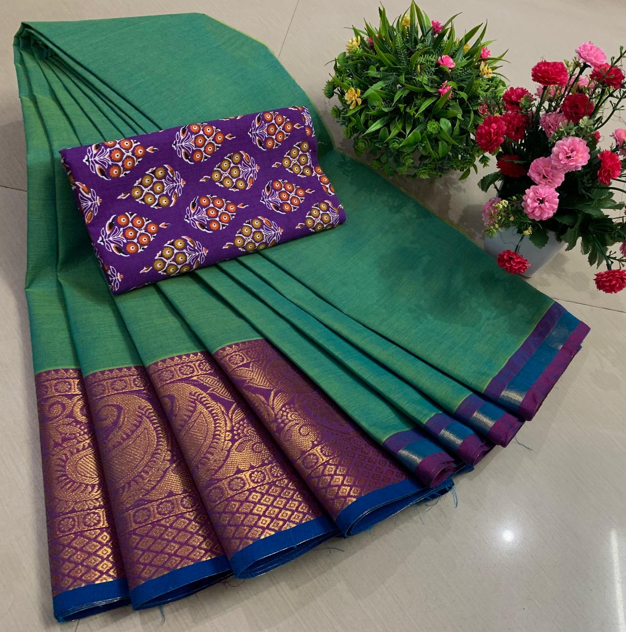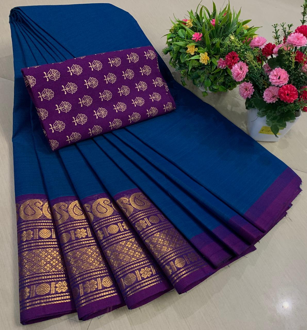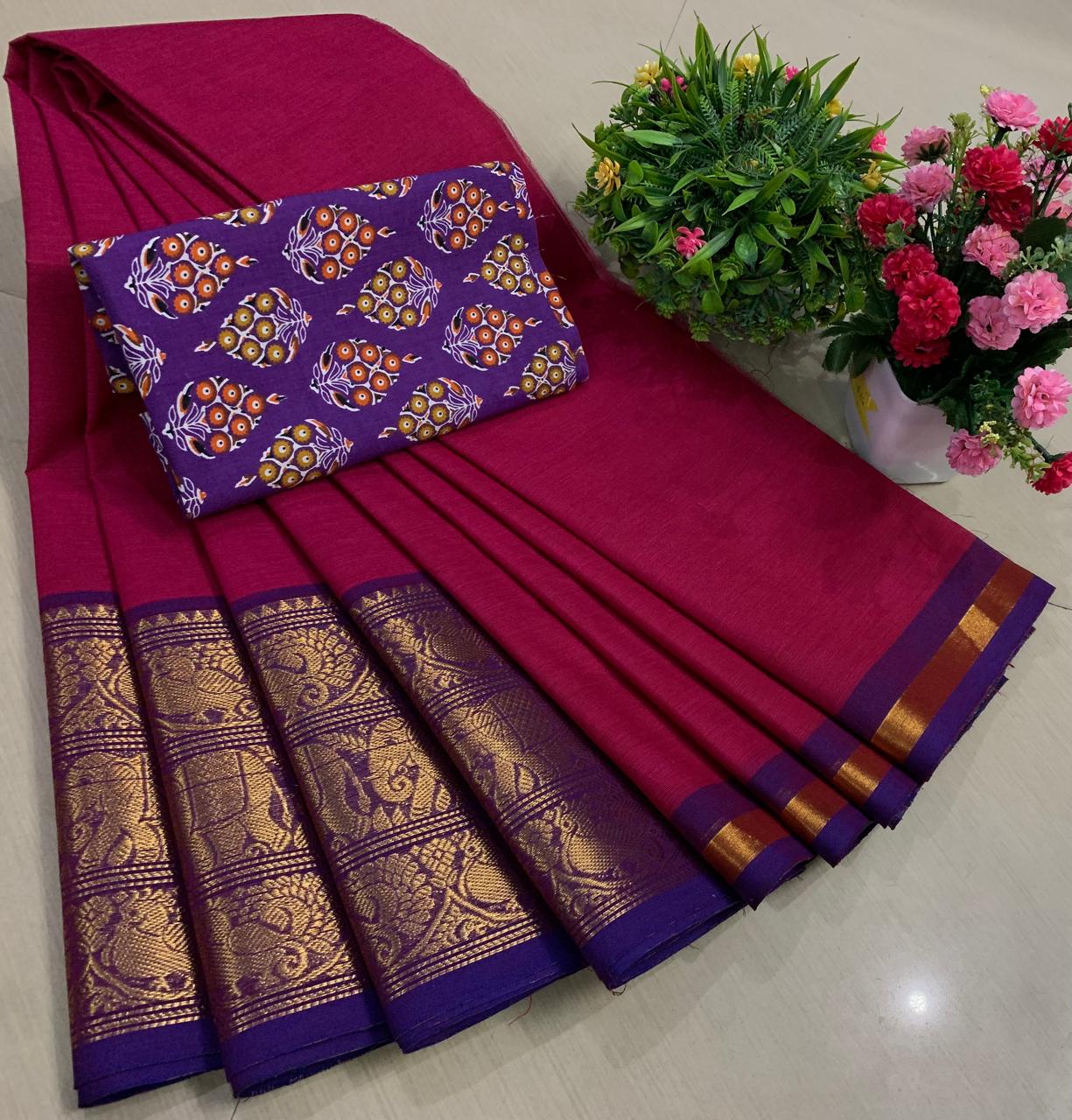 Experience the beauty of tradition with these elegant Chettinadu Pure Cotton Sarees with Kalamkari Blouse, designed to bring comfort, heritage, and style together. Crafted from 100% pure cotton with fine 80 count fabric, these sarees offer a soft, breathable, and lightweight feel, making them perfect for all-day wear in any season. The highlight of the saree is its bold and eye-catching big borders, which add a classic and rich look inspired by traditional Chettinadu weaving. The saree is paired with a beautiful Kalamkari blouse, featuring artistic prints that enhance the overall ethnic appeal and create a perfect contrast. With a generous length, it allows for versatile draping styles while maintaining elegance and ease. Ideal for daily wear, office use, casual outings, or cultural occasions, this saree blends simplicity with timeless charm. The natural cotton texture ensures comfort, while the traditional design makes it a graceful addition to your wardrobe. Whether styled in a classic or modern way, this Chettinadu cotton saree with Kalamkari blouse is a must-have for those who appreciate authentic Indian craftsmanship with a stylish touch.