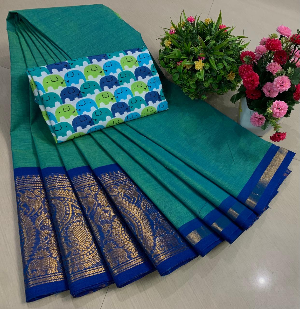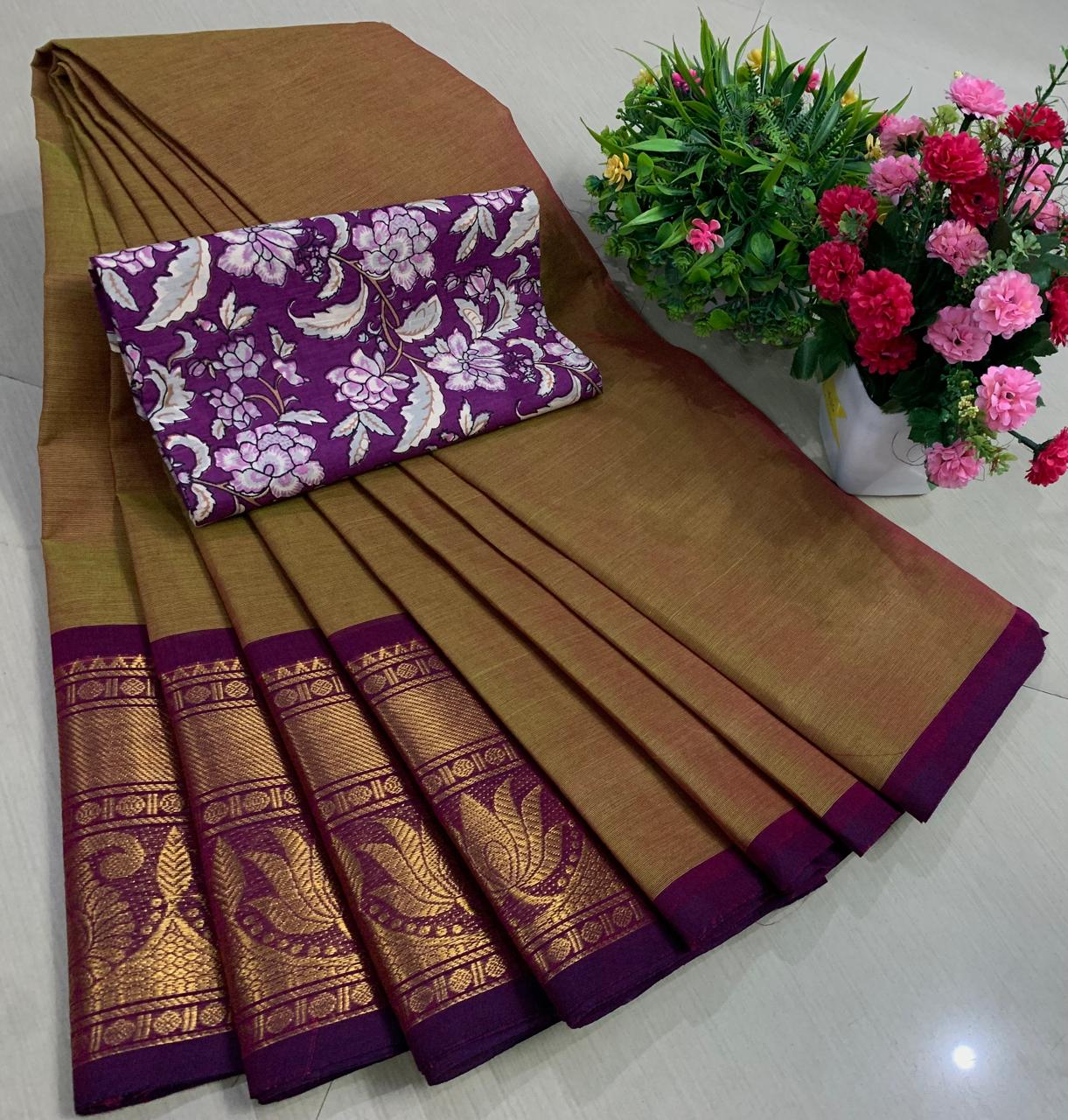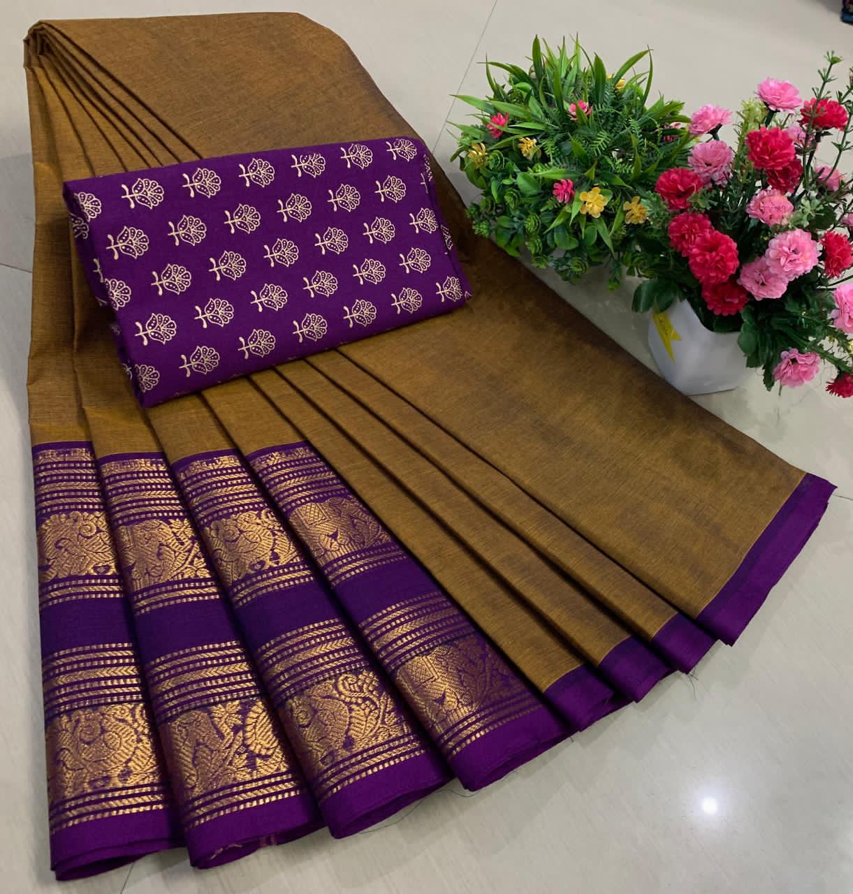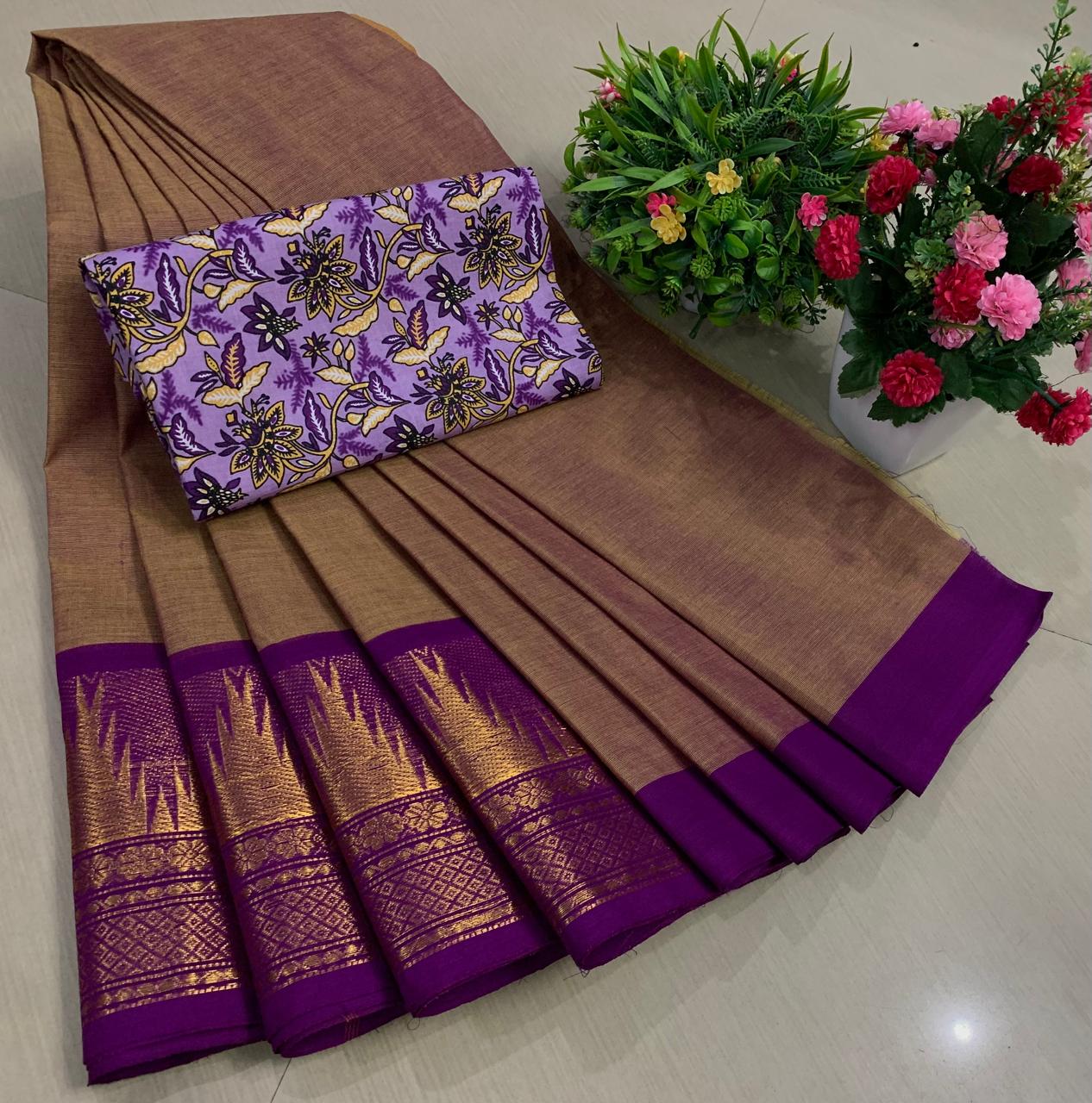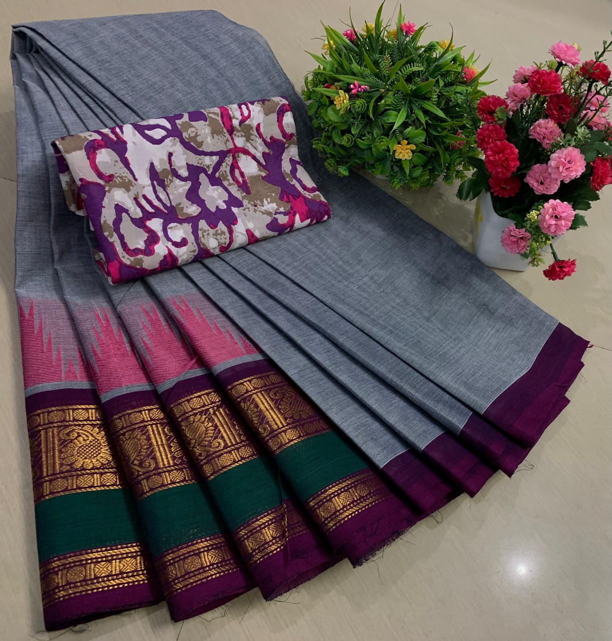 Experience the beauty of tradition with these elegant Chettinadu Pure Cotton Sarees with Kalamkari Blouse, designed to bring comfort, heritage, and style together. Crafted from 100% pure cotton with fine 80 count fabric, these sarees offer a soft, breathable, and lightweight feel, making them perfect for all-day wear in any season. The highlight of the saree is its bold and eye-catching big borders, which add a classic and rich look inspired by traditional Chettinadu weaving. The saree is paired with a beautiful Kalamkari blouse, featuring artistic prints that enhance the overall ethnic appeal and create a perfect contrast. With a generous length, it allows for versatile draping styles while maintaining elegance and ease. Ideal for daily wear, office use, casual outings, or cultural occasions, this saree blends simplicity with timeless charm. The natural cotton texture ensures comfort, while the traditional design makes it a graceful addition to your wardrobe. Whether styled in a classic or modern way, this Chettinadu cotton saree with Kalamkari blouse is a must-have for those who appreciate authentic Indian craftsmanship with a stylish touch.