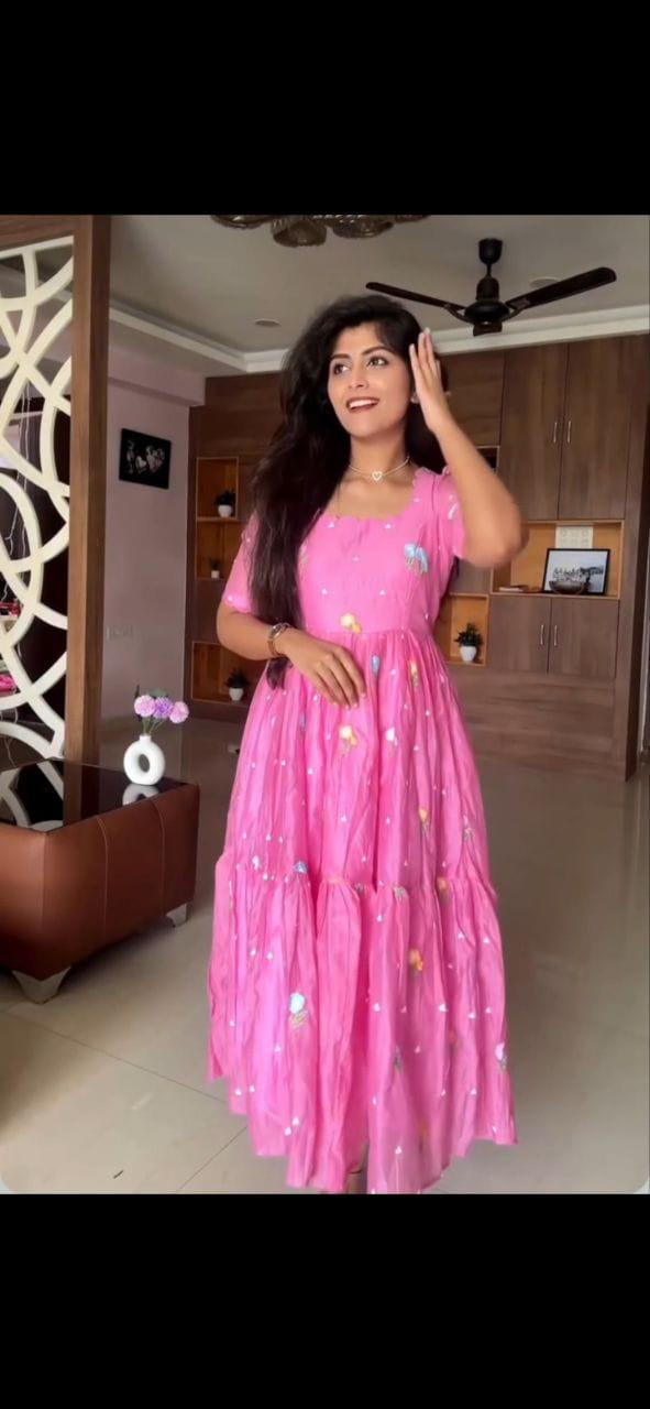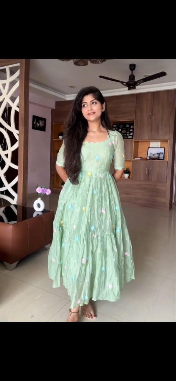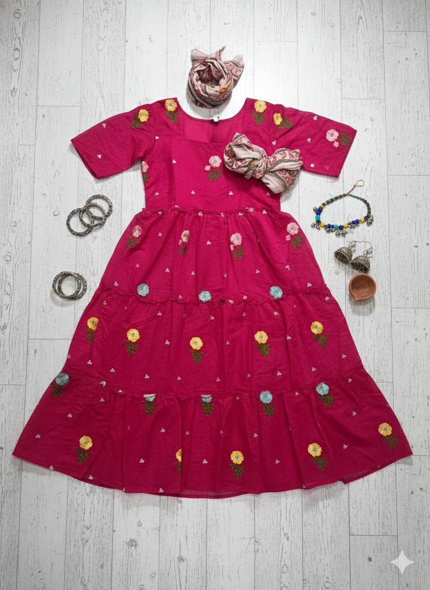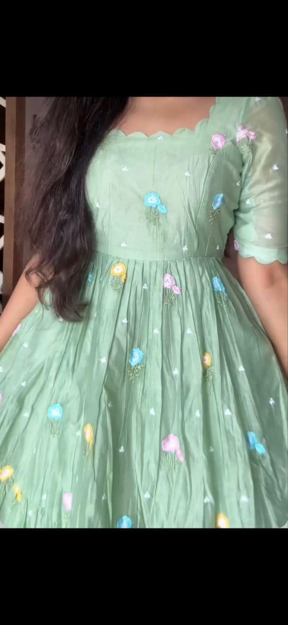 Celebrate the joy of dressing with this beautifully designed maxi gown, crafted to offer the perfect blend of comfort, elegance, and seasonal charm. Made from premium Chanderi cotton fabric, this outfit is soft, breathable, and lightweight, making it ideal for all-day wear, especially in warmer weather. The gown features stunning all-over daisy embroidery that adds a fresh and vibrant touch, complemented by uniquely designed necklines and stylish sleeve patterns that enhance its overall appeal. With a complete inner lining, it ensures a smooth and comfortable fit, giving you confidence and ease throughout the day. The flowy silhouette and graceful design make it perfect for casual outings, brunches, and small gatherings.