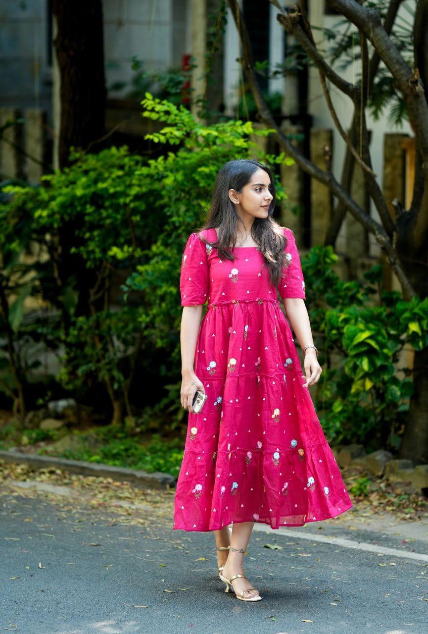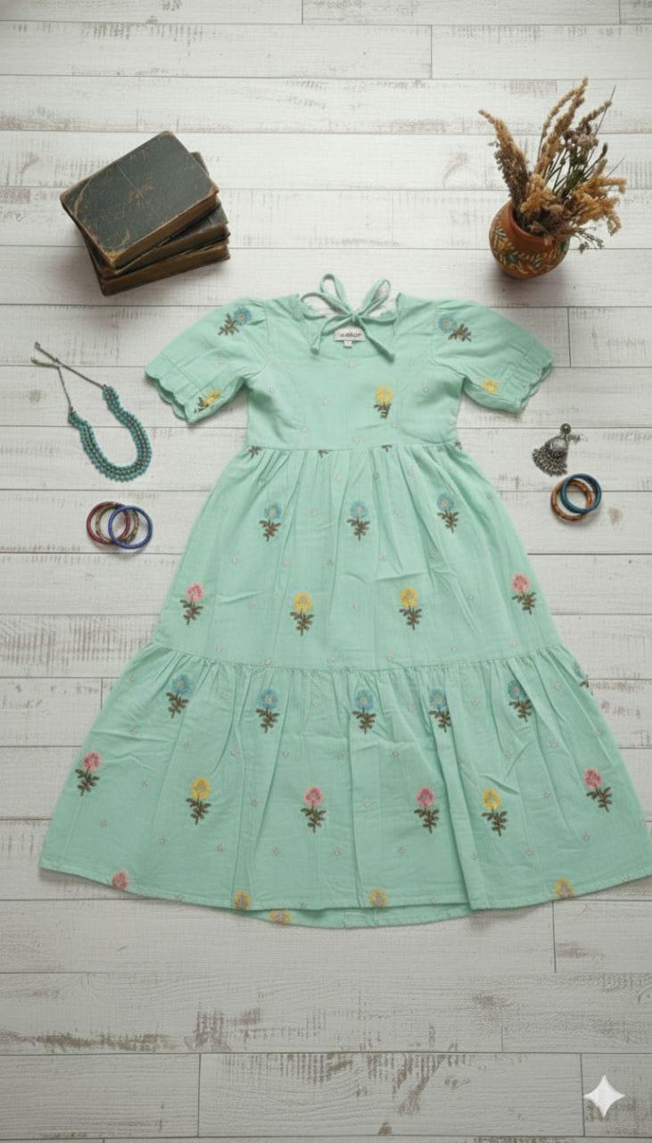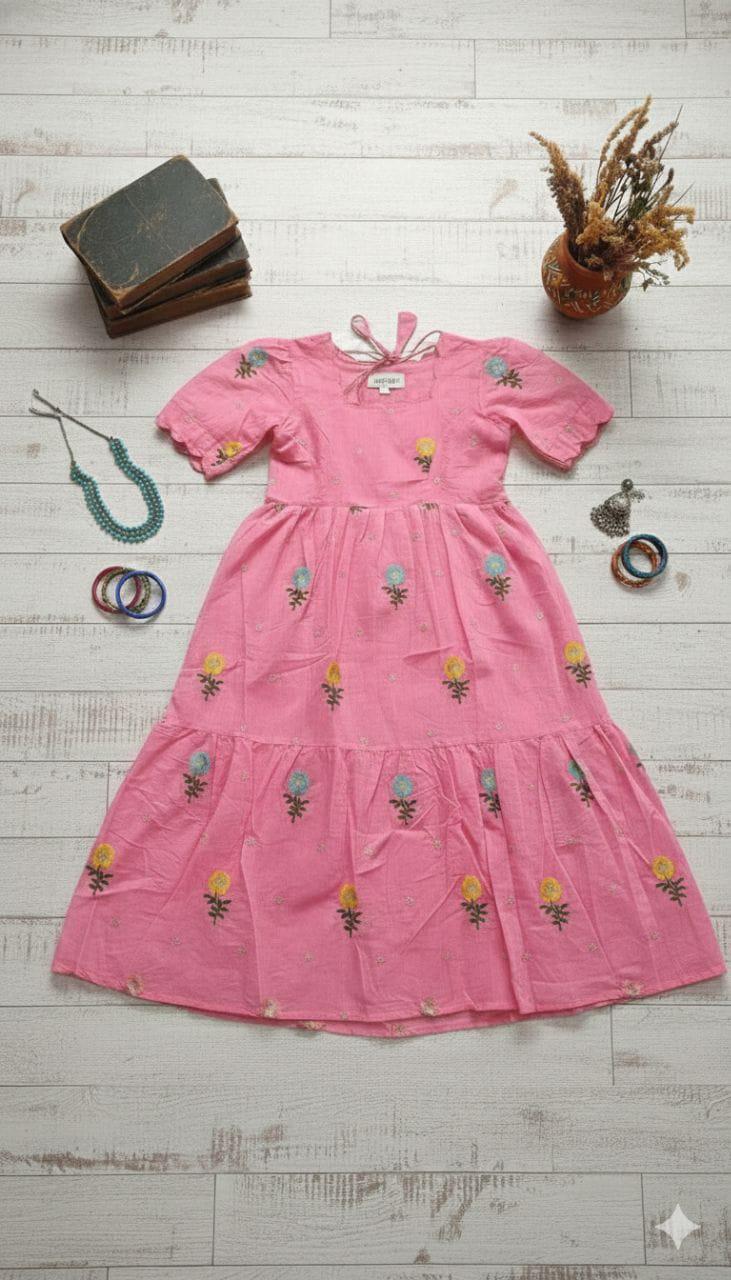 Celebrate the joy of dressing with this beautifully designed maxi gown, crafted to offer the perfect blend of comfort, elegance, and seasonal charm. Made from premium Chanderi cotton fabric, this outfit is soft, breathable, and lightweight, making it ideal for all-day wear, especially in warmer weather. The gown features stunning all-over daisy embroidery that adds a fresh and vibrant touch, complemented by uniquely designed necklines and stylish sleeve patterns that enhance its overall appeal. With a complete inner lining, it ensures a smooth and comfortable fit, giving you confidence and ease throughout the day. The flowy silhouette and graceful design make it perfect for casual outings, brunches, and small gatherings.