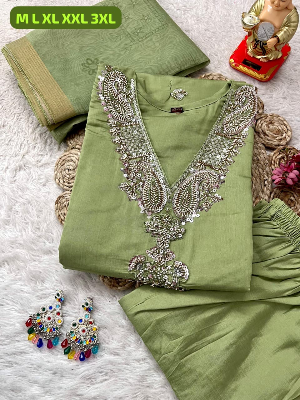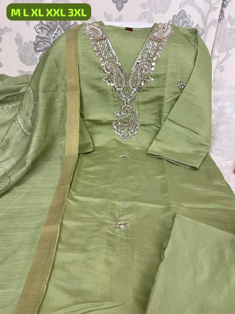 Step into elegance with this newly launched designer Kurti, pant, and dupatta set, crafted to bring a perfect blend of luxury, tradition, and modern style to your wardrobe. Made from premium Roman silk fabric, the kurti and pant offer a rich, smooth texture with a graceful fall, ensuring both comfort and a refined look for any occasion. The outfit is beautifully enhanced with intricate khatli hand work spread across the kurti, adding a touch of artisanal craftsmanship and sophistication. Complementing the set is a stunning heavy Chanderi dupatta featuring elegant digital prints and stylish latkan detailing, which elevates the overall appeal with a festive and designer finish. The addition of a soft cotton inner ensures comfortable wear throughout the day, making it suitable for long hours during functions, celebrations, or special gatherings. Designed to flatter a variety of body types, this fully coordinated set offers a perfect balance of style and practicality. With its premium fabric quality, fine stitching, and attention to detail, this ensemble delivers a showroom-like experience, making it an ideal choice for those who love to dress in elegant, statement-making ethnic wear.