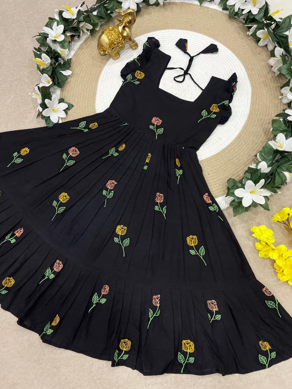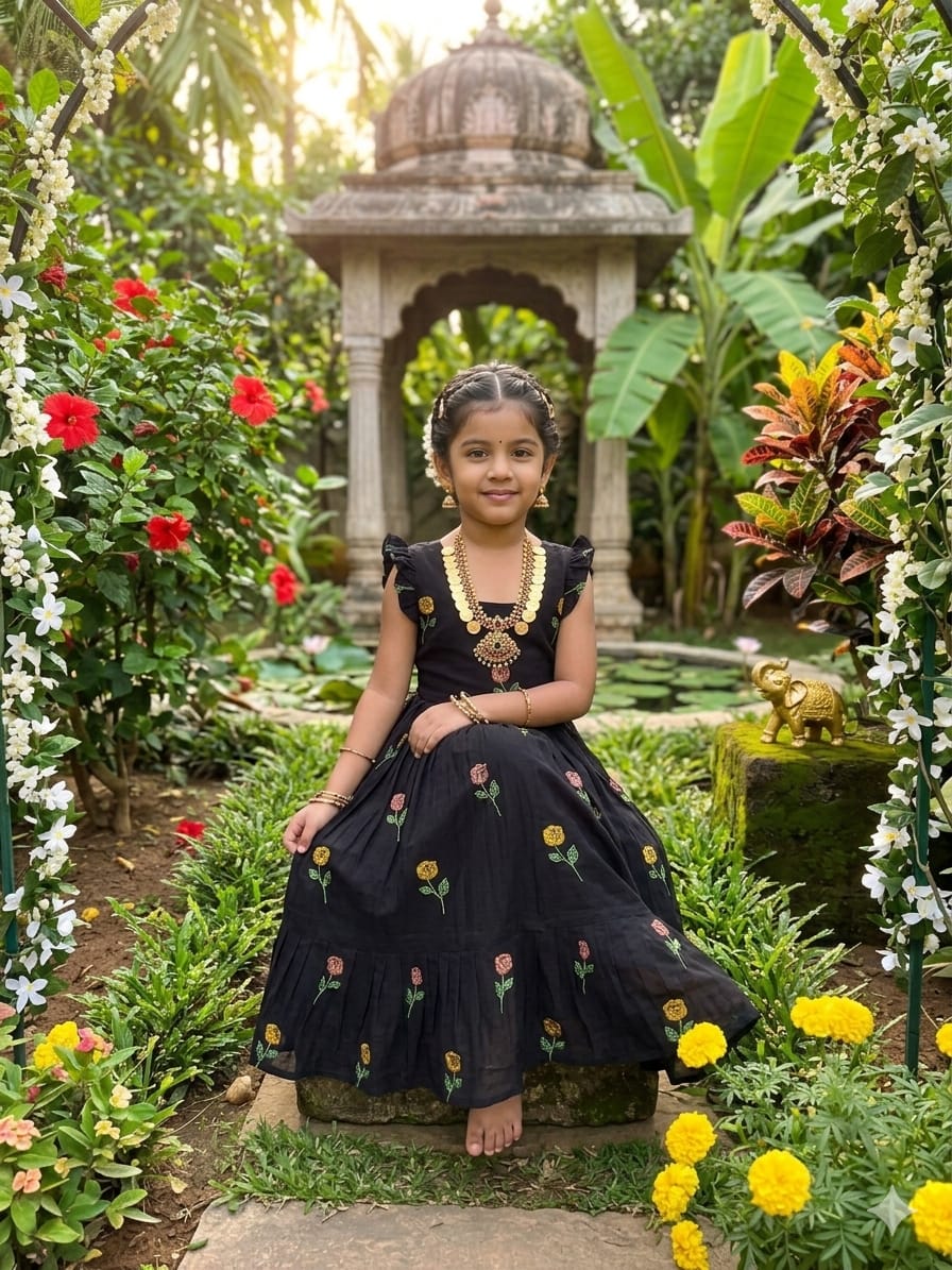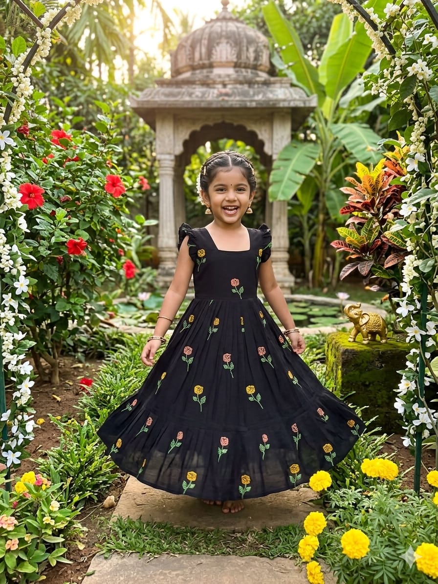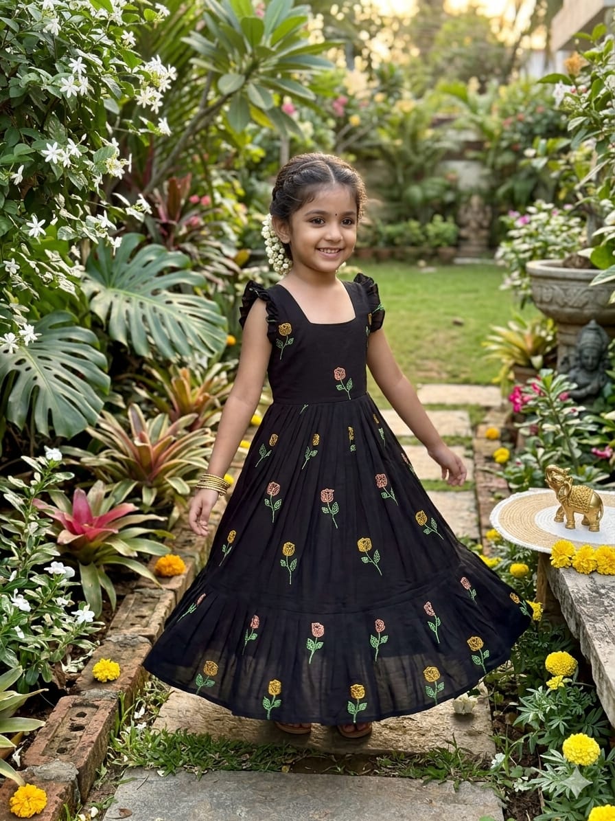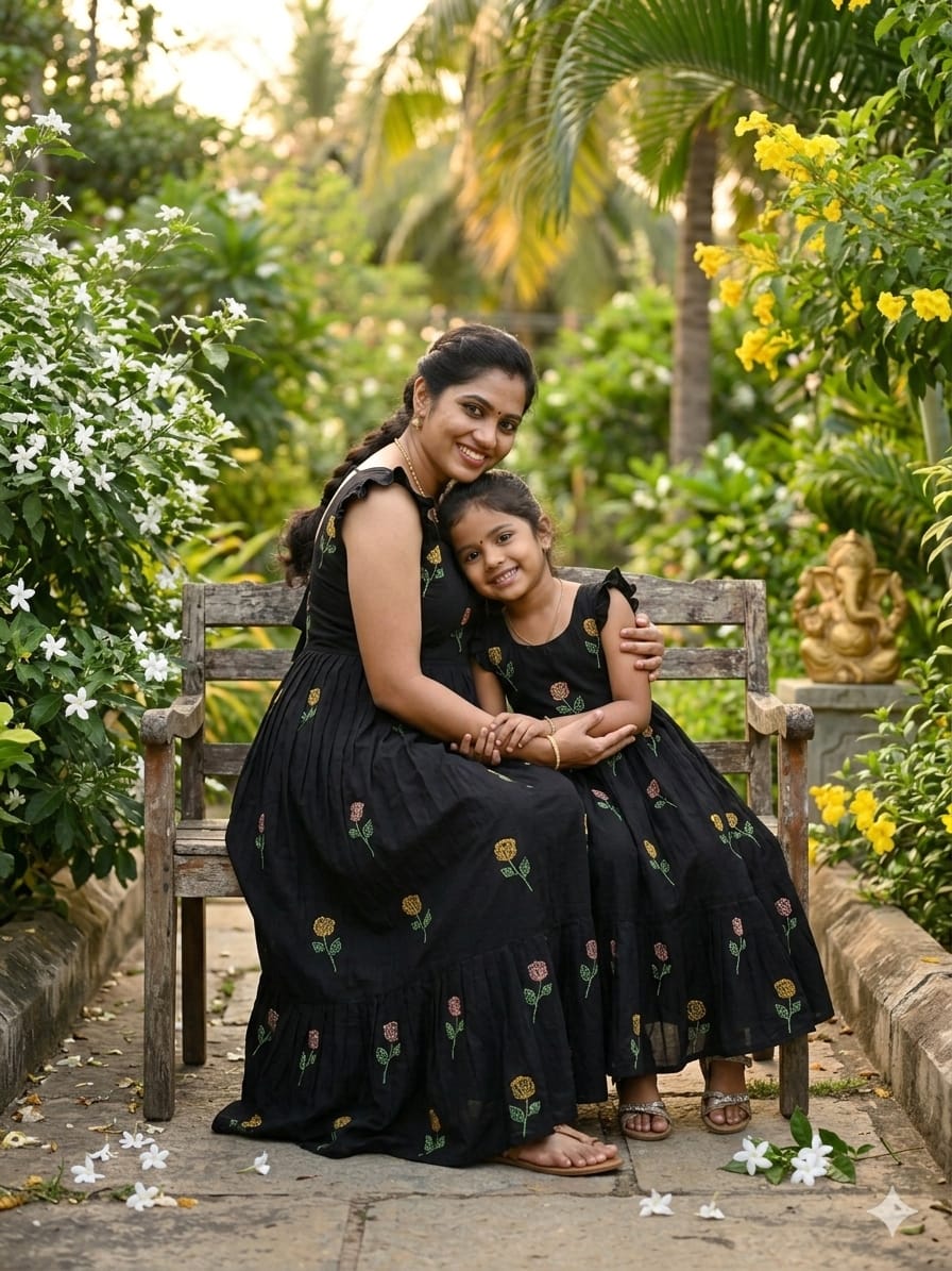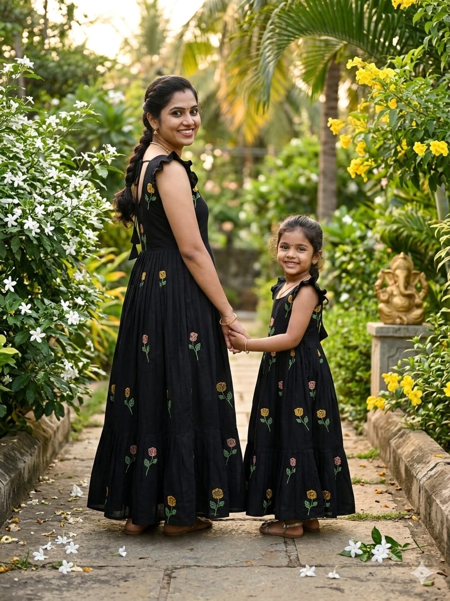 Celebrate love, style, and togetherness with this beautiful Black Flower Mother–Daughter Combo Gown Set, designed to create a charming and memorable matching look for special occasions. Crafted from comfortable CP cotton fabric, these gowns offer a soft, breathable feel that ensures all-day comfort while maintaining a graceful and elegant appearance. The rich black base beautifully highlights the delicate floral embroidery work, adding a touch of sophistication and timeless beauty to the overall design. Each gown is thoughtfully detailed with elegant embroidery that enhances the outfit with subtle texture and artistic charm, making it perfect for mothers and daughters who love coordinated fashion with a stylish ethnic touch. The gowns also include a smooth micro-cotton inner lining that provides extra comfort, a neat finish, and a flattering fit, ensuring the outfit feels as good as it looks. Designed with a graceful silhouette, the flowy structure of the gown adds a lovely movement while maintaining a classy and refined style. This adorable matching set is ideal for special celebrations such as weddings, festive gatherings, family functions, Valentine’s celebrations, photoshoots, birthday parties, and memorable cultural events. The coordinated design allows mothers and daughters to share a stylish moment together while creating heartwarming memories in beautifully matching outfits. With its premium cotton comfort, elegant embroidery work, and charming coordinated design, this black floral mother-daughter combo gown set perfectly blends fashion, comfort, and family bonding into one stunning festive outfit.