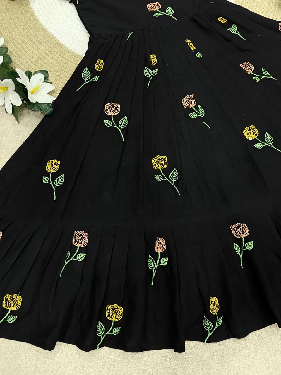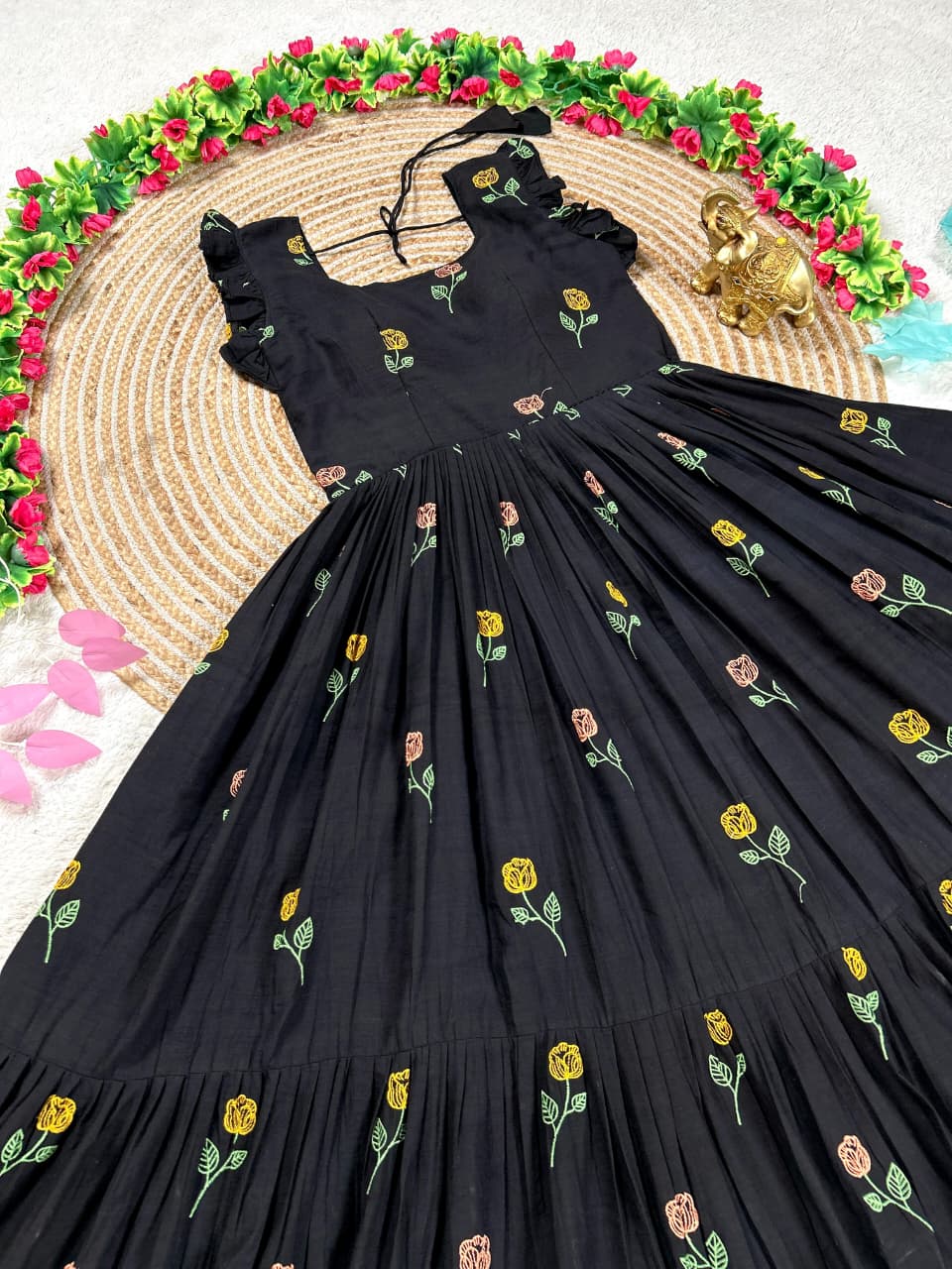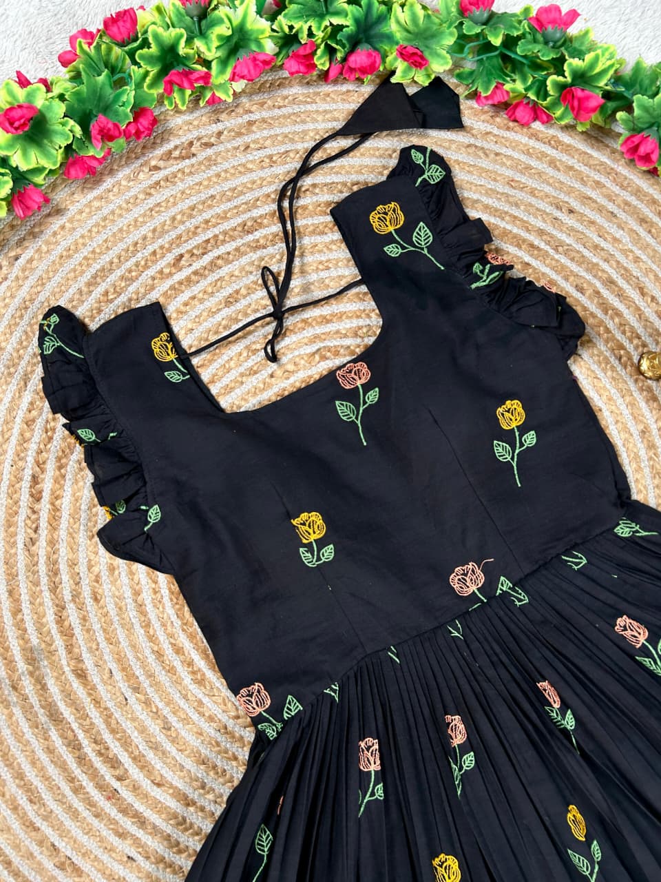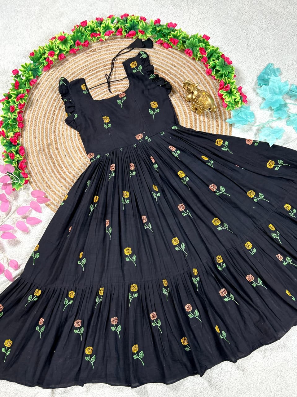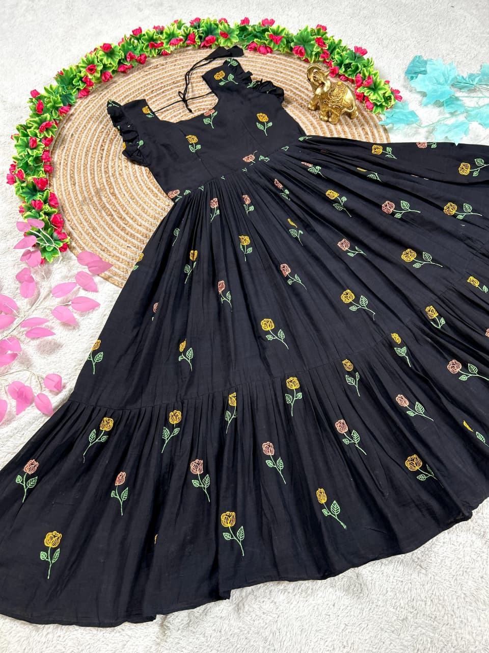 Celebrate love, style, and togetherness with this beautiful Black Flower Mother–Daughter Combo Gown Set, designed to create a charming and memorable matching look for special occasions. Crafted from comfortable CP cotton fabric, these gowns offer a soft, breathable feel that ensures all-day comfort while maintaining a graceful and elegant appearance. The rich black base beautifully highlights the delicate floral embroidery work, adding a touch of sophistication and timeless beauty to the overall design. Each gown is thoughtfully detailed with elegant embroidery that enhances the outfit with subtle texture and artistic charm, making it perfect for mothers and daughters who love coordinated fashion with a stylish ethnic touch. The gowns also include a smooth micro-cotton inner lining that provides extra comfort, a neat finish, and a flattering fit, ensuring the outfit feels as good as it looks. Designed with a graceful silhouette, the flowy structure of the gown adds a lovely movement while maintaining a classy and refined style. This adorable matching set is ideal for special celebrations such as weddings, festive gatherings, family functions, Valentine’s celebrations, photoshoots, birthday parties, and memorable cultural events. The coordinated design allows mothers and daughters to share a stylish moment together while creating heartwarming memories in beautifully matching outfits. With its premium cotton comfort, elegant embroidery work, and charming coordinated design, this black floral mother-daughter combo gown set perfectly blends fashion, comfort, and family bonding into one stunning festive outfit.