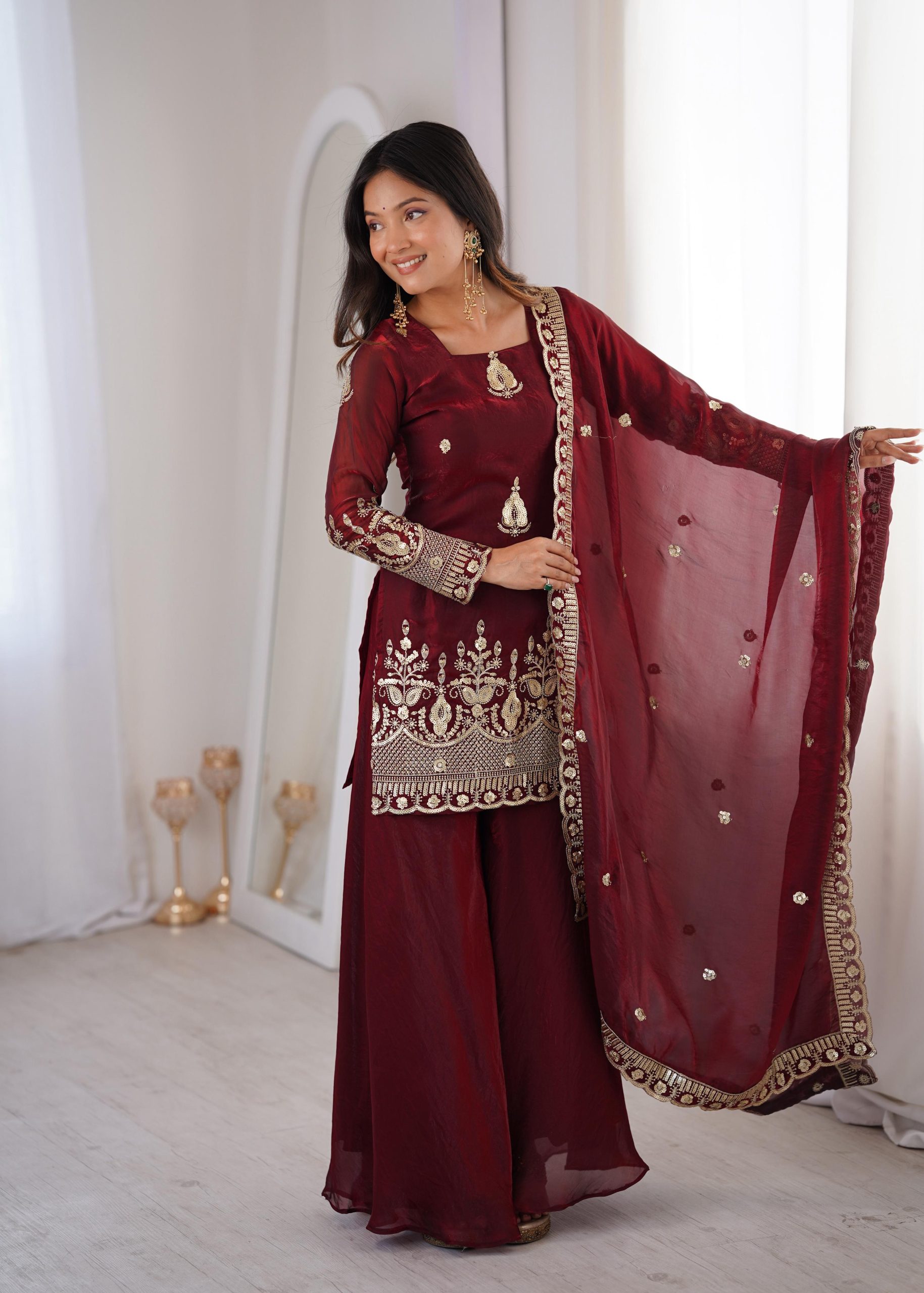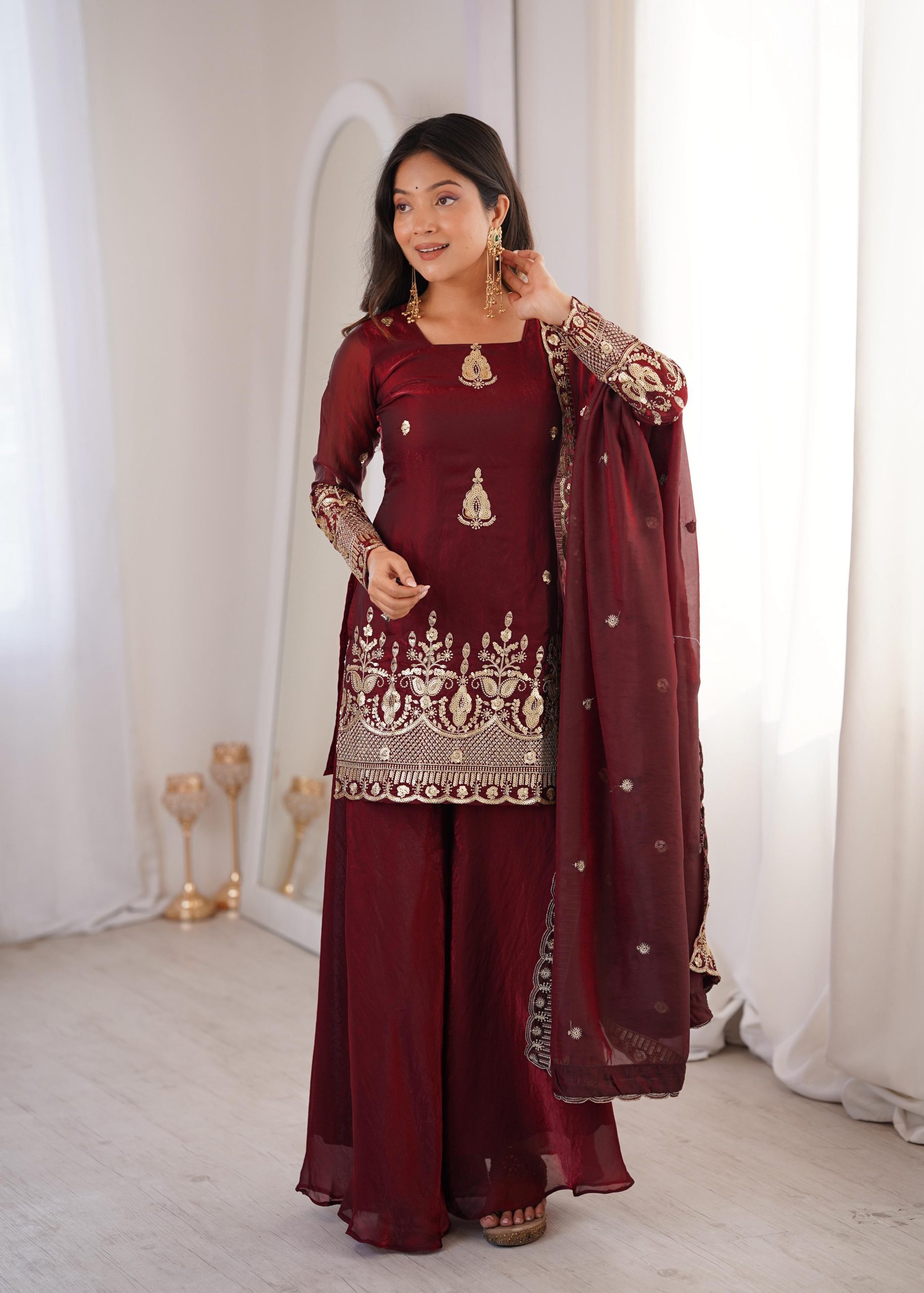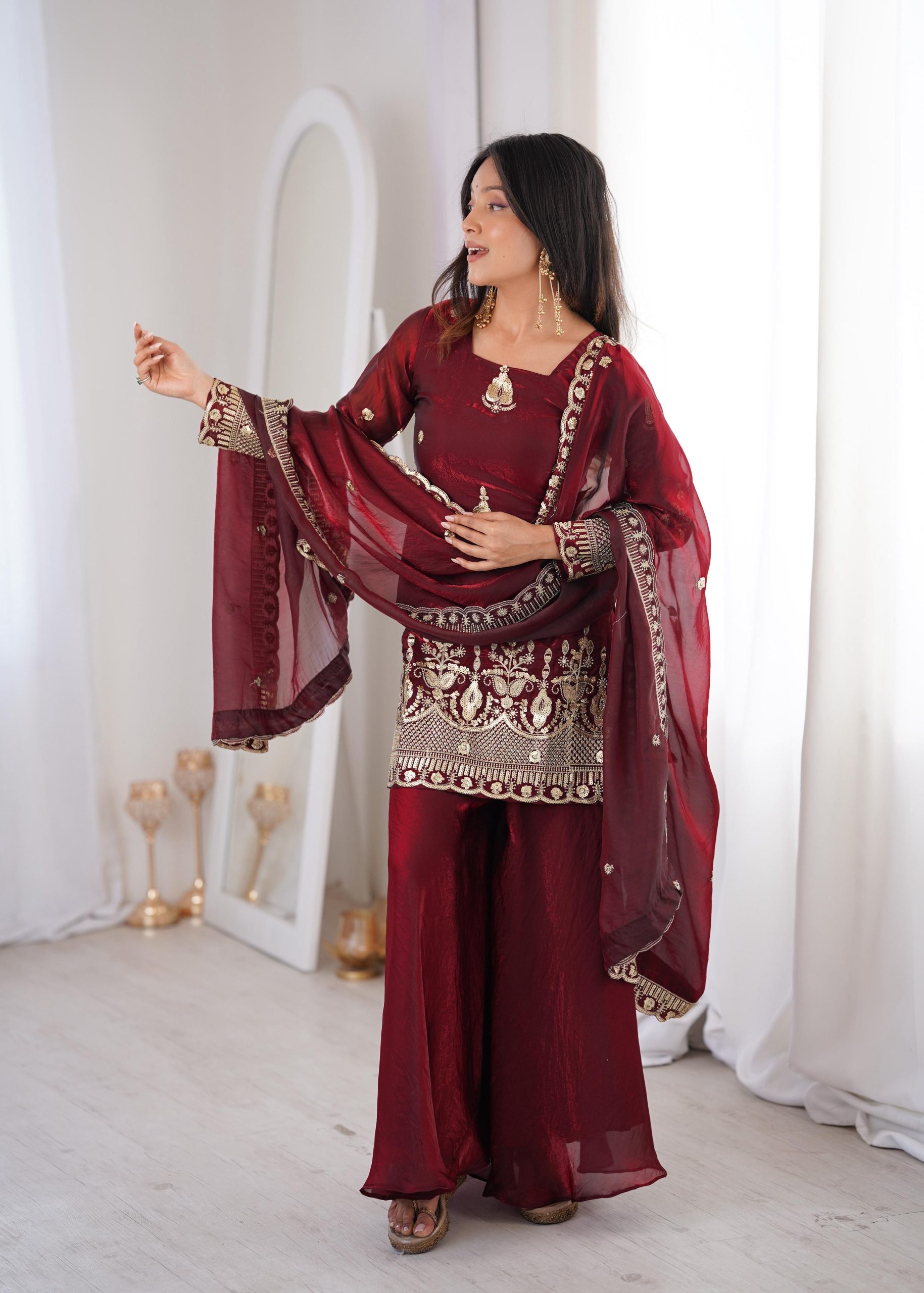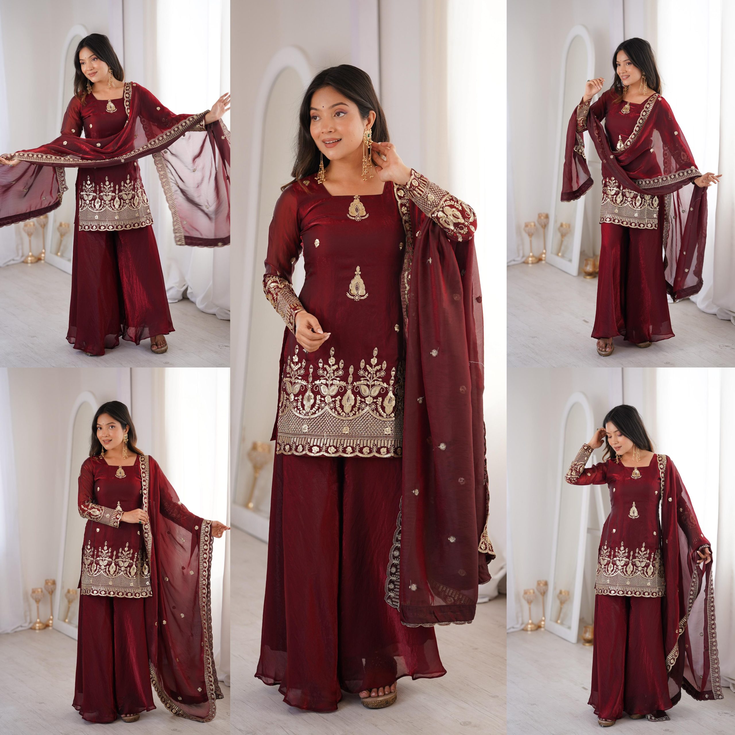 Paired with a stylish sharara plazzo made from Fendy silk with full flare, it provides a graceful and flowy look with a length of around 40–41 inches. The set is completed with a matching Fendy silk dupatta, enhanced with embroidery sequence work and an elegant lace border for a rich and festive finish. With a total weight of approximately 850 grams, this outfit balances premium quality with comfort, making it perfect for weddings, festive occasions, and special celebrations.