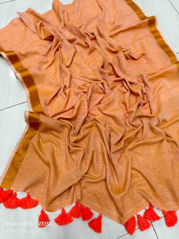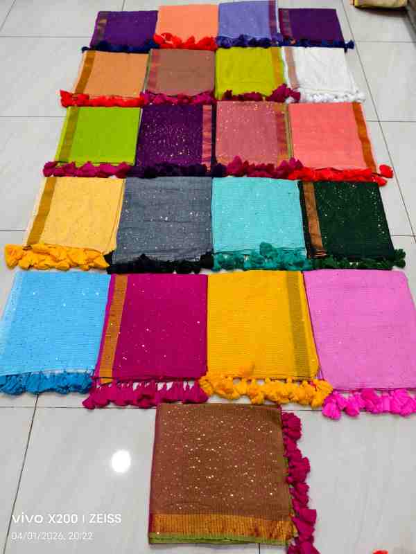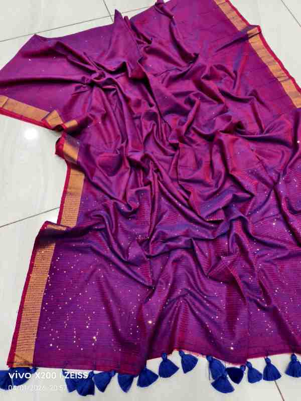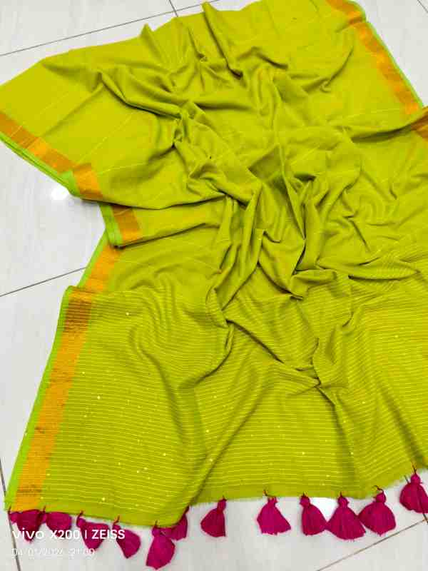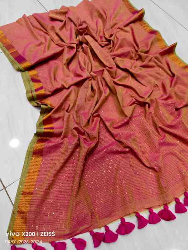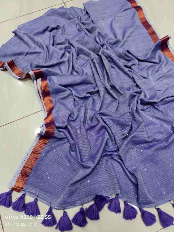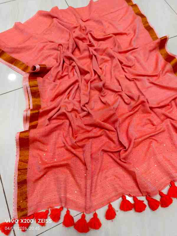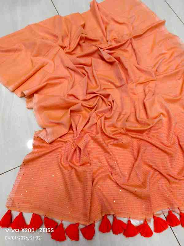 Add a touch of elegance to your wardrobe with this handloom sequence mul cotton saree, designed for comfort and graceful styling. Crafted from soft mul cotton fabric, the saree offers a lightweight and breathable feel, making it perfect for all-day wear in any season. The subtle sequence detailing enhances its charm, while the antique zari border adds a traditional and refined finish, giving it a perfect balance of simplicity and sophistication.
