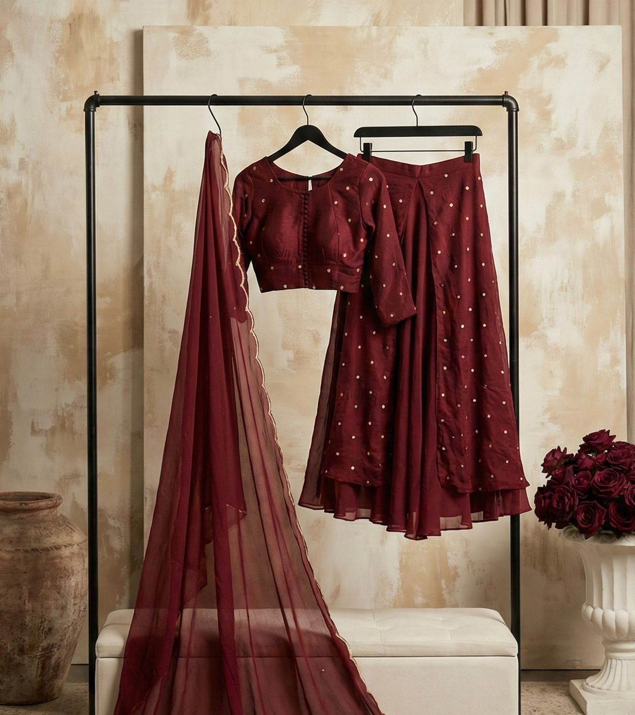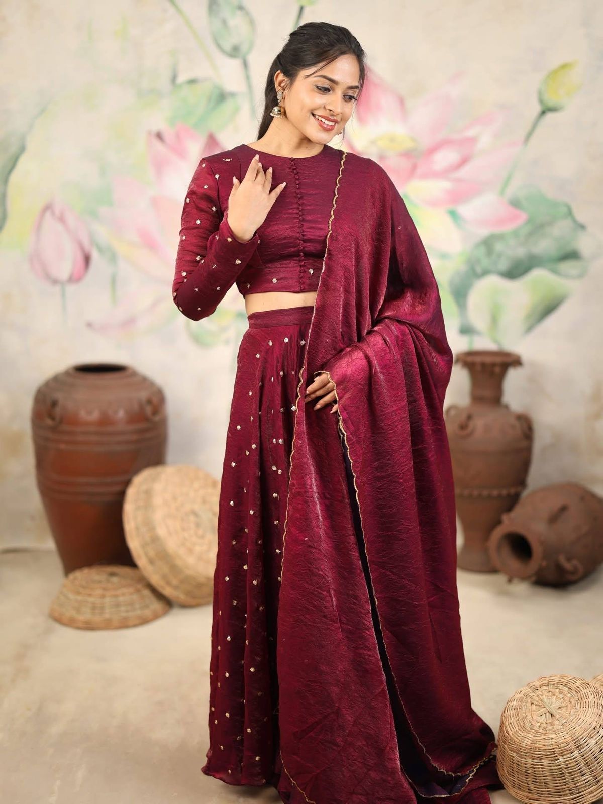 The Ishana Lehenga is a breathtaking blend of regal charm and modern elegance, thoughtfully crafted to make every festive moment unforgettable. Designed in luxurious Rangoli crush fabric, this lehenga drapes beautifully with a rich, graceful fall, enhanced by delicate all-over embroidery that adds a soft shimmer without overpowering the look. The voluminous 4-meter flare, supported by dual layers and a finely finished canvas patta, creates a structured yet fluid silhouette that moves effortlessly with you. Complementing the lehenga is a royal-patterned blouse, tailored with refined detailing to elevate the ensemble’s majestic appeal, while the matching dupatta, finished with elegant cut-work borders and a generous length, adds a touch of finesse and flow. With its deep, elegant hue, intricate craftsmanship, and timeless silhouette, this lehenga set is perfect for festive celebrations, Eid gatherings, weddings, and traditional occasions, offering a look that feels luxurious, confident, and beautifully memorable every time you wear it.