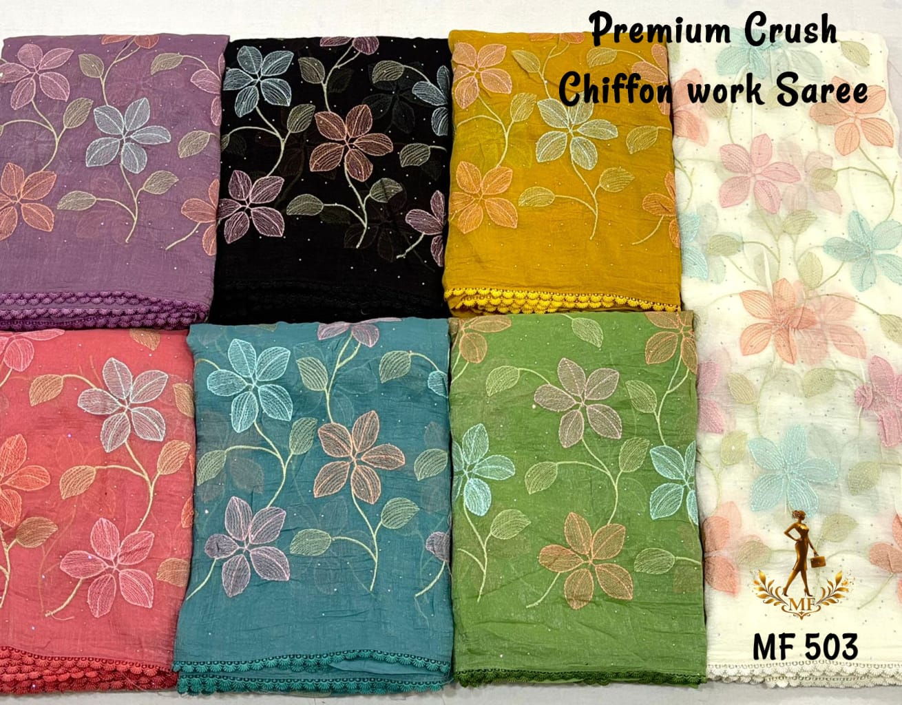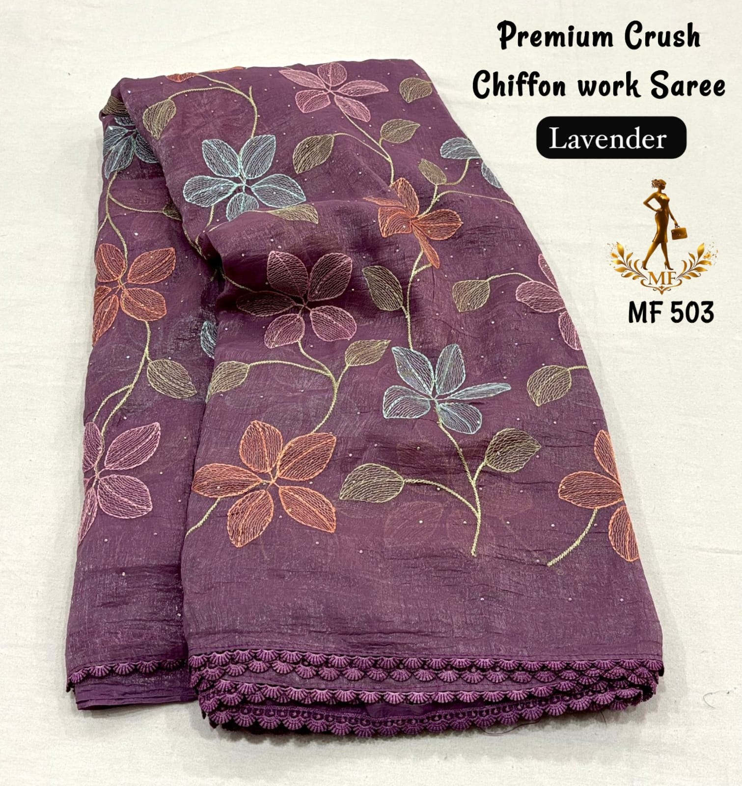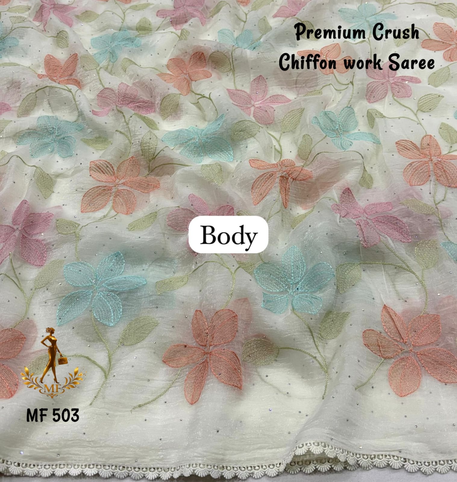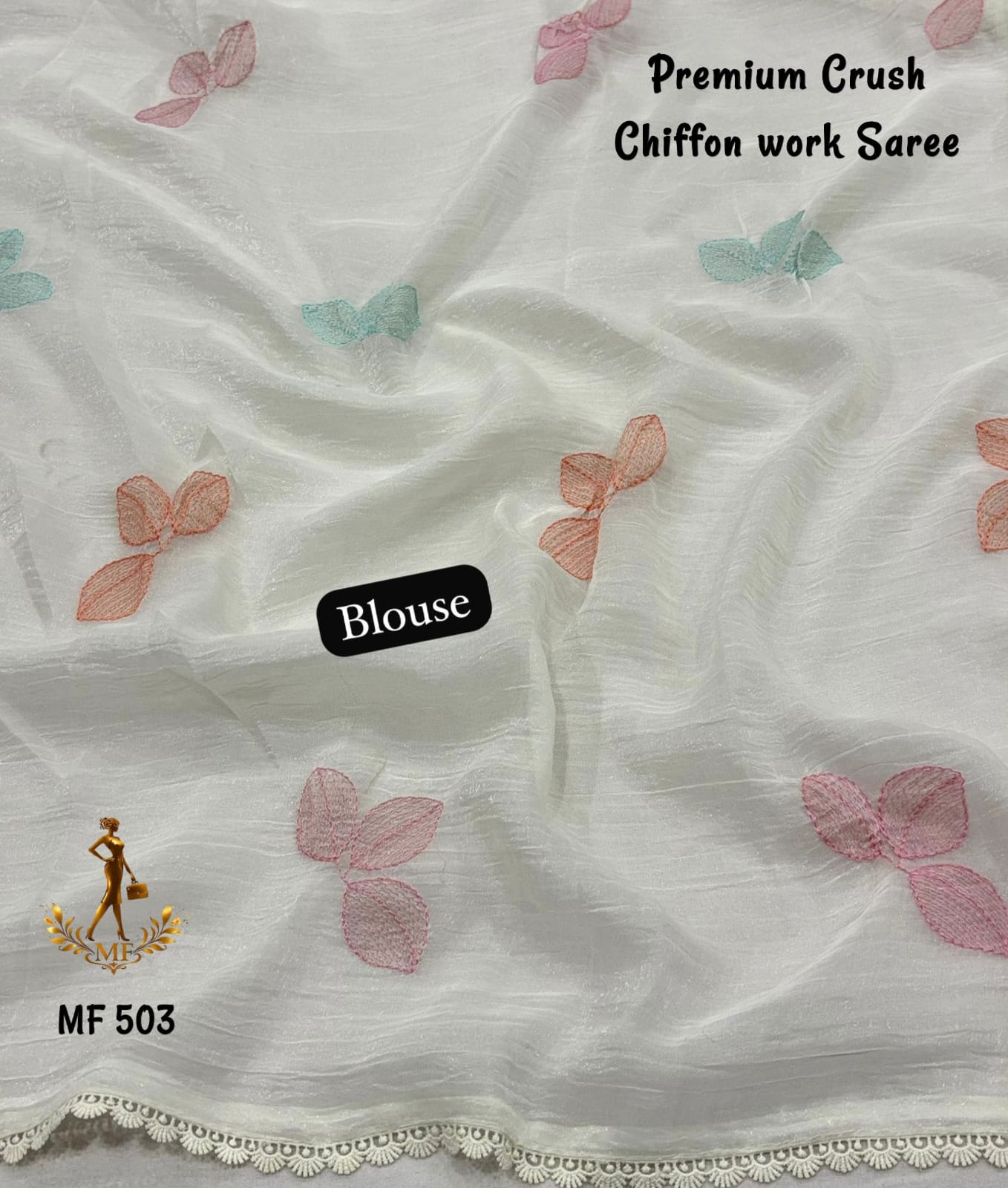 Elevate your everyday elegance with this stunning Premium Crush Chiffon Saree, thoughtfully designed for both office and college wear with a touch of sophistication. Crafted from soft ivory crush chiffon fabric, this saree offers a lightweight, airy, and flowy drape that ensures all-day comfort while maintaining a graceful silhouette. The highlight of the saree is its colorful thread embroidery spread all over, adding a vibrant yet subtle charm that enhances its modern appeal. The stylish cut work border gives it a refined and designer finish, making it suitable for both casual and semi-formal occasions. Paired with a running heavy blouse piece, it completes the look with a coordinated and elegant touch. Designed with premium quality and fine craftsmanship, this saree is perfect for those who want a balance of comfort, style, and versatility. Whether worn to work, college, or casual outings, it offers effortless styling with a polished look. With its soft texture, beautiful detailing, and contemporary design, this chiffon saree is a must-have addition to your wardrobe for a classy and confident appearance.