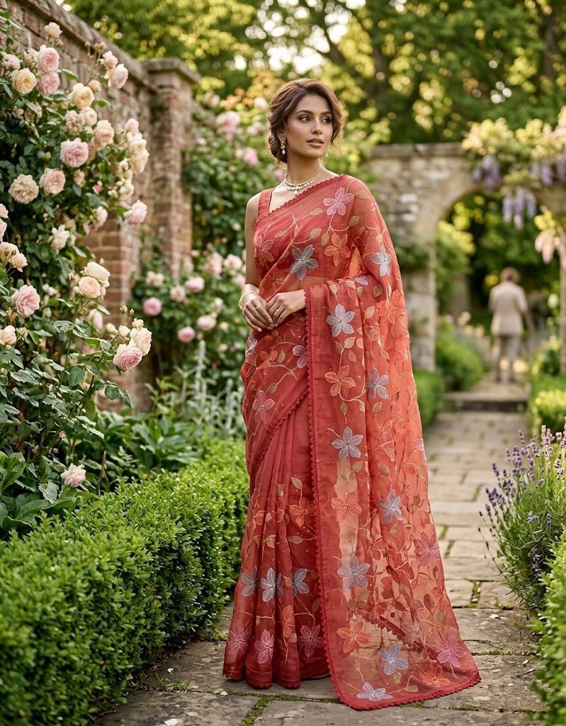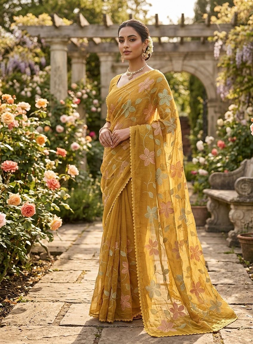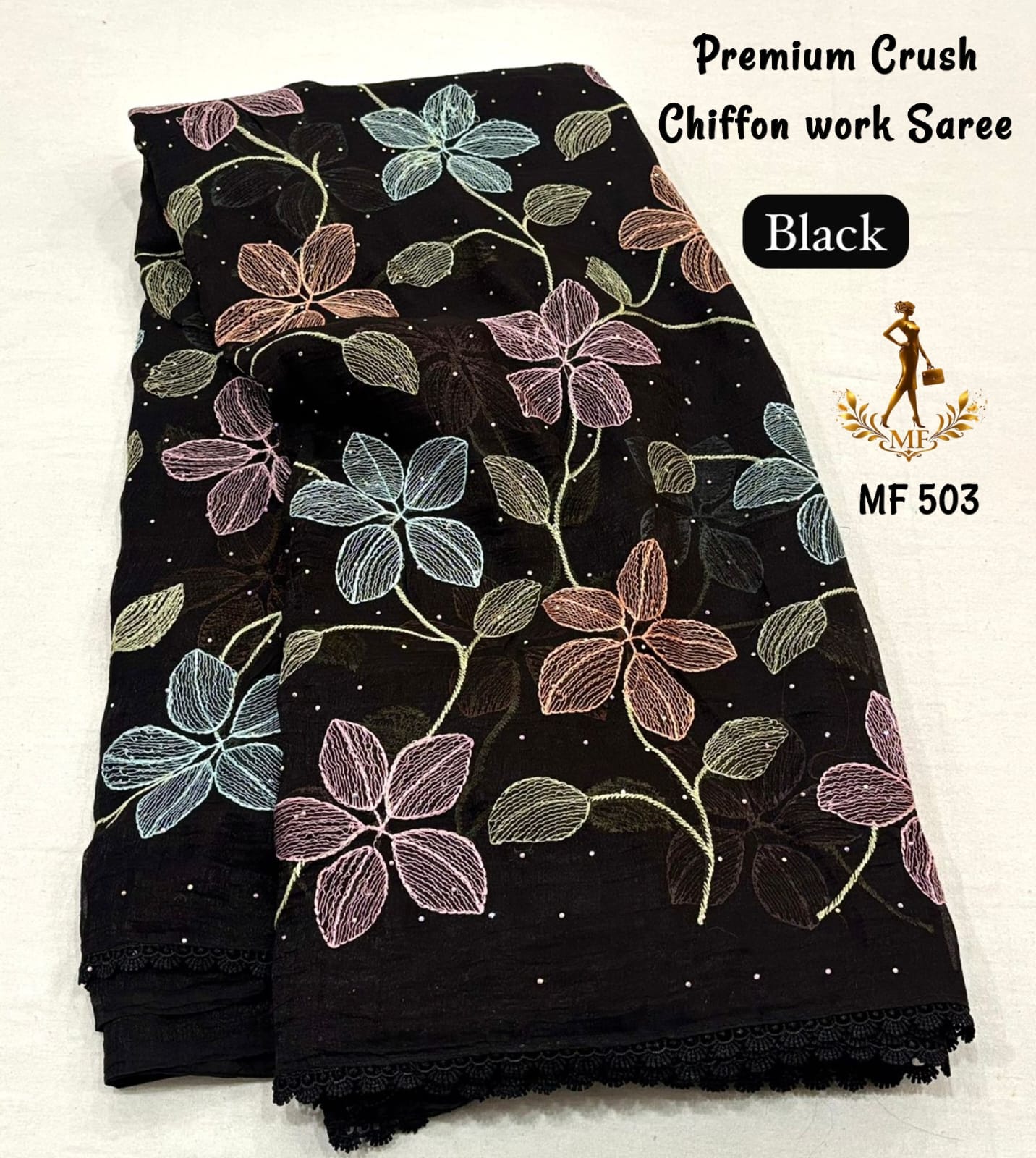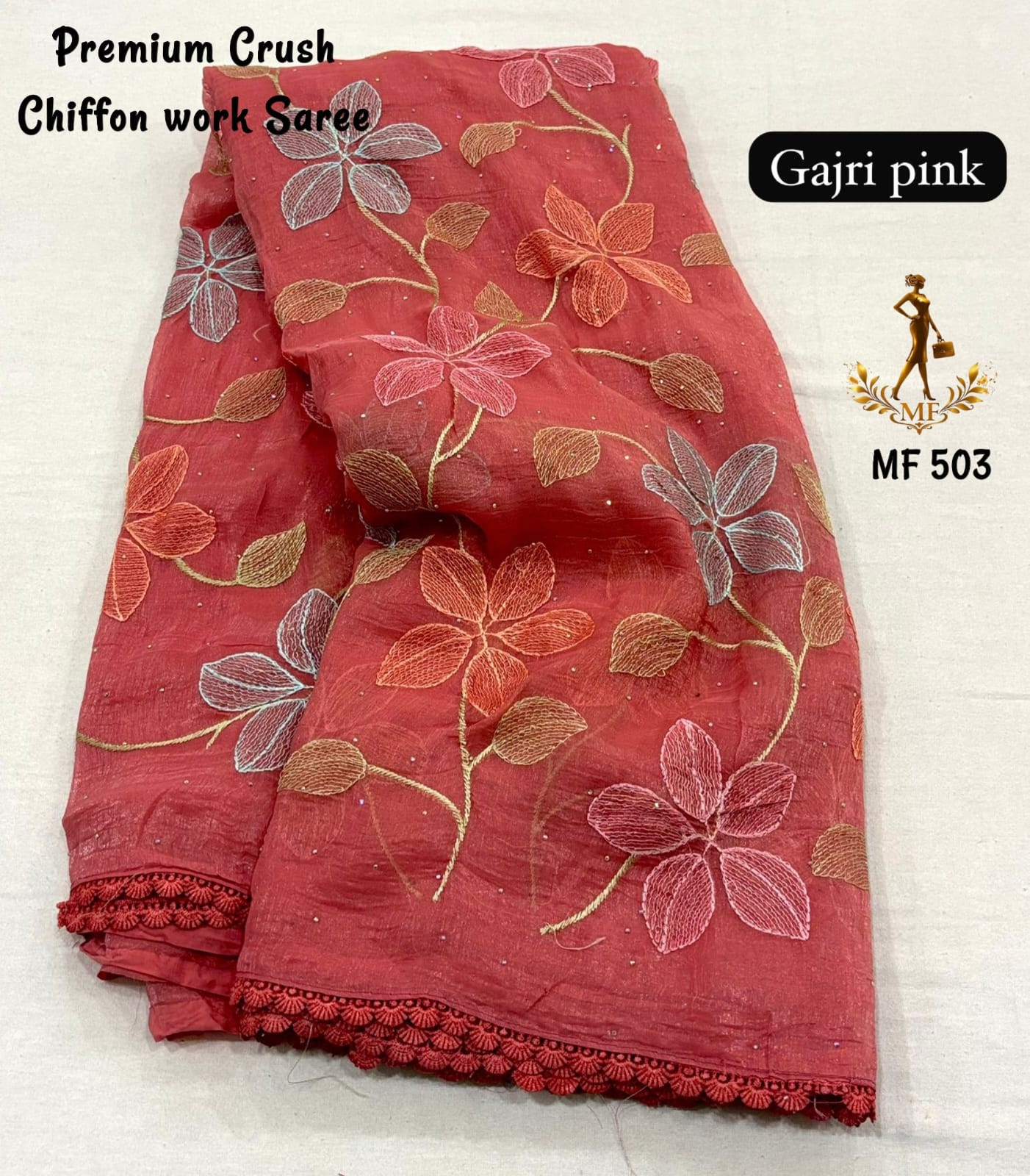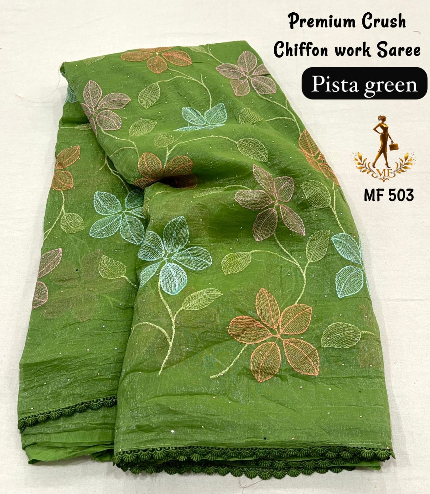 Elevate your everyday elegance with this stunning Premium Crush Chiffon Saree, thoughtfully designed for both office and college wear with a touch of sophistication. Crafted from soft ivory crush chiffon fabric, this saree offers a lightweight, airy, and flowy drape that ensures all-day comfort while maintaining a graceful silhouette. The highlight of the saree is its colorful thread embroidery spread all over, adding a vibrant yet subtle charm that enhances its modern appeal. The stylish cut work border gives it a refined and designer finish, making it suitable for both casual and semi-formal occasions. Paired with a running heavy blouse piece, it completes the look with a coordinated and elegant touch. Designed with premium quality and fine craftsmanship, this saree is perfect for those who want a balance of comfort, style, and versatility. Whether worn to work, college, or casual outings, it offers effortless styling with a polished look. With its soft texture, beautiful detailing, and contemporary design, this chiffon saree is a must-have addition to your wardrobe for a classy and confident appearance.