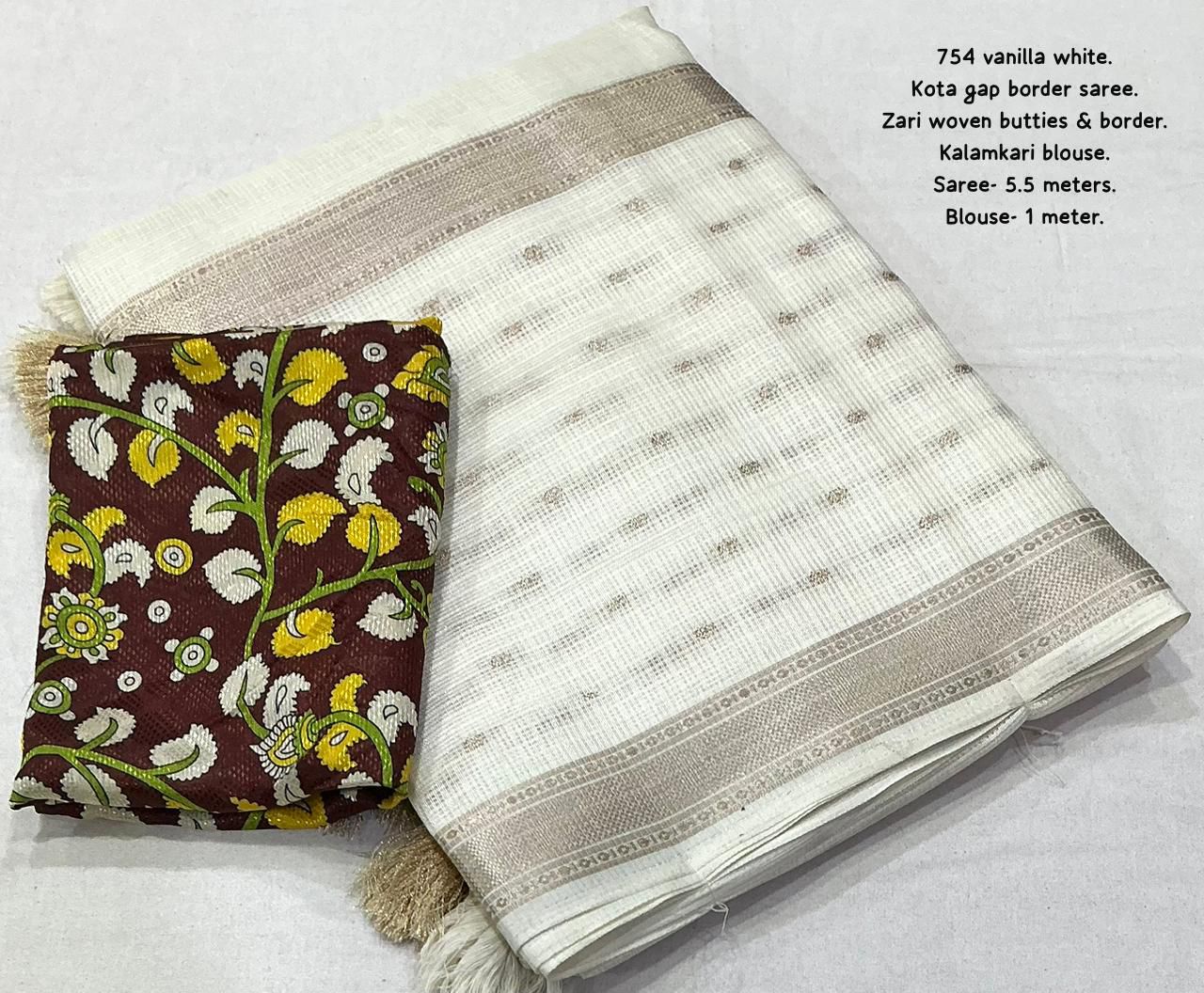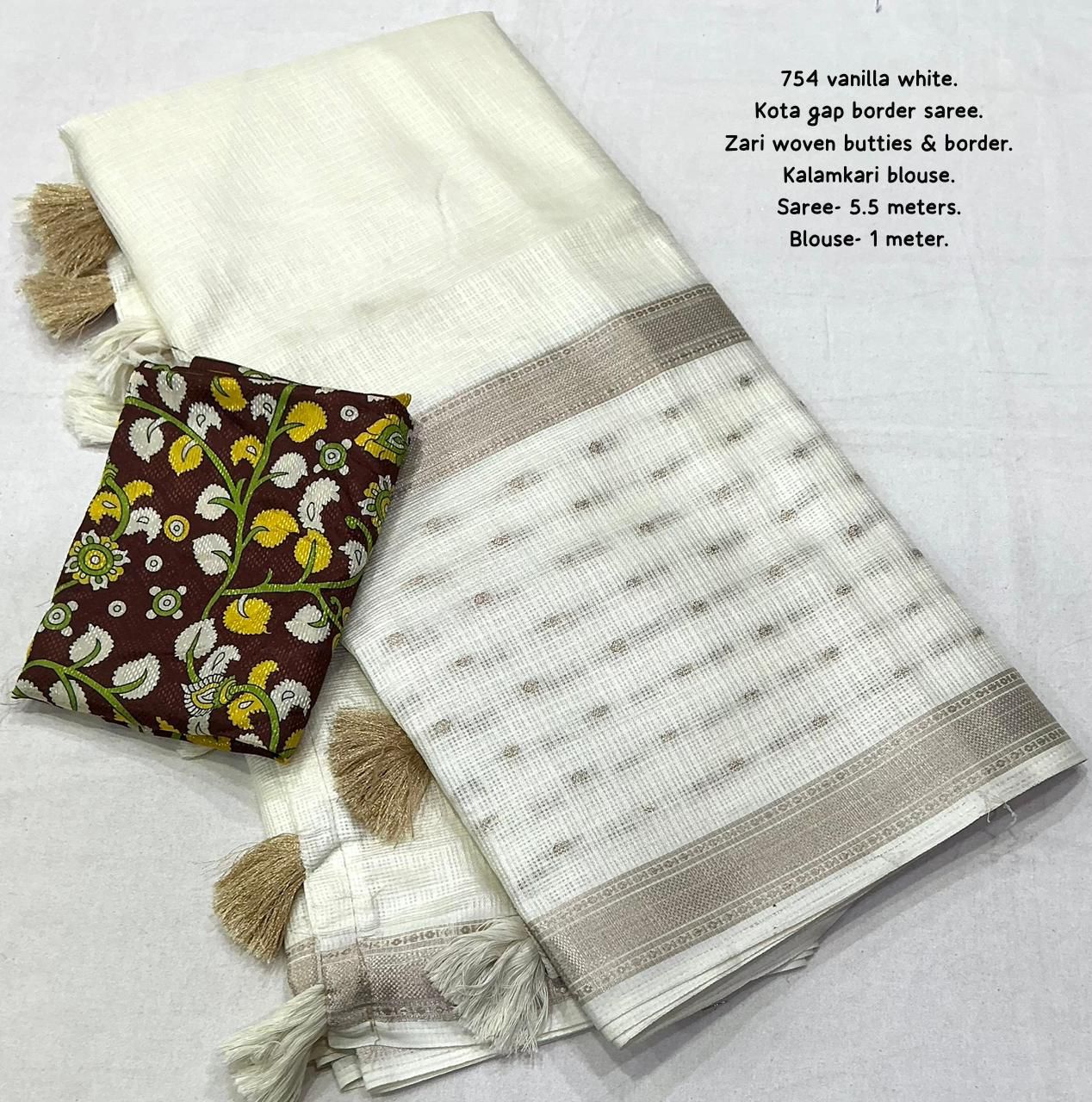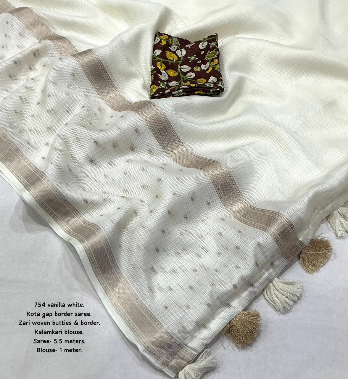 Step into effortless elegance with this newly designed Kota Ajrakh and Kalamkari saree, one of the best-selling styles now refreshed with a beautiful and contemporary look. Crafted from soft Kota fabric, this saree is lightweight, breathable, and perfect for all-day comfort, making it ideal for both casual and festive wear. It features delicate zari woven borders that add a subtle richness, along with elegant zari butties spread gracefully across the saree with a stylish gap border pattern, enhancing its overall appeal. The pallu is finished with soft cotton tassels, adding a charming and traditional touch to the design.