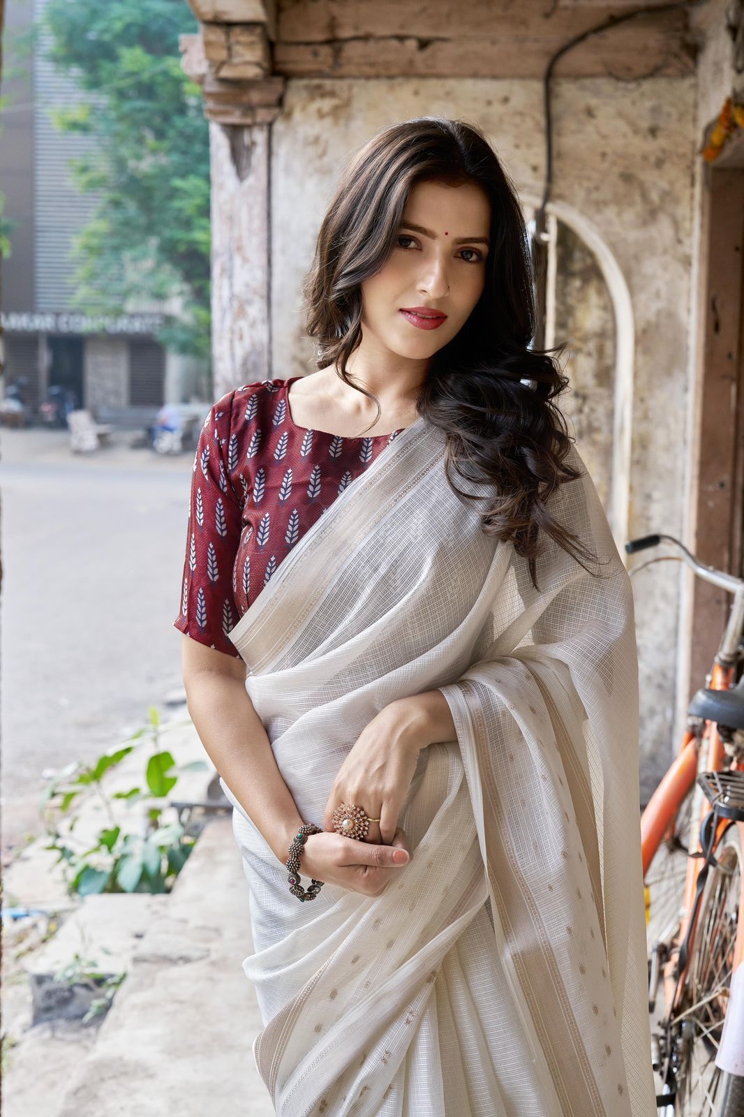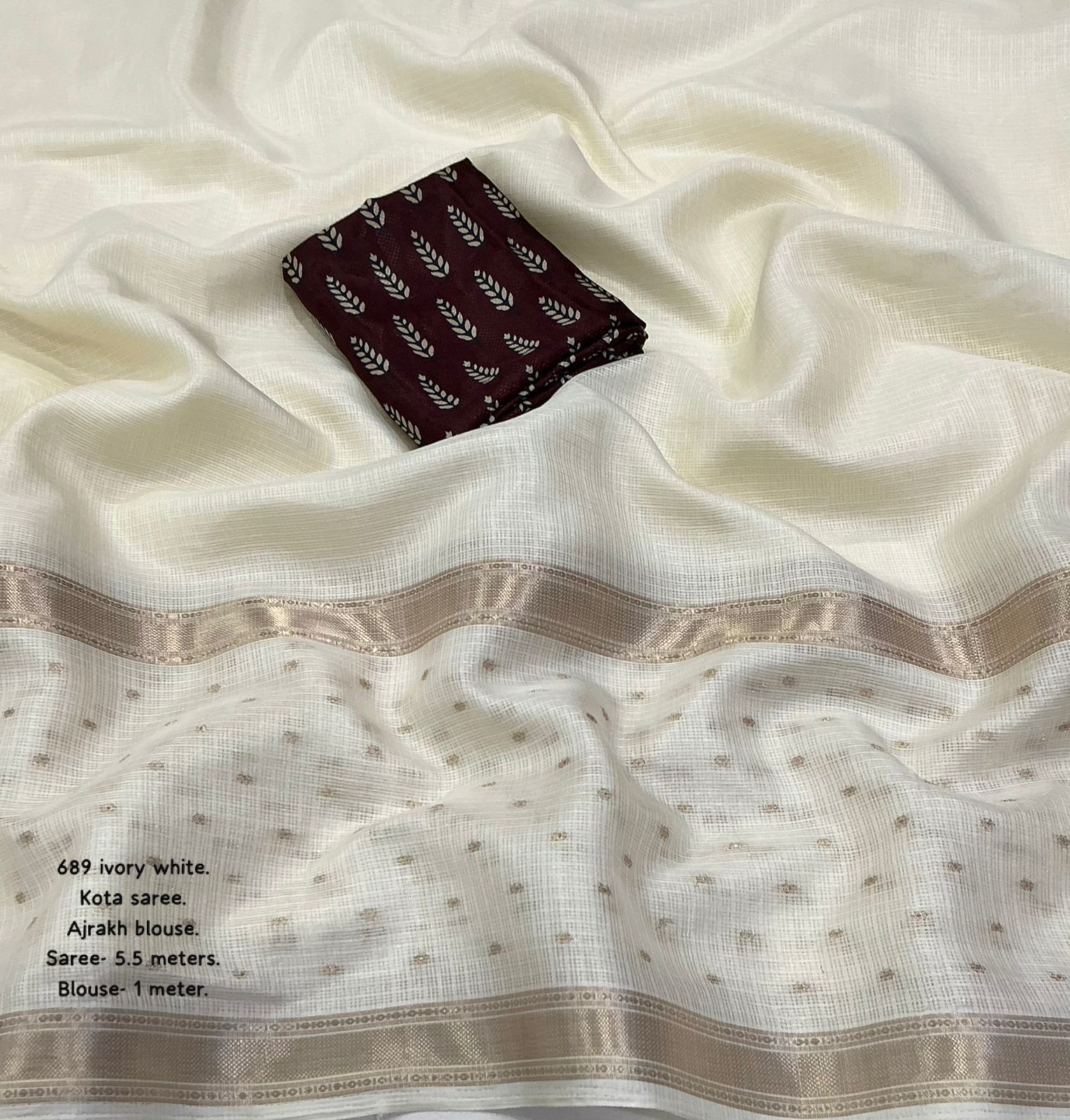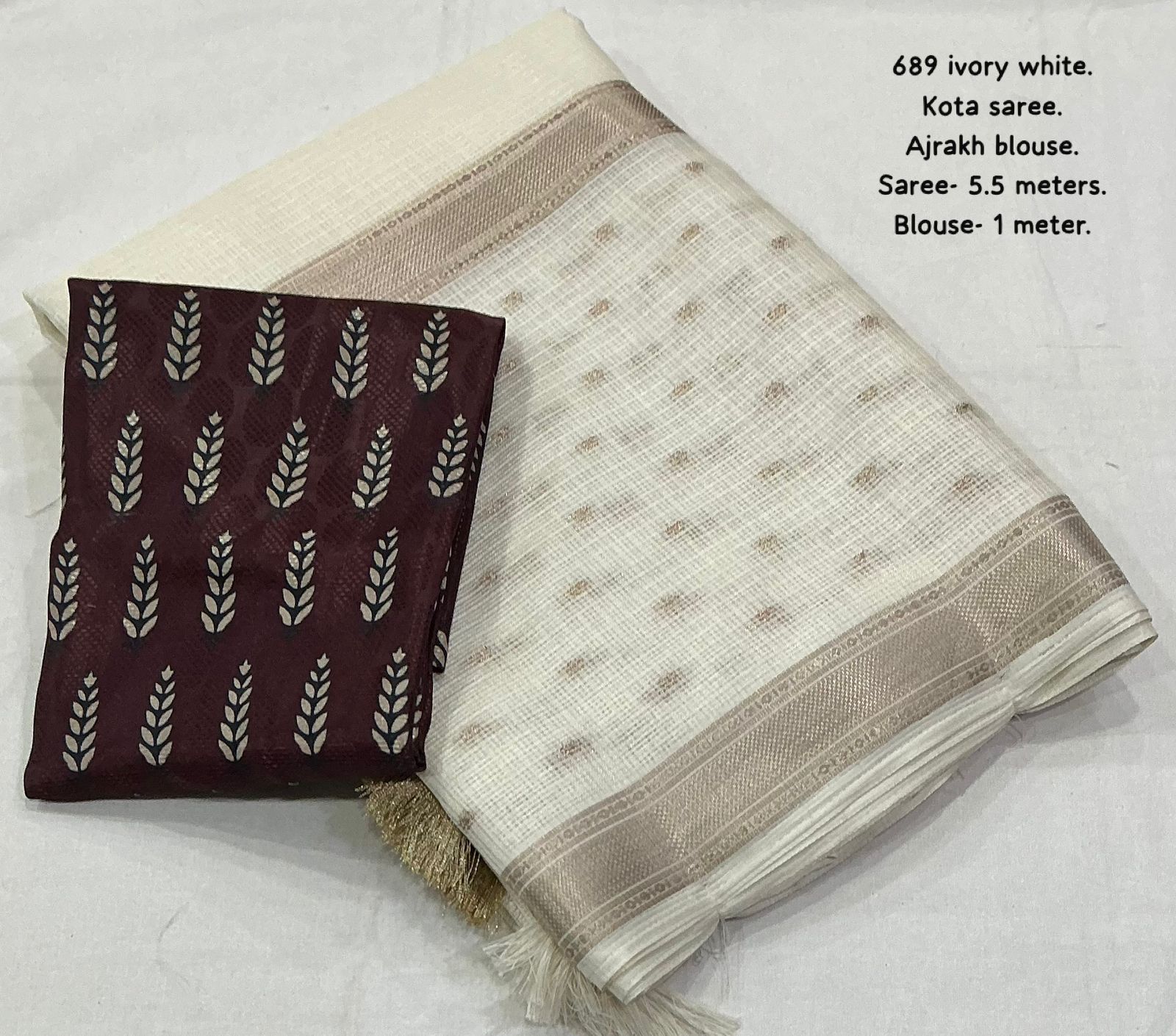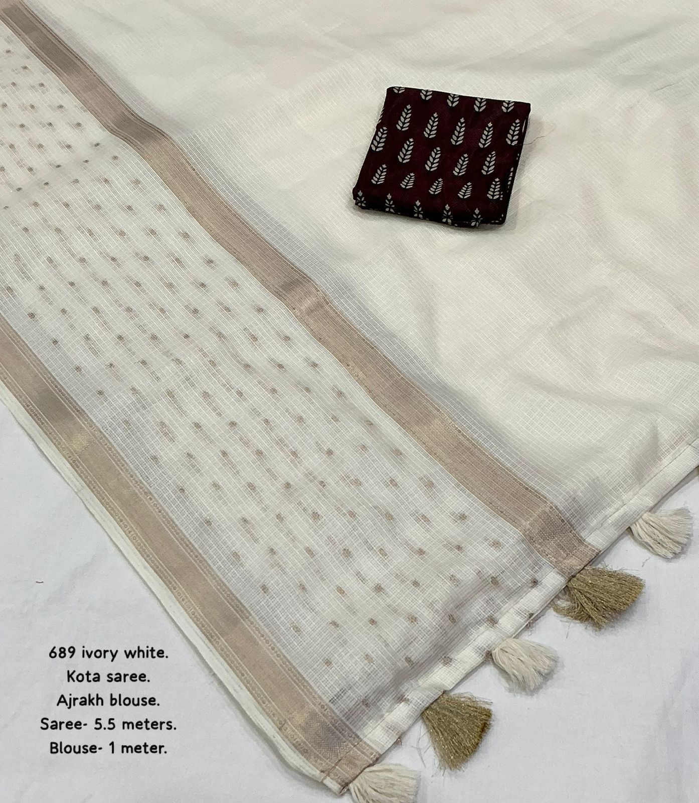 Step into effortless elegance with this newly designed Kota Ajrakh and Kalamkari saree, one of the best-selling styles now refreshed with a beautiful and contemporary look. Crafted from soft Kota fabric, this saree is lightweight, breathable, and perfect for all-day comfort, making it ideal for both casual and festive wear. It features delicate zari woven borders that add a subtle richness, along with elegant zari butties spread gracefully across the saree with a stylish gap border pattern, enhancing its overall appeal. The pallu is finished with soft cotton tassels, adding a charming and traditional touch to the design.