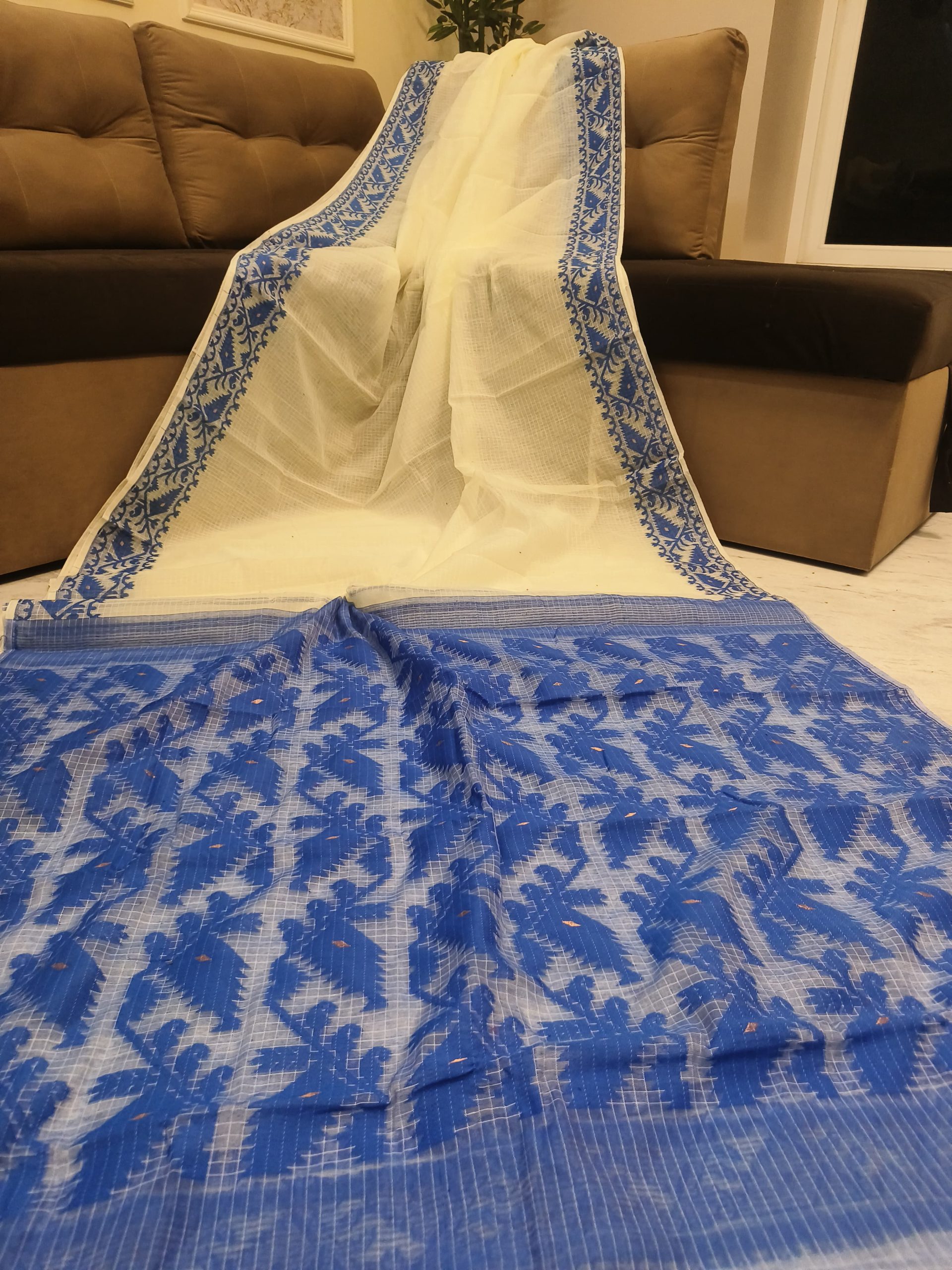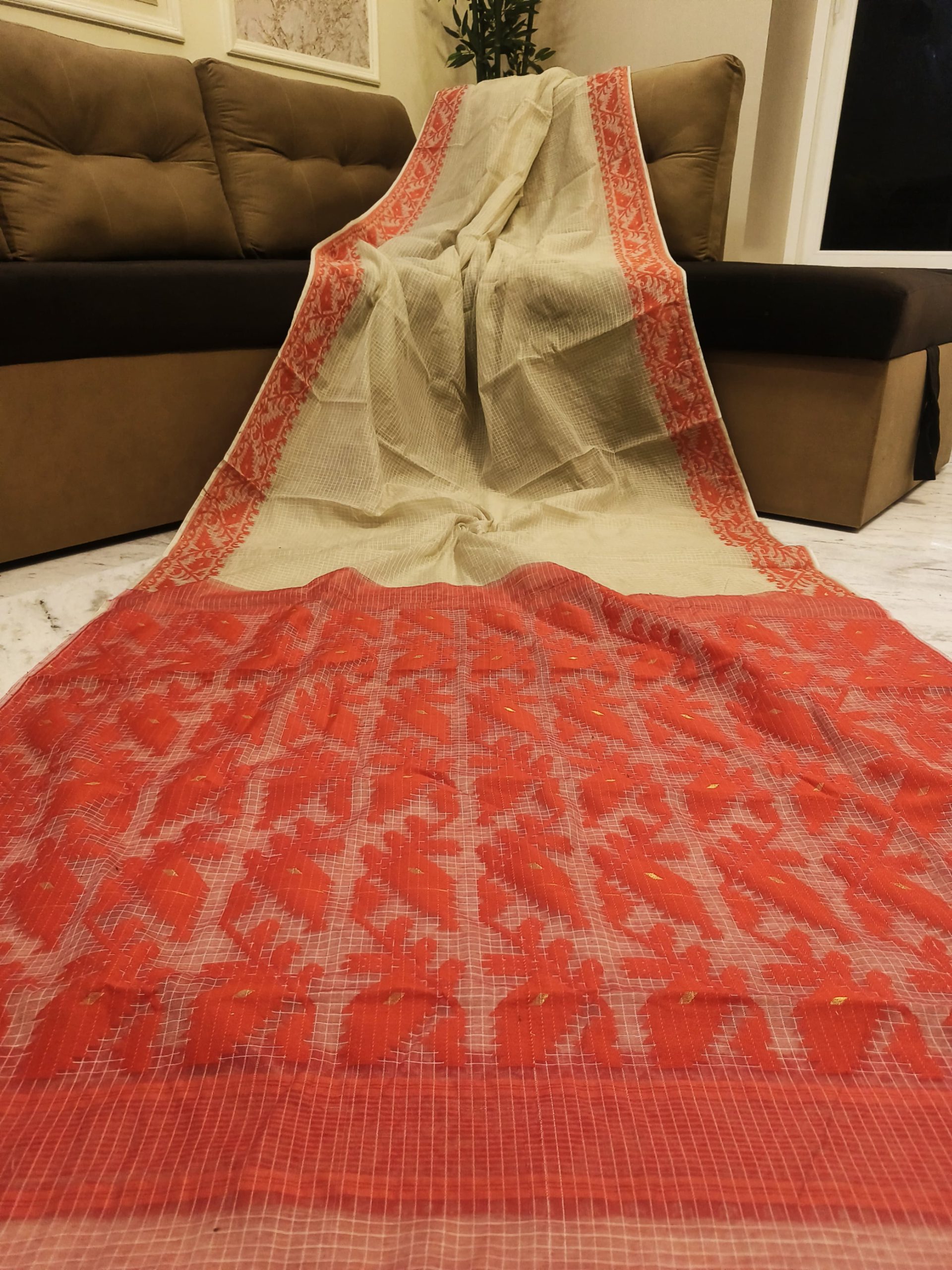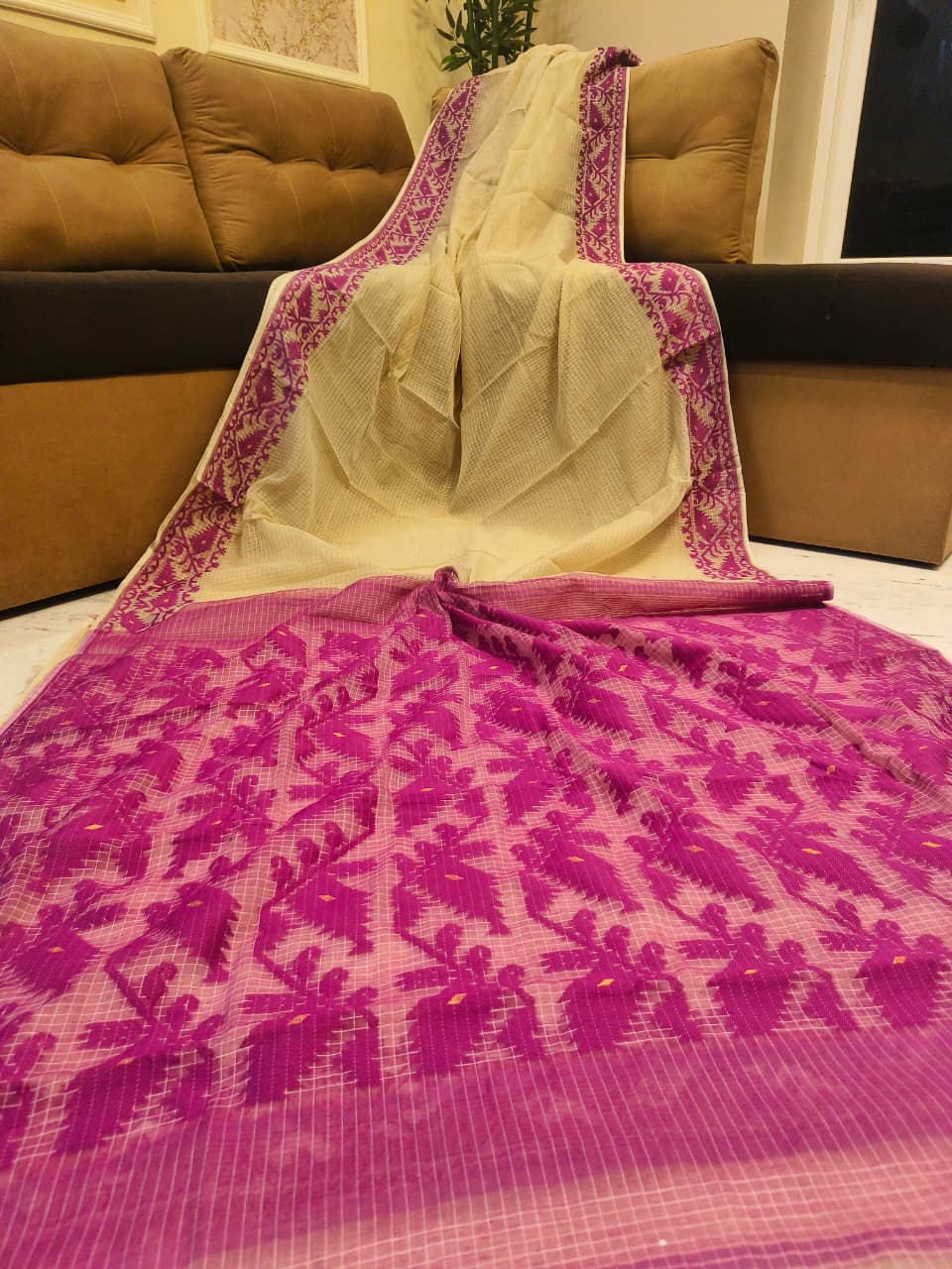 A graceful Soft Jamdani Saree featuring an elegant Allover Check Design and Running Blouse Piece