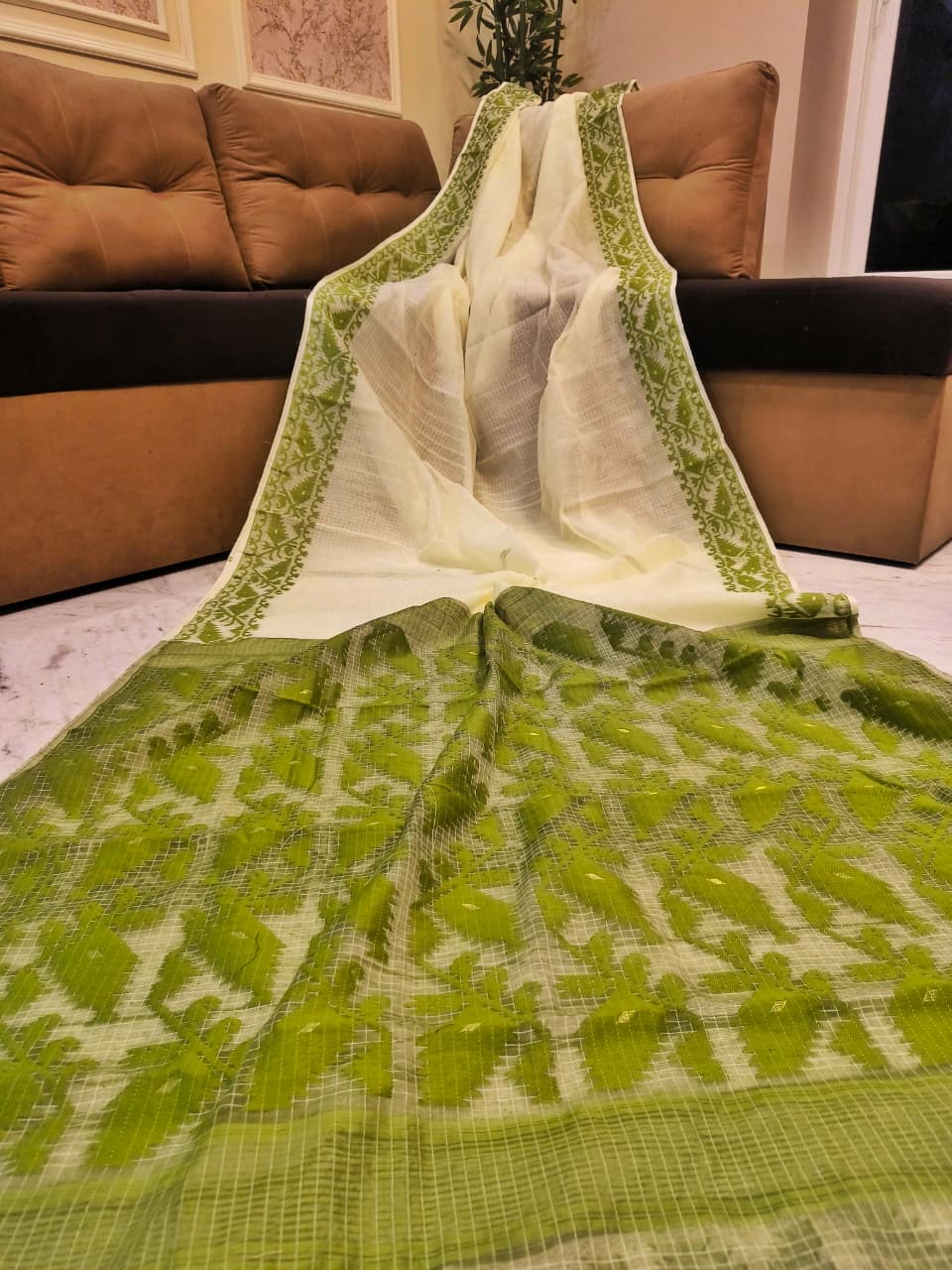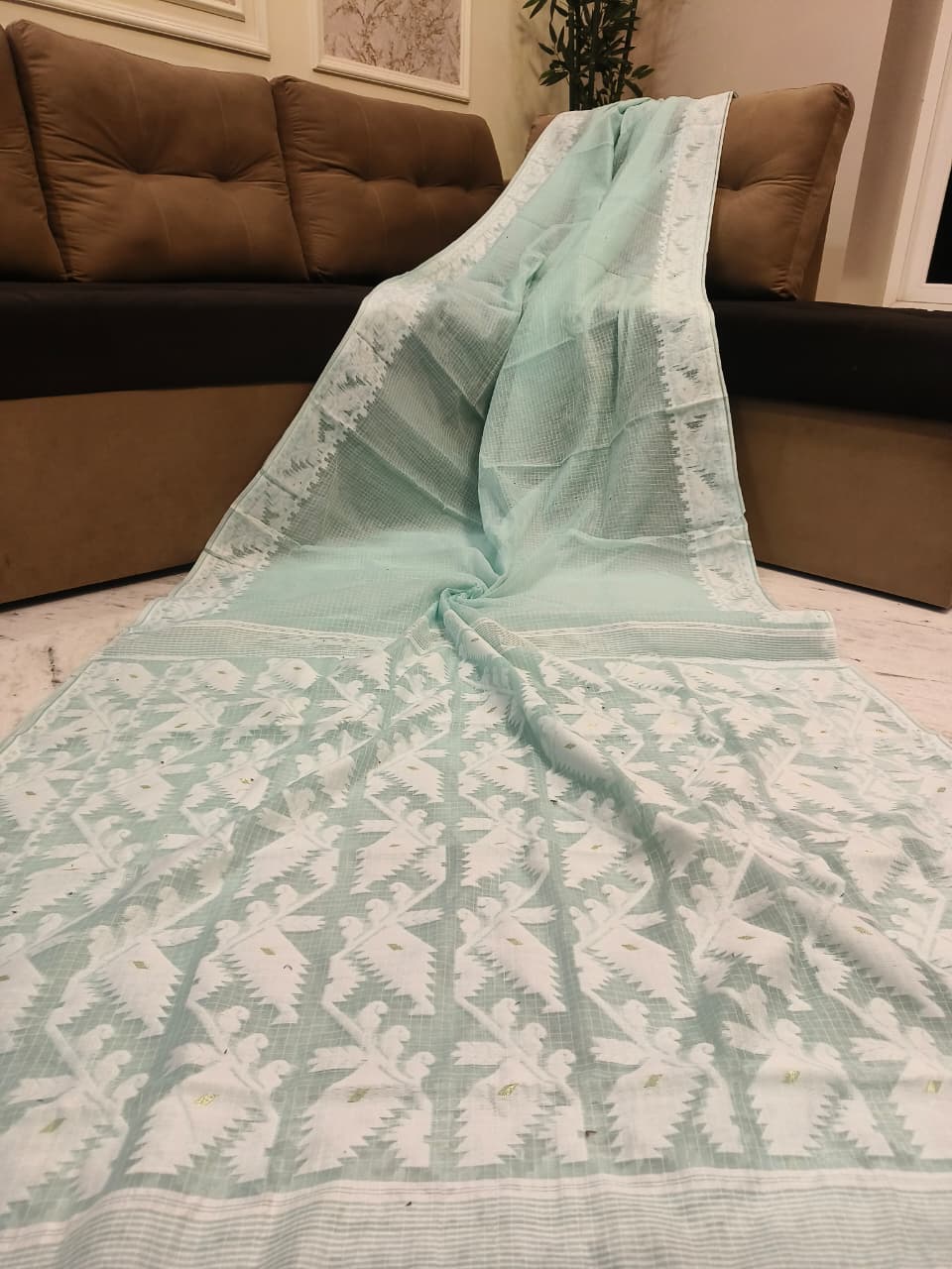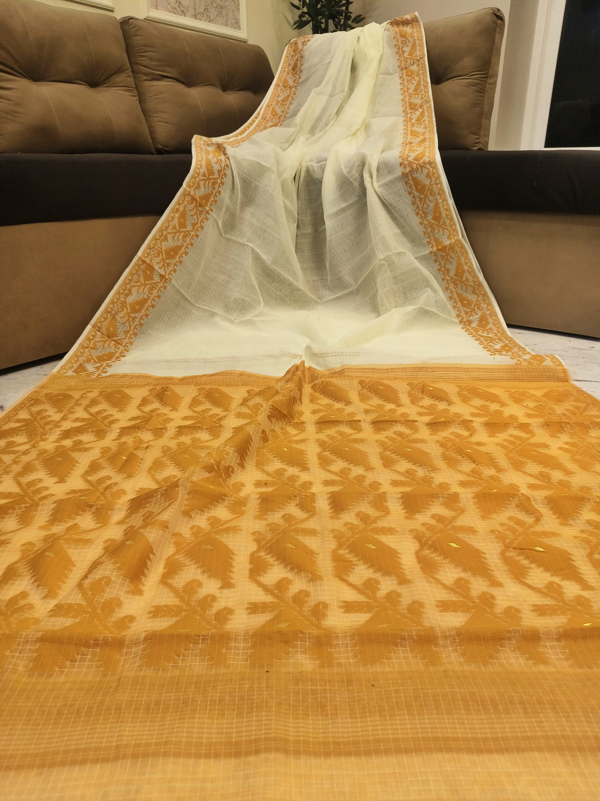 A graceful Soft Jamdani Saree featuring an elegant Allover Check Design and Running Blouse Piece
