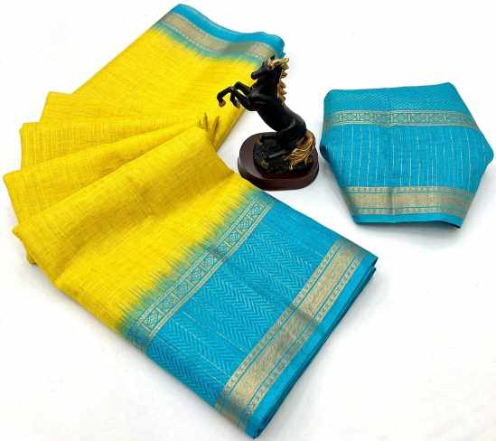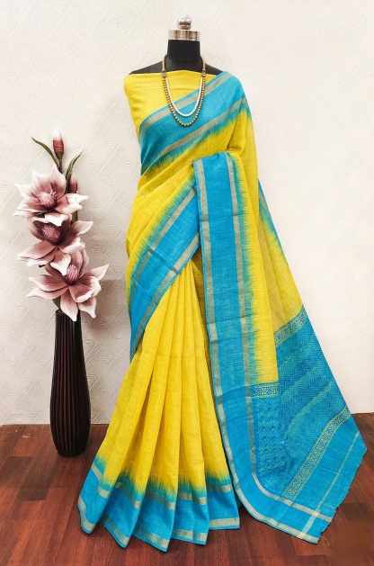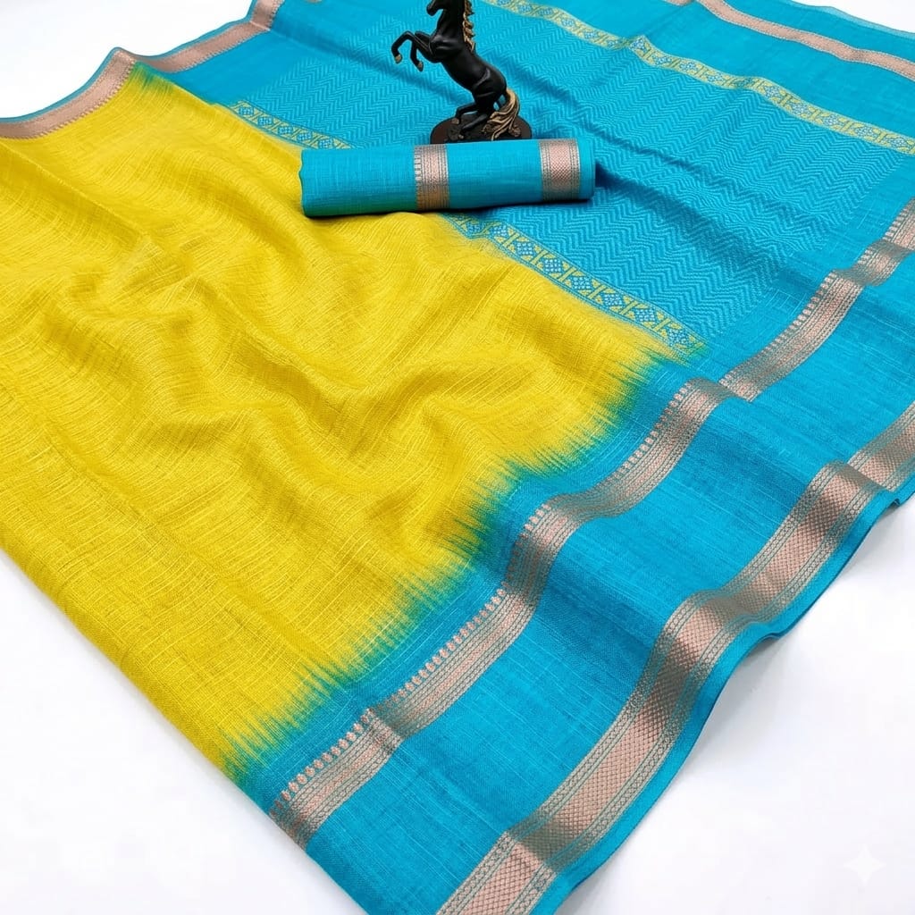Add a fresh and vibrant touch to your wardrobe with this linen yellow and sky blue fancy design cotton saree, crafted for both comfort and style. Made from first-quality lightweight cotton, the saree offers a soft and smooth texture, making it ideal for all-day wear, especially in warm weather. It features a beautiful blend of silver and copper mixed borders on both sides, enhancing its elegant appeal. The saree is designed with a grand Kalamkari digital pallu and a striking contrast blouse, while the entire body showcases 3D digital prints that add a modern and eye-catching finish.
