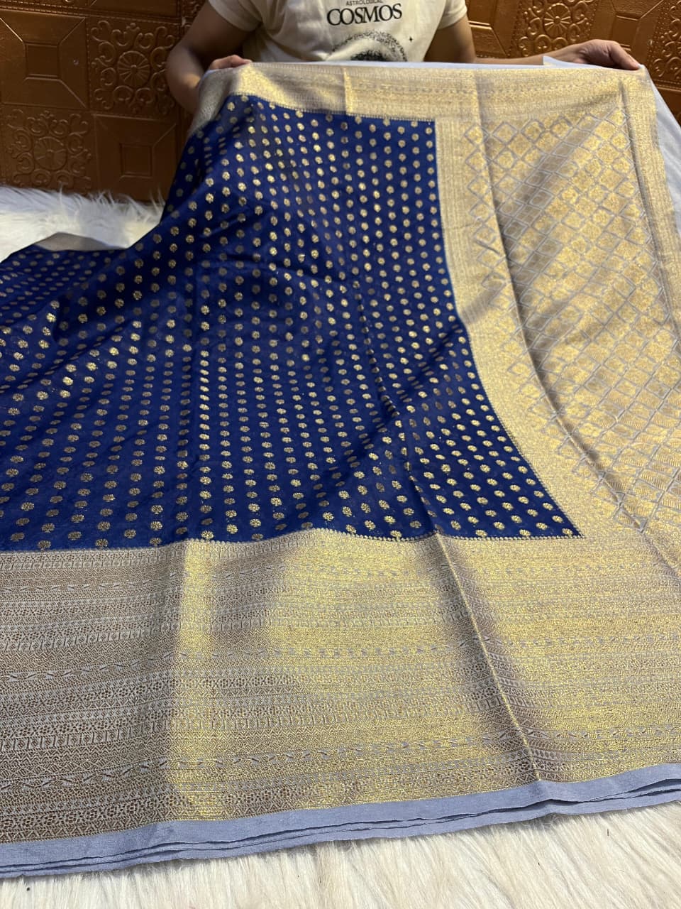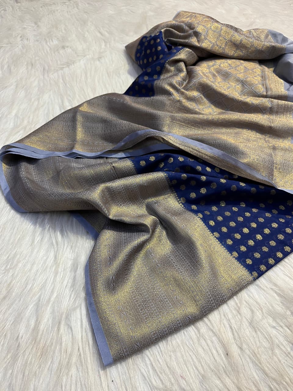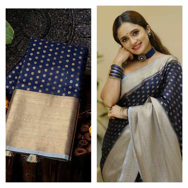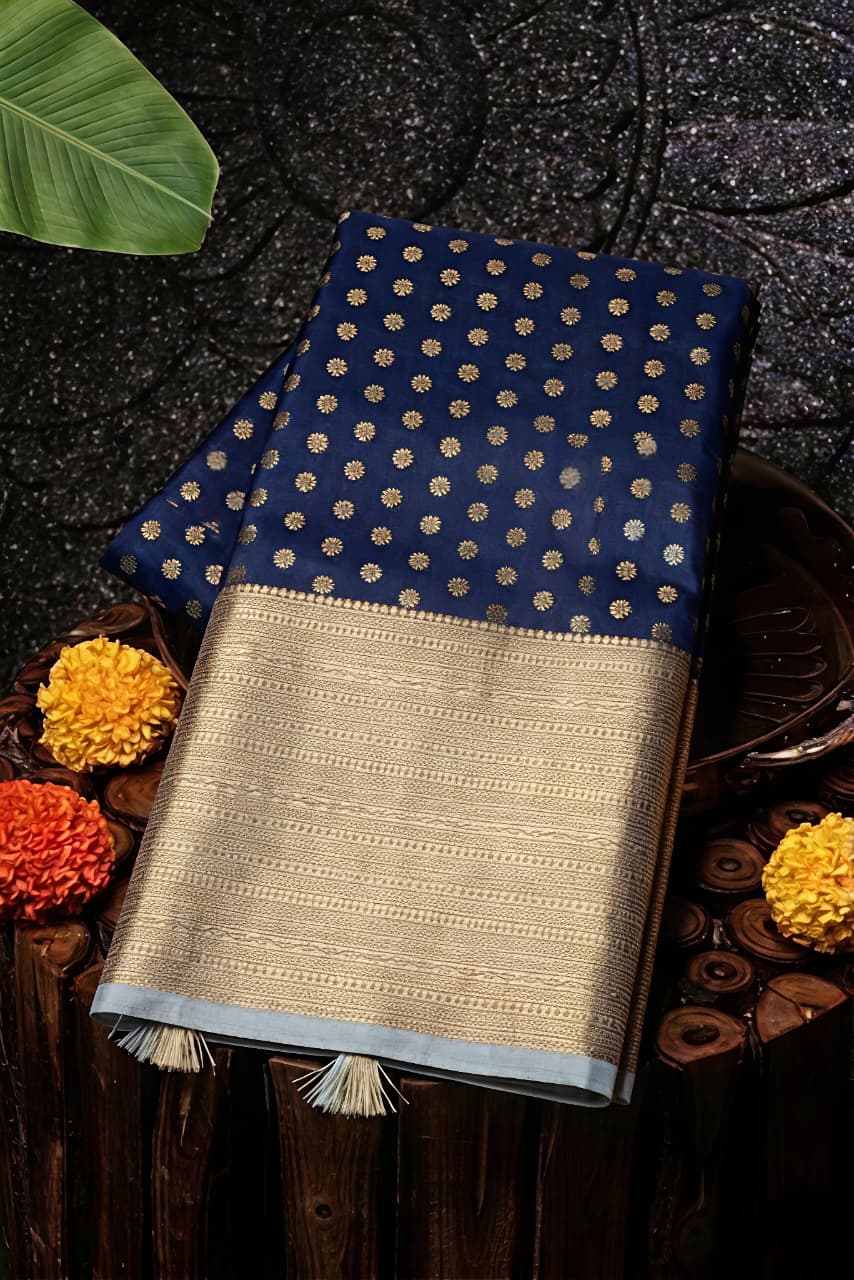 Step into timeless elegance with this new collection navy blue Banarasi saree, beautifully enhanced with a pastel blue border for a rich and graceful contrast. Crafted from soft fancy Banarasi semi katan dayable silk, the saree offers a smooth texture and luxurious feel, perfect for festive occasions and special gatherings. It features a grand border along with all-over saree buttas, adding a traditional yet stylish charm to the overall look. The contrasting jacquard pallu and matching blouse elevate the design, while the unique blouse pattern adds a modern touch to this classic ensemble.