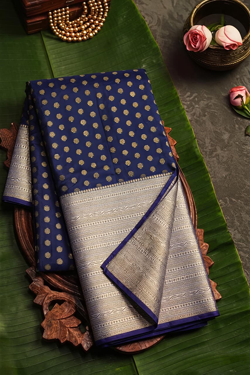 Navy Blue Semi Katan Banarasi Silk Saree with Pastel Blue Jacquard Border