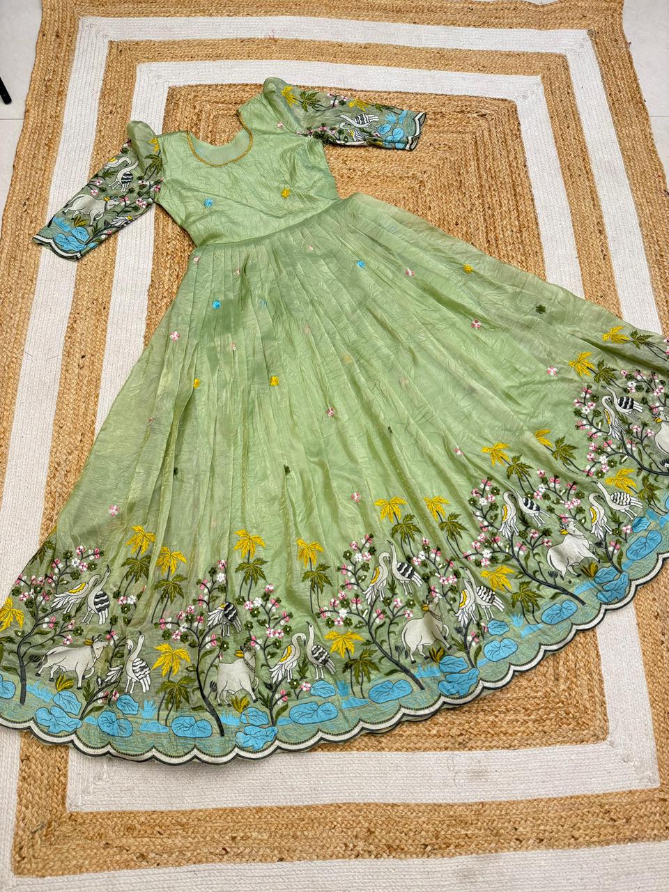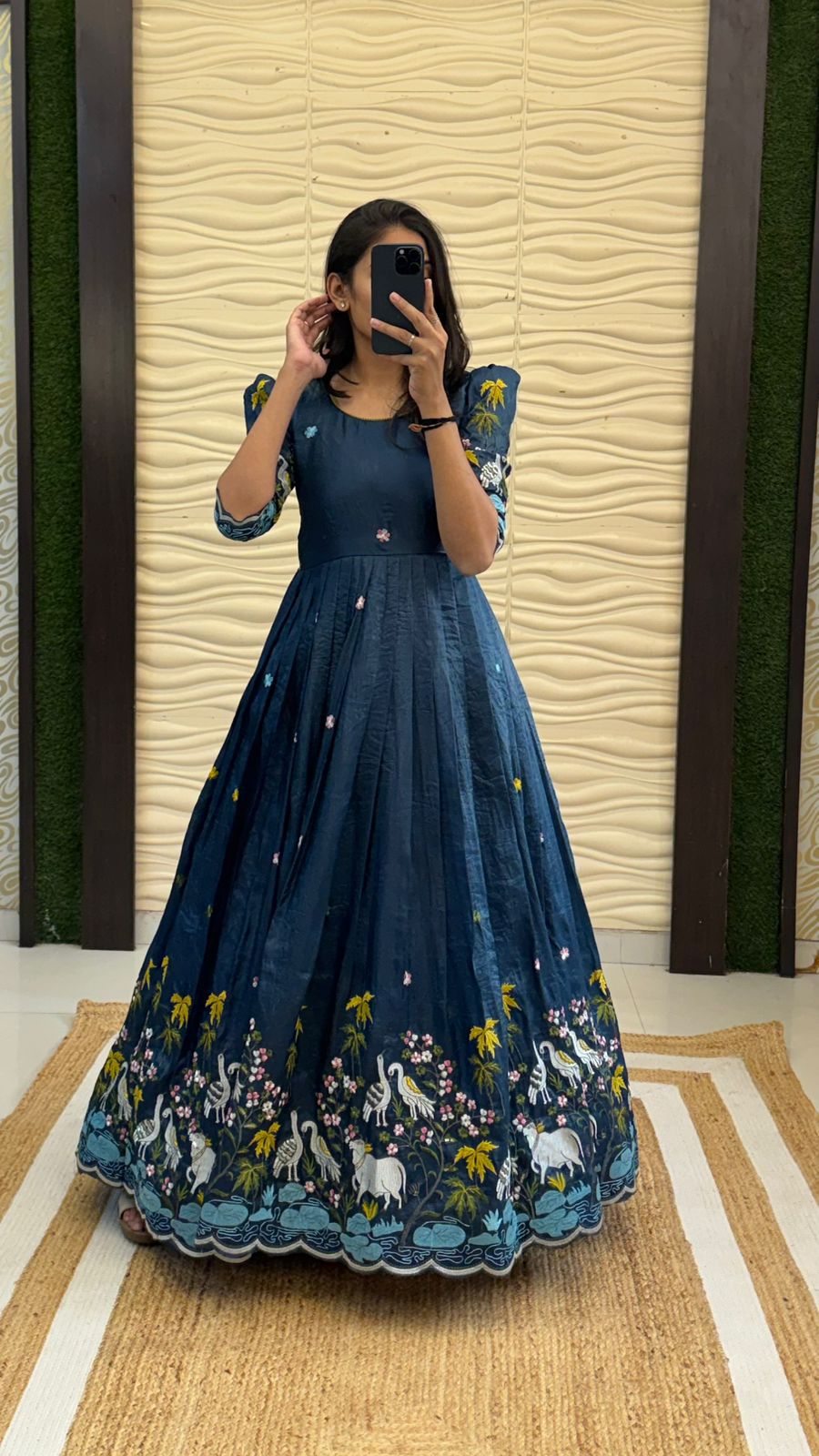 Introducing the Pongal Special Gown Collection – a stunning masterpiece crafted for festive elegance and vibrant style. This gown is made from soft crush fabric adorned with colorful Pichwai motifs, charming birds embroidery, and sparkling sequence work, enhanced with an Arco border for a luxurious finish. Fully stitched with a fancy neckline and complete inner lining, it offers a perfect blend of comfort and style. Available in sizes XS, S, M, L, XL, and XXL, with a length of 54 inches and a 3-meter flair, this gown is designed to make you stand out at any celebration. This festive edition ensures you celebrate in style. Note: After booking, the pickup will be available the next day
