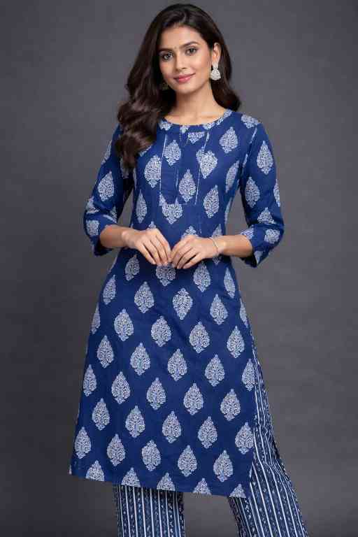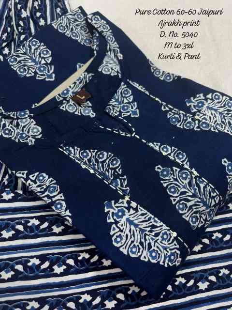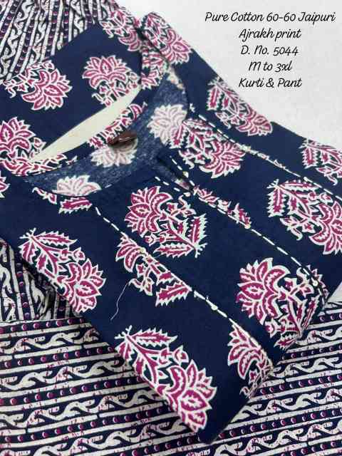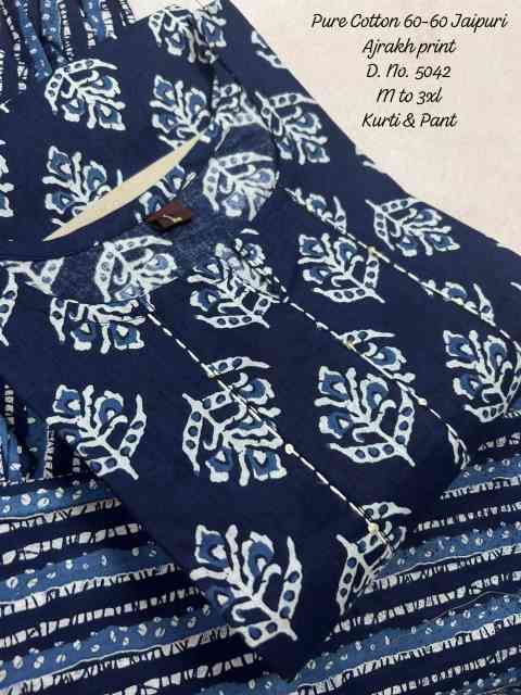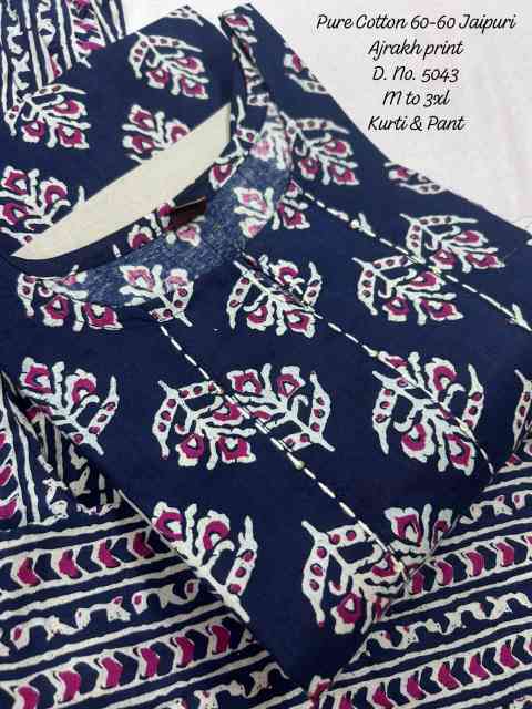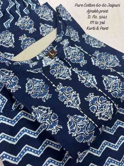 Upgrade your everyday ethnic style with this pure cotton 60-60 Ajrakh print kurti and pant set, designed for comfort and effortless elegance. Crafted from high-quality breathable cotton fabric, it offers a soft and skin-friendly feel, making it perfect for daily wear, office use, and casual outings. The straight-cut kurti features elegant handwork detailing and a functional side pocket, adding both style and practicality. Paired with a matching printed pant, the set creates a coordinated and stylish look with a touch of traditional Ajrakh artistry.