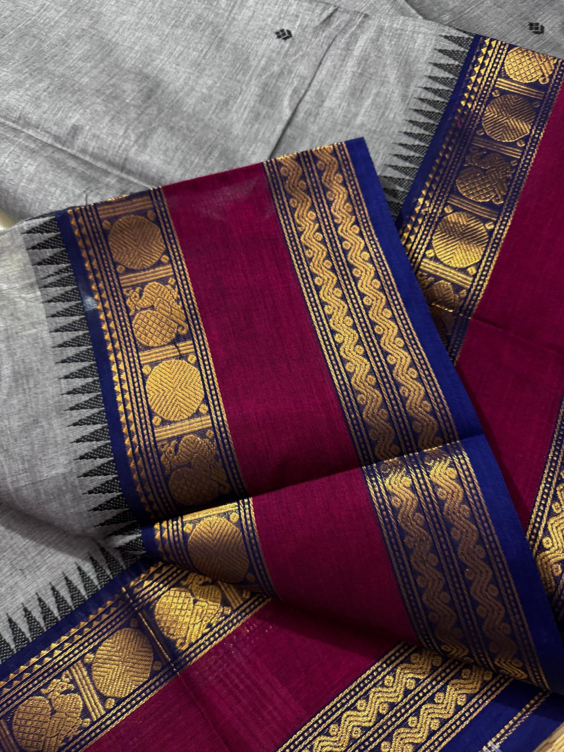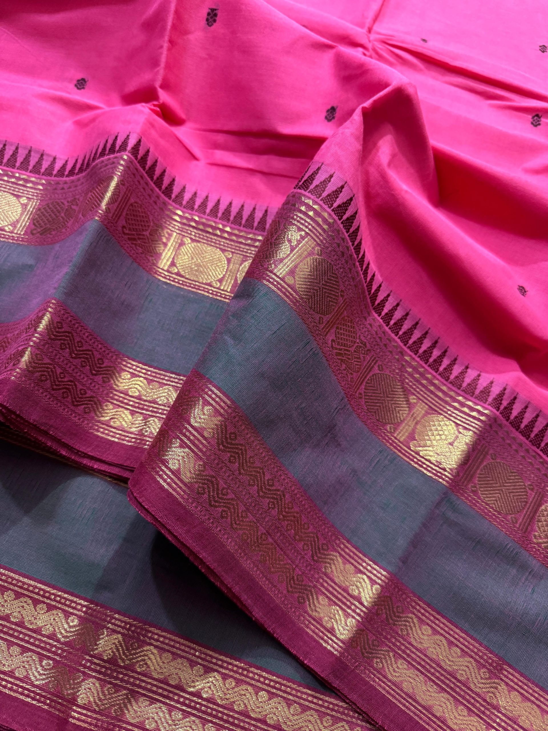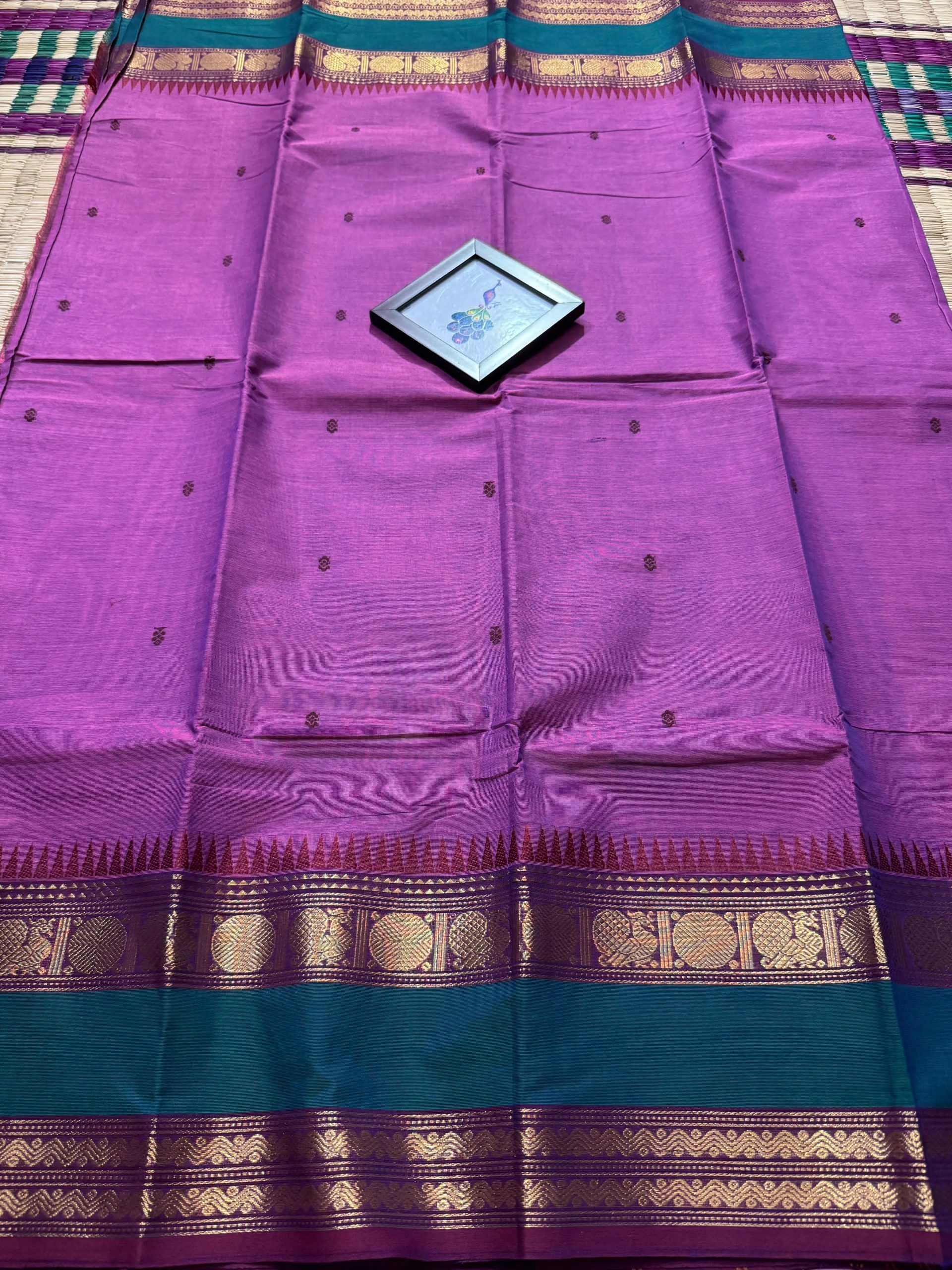 Experience timeless elegance with this pure Kanchi Cotton saree, crafted to reflect true heritage and premium craftsmanship. The saree features a rich woven border highlighted with premium zari work that beautifully elevates its look, reminiscent of classic Kanchi pattu finesse. The perfectly detailed border gives the saree a unique identity and an incomparable finish that stands out effortlessly. The body is adorned with delicate handwoven butta work, adding subtle richness, while the pallu is gracefully filled with matching handwoven buttas for a balanced and luxurious appearance. Completed with a running blouse, this saree is ideal for women who appreciate authentic handloom artistry, refined elegance, and a premium traditional look suitable for festive occasions, functions, and graceful everyday wear.