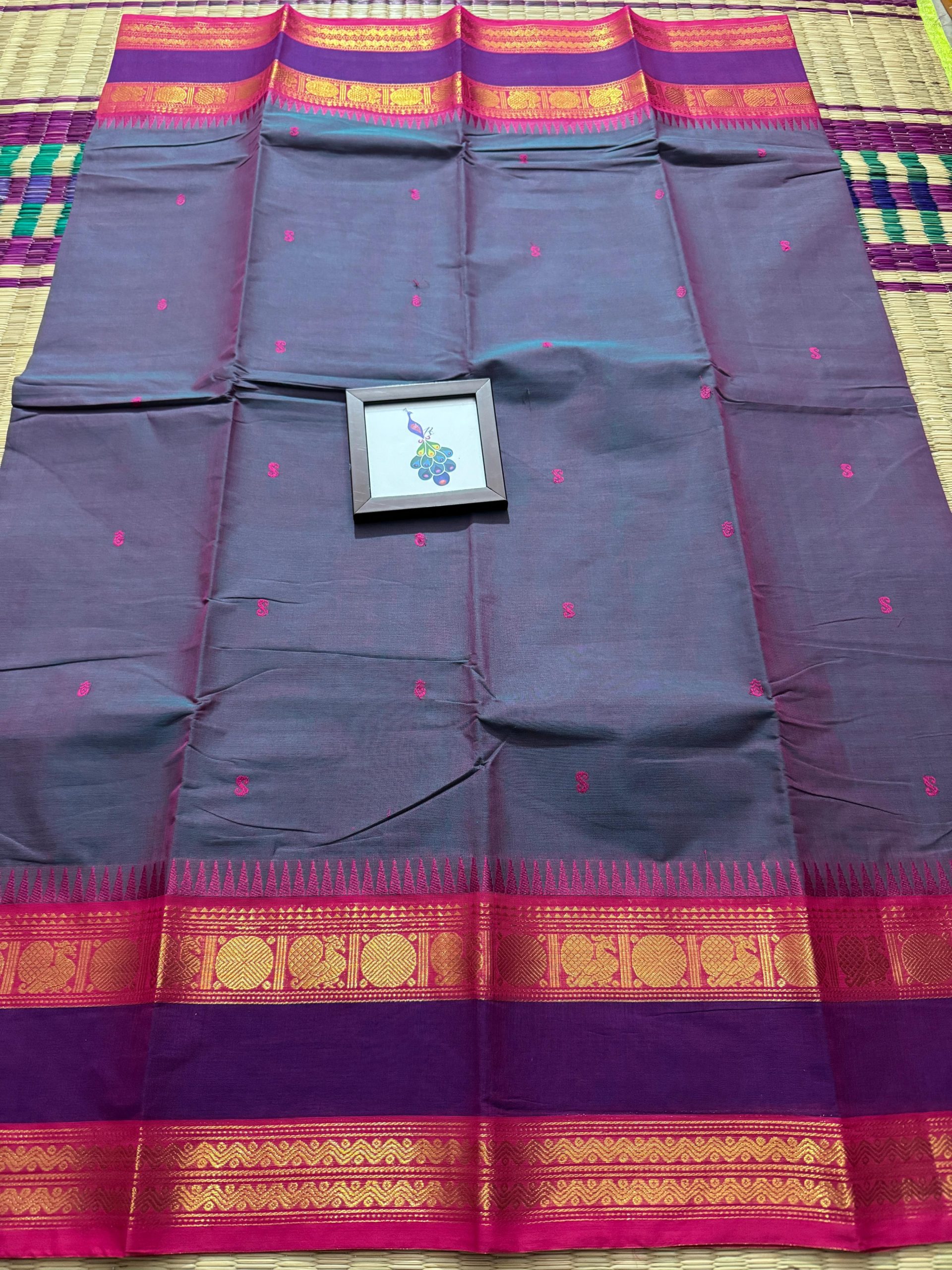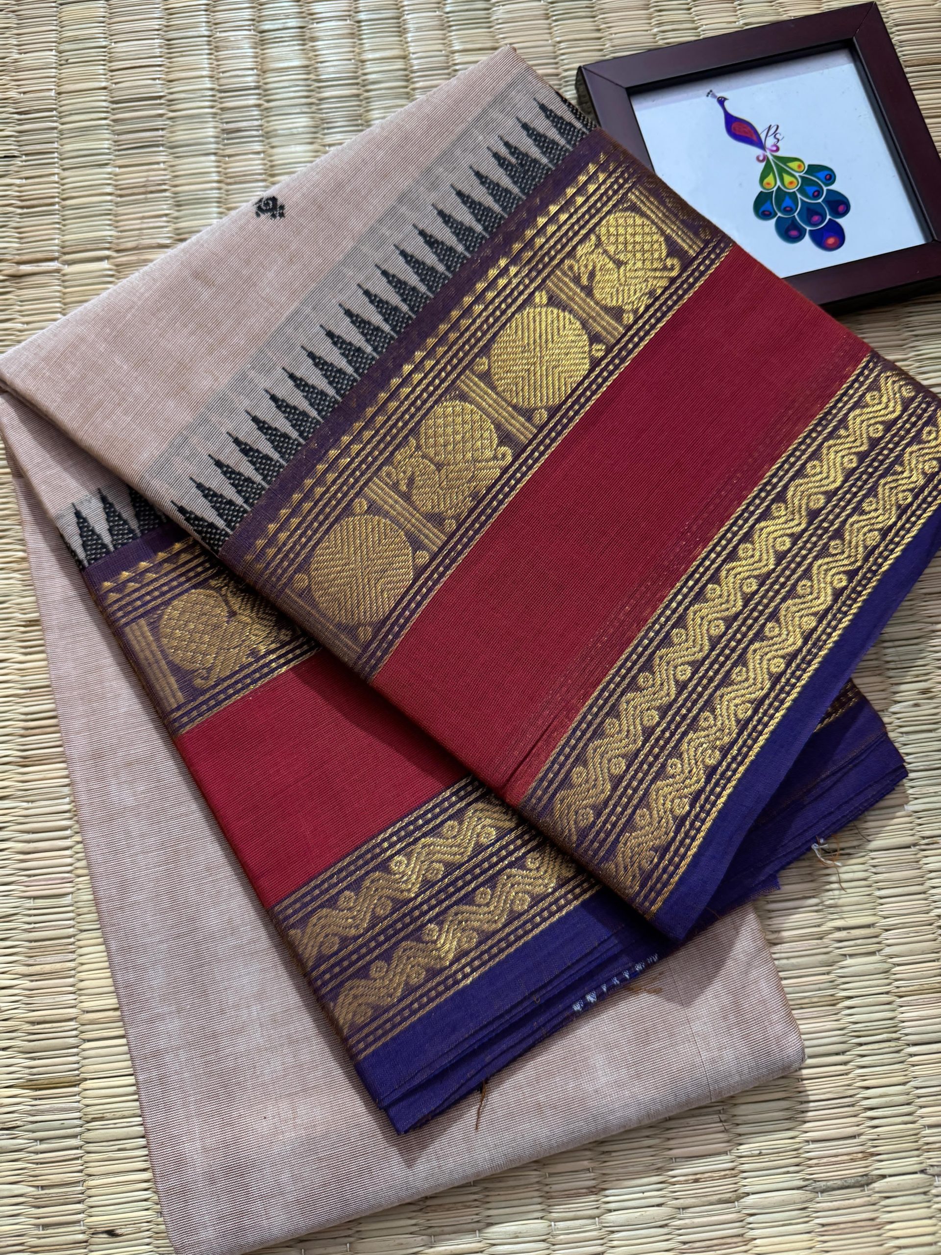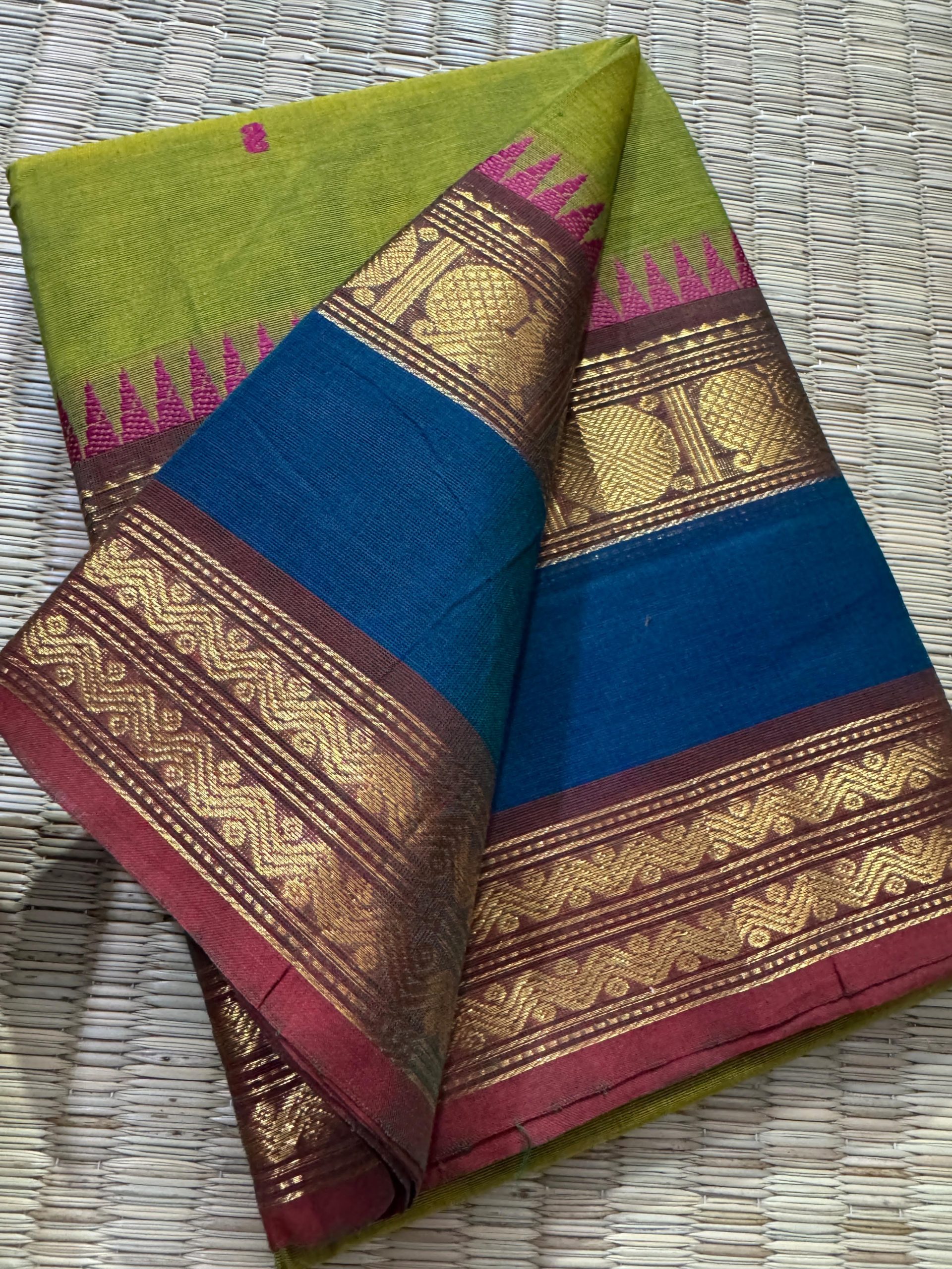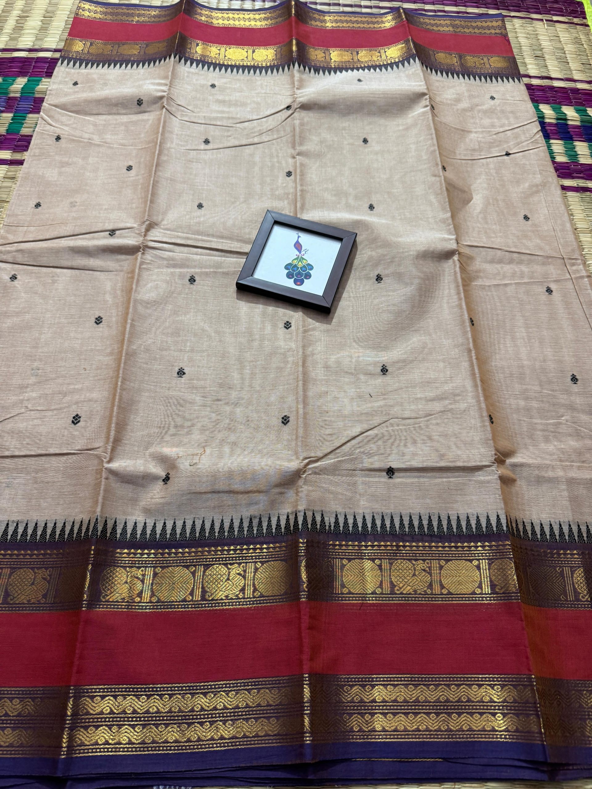 Experience timeless elegance with this pure Kanchi Cotton saree, crafted to reflect true heritage and premium craftsmanship. The saree features a rich woven border highlighted with premium zari work that beautifully elevates its look, reminiscent of classic Kanchi pattu finesse. The perfectly detailed border gives the saree a unique identity and an incomparable finish that stands out effortlessly. The body is adorned with delicate handwoven butta work, adding subtle richness, while the pallu is gracefully filled with matching handwoven buttas for a balanced and luxurious appearance. Completed with a running blouse, this saree is ideal for women who appreciate authentic handloom artistry, refined elegance, and a premium traditional look suitable for festive occasions, functions, and graceful everyday wear.