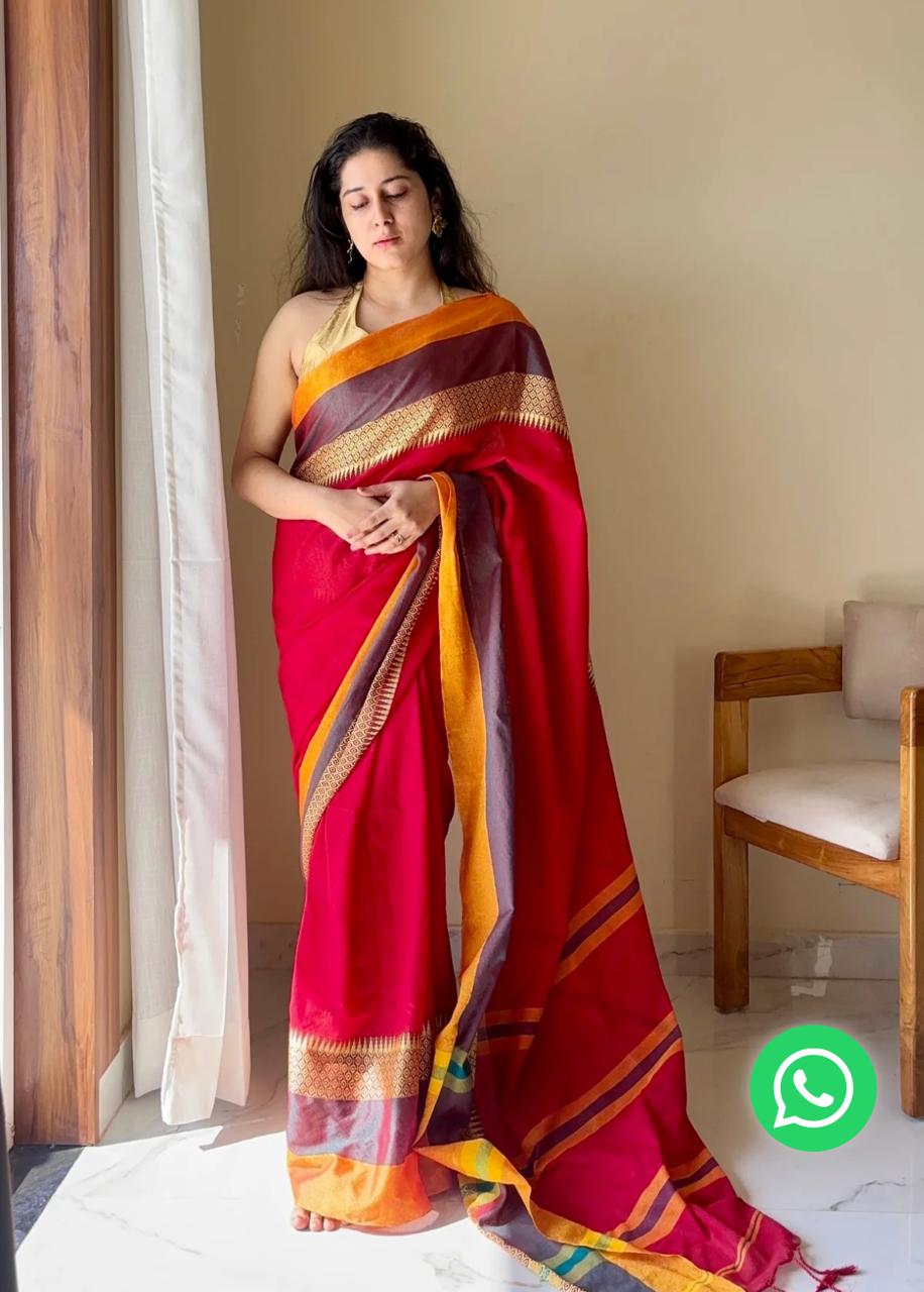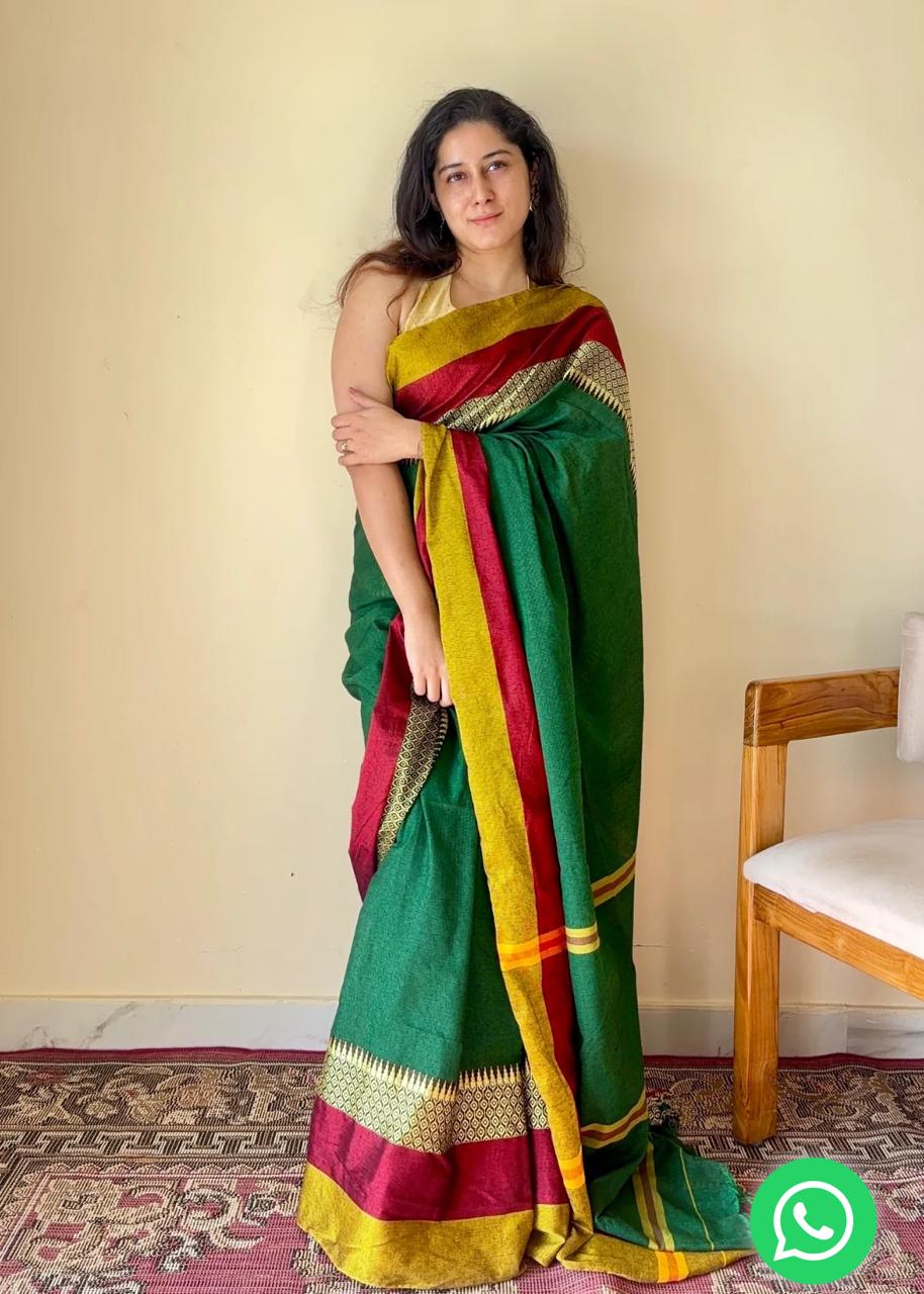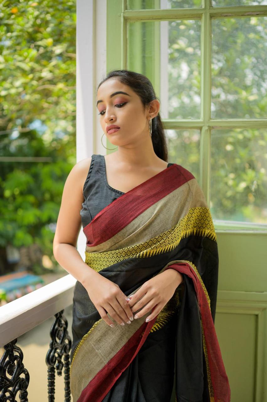 Experience the authentic charm of Indian heritage with our Pure Khadi Cotton Handloom Saree. This beautifully crafted saree features a stunning jacquard weaving design in the border, adding a touch of elegance to your look. Paired with an attached running blouse piece, it’s perfect for everyday wear or special occasions.