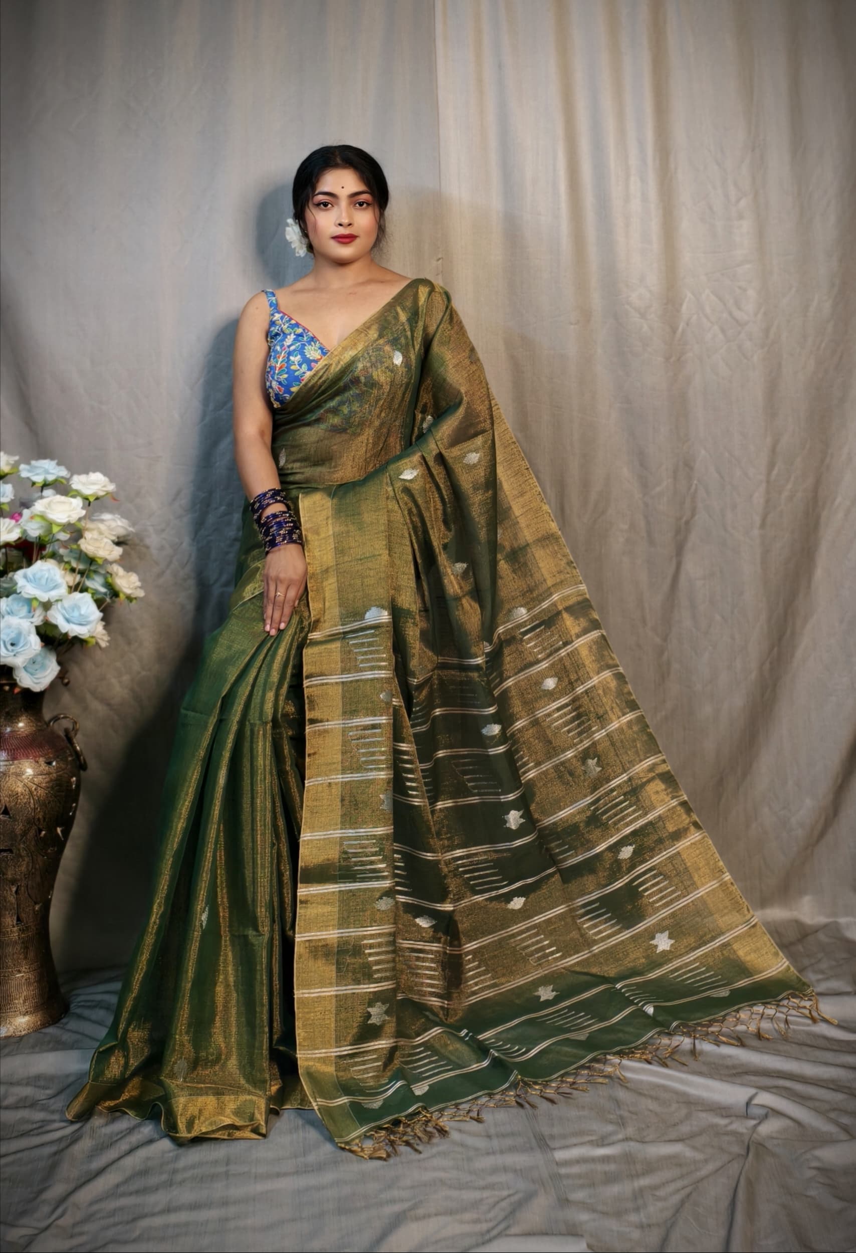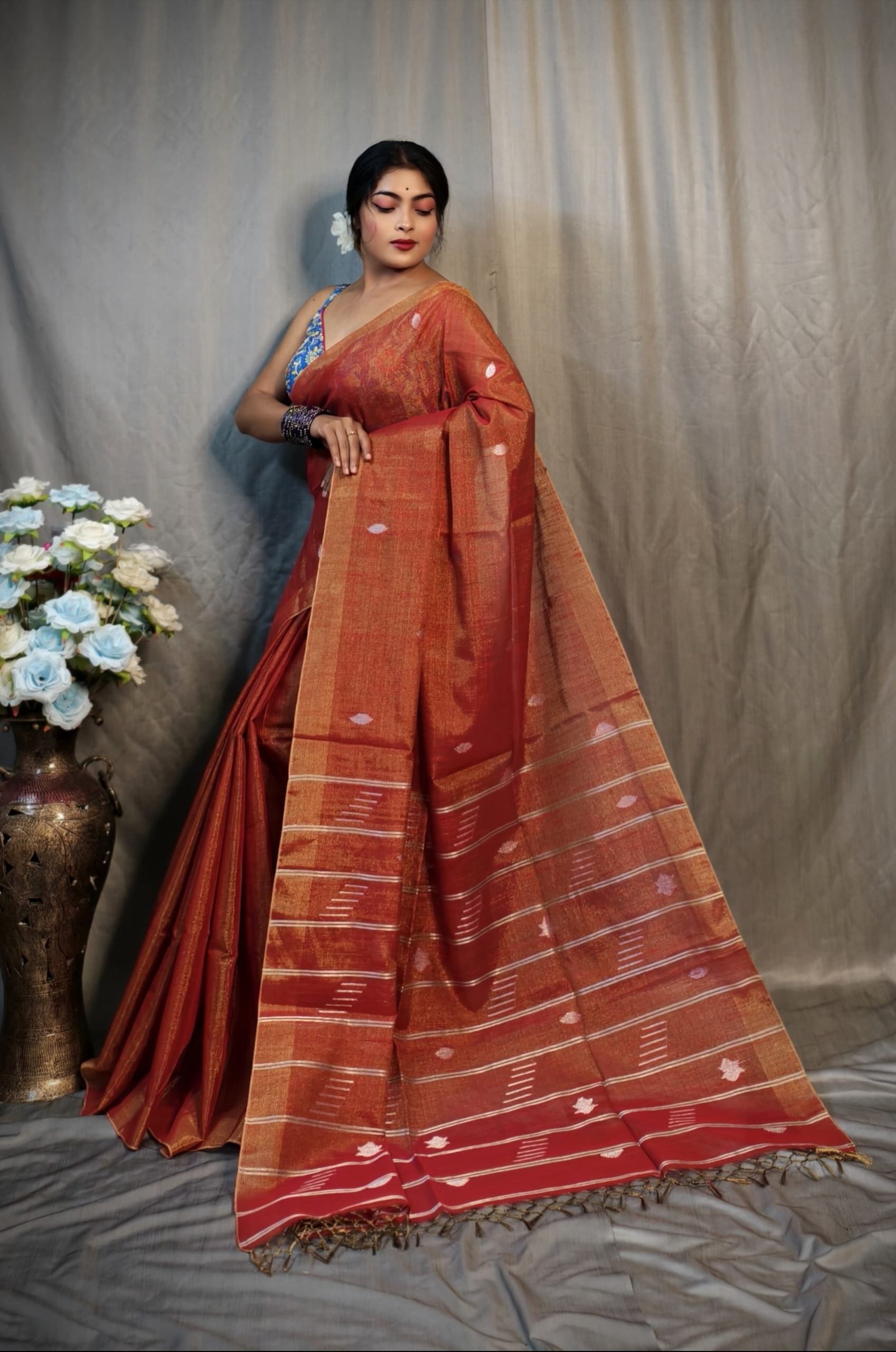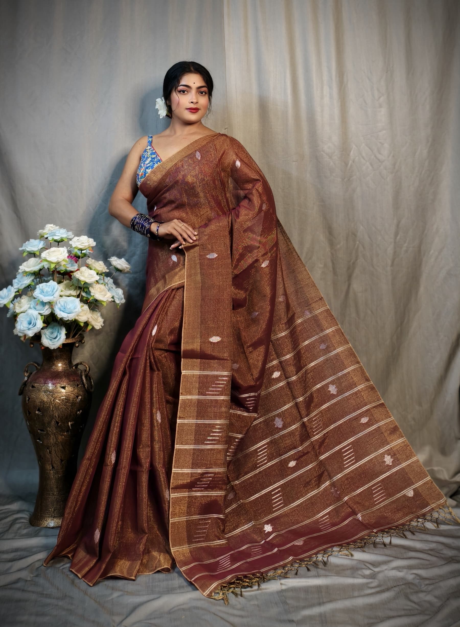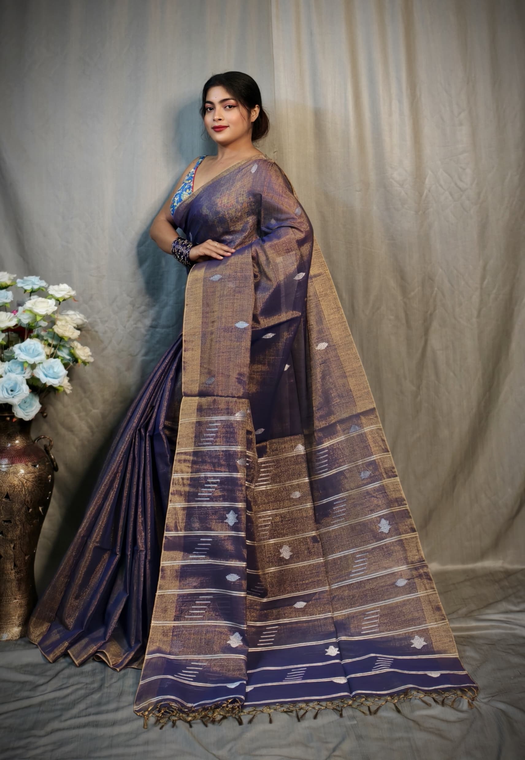 Discover timeless elegance wrapped in contemporary grace with this Pure Tissue Blended Linen saree, thoughtfully crafted to deliver a soft, lightweight feel and an effortlessly elegant drape. The handwoven detailing adds a rich traditional essence, elevating the saree with a subtle classy shine that looks refined yet striking. Designed for women who appreciate premium textures and graceful styling, this saree comes with a running blouse piece for a perfectly coordinated look. Its smooth and rich finish makes it an ideal choice for festive celebrations, parties, and traditional occasions where understated luxury speaks the loudest. Superior in fabric quality and finishing, this saree stands apart from ordinary market varieties, offering assured comfort, durability, and elegance in every fold. A perfect blend of tradition and modern sophistication, this saree is a wardrobe essential for those who value quality, charm, and effortless style.