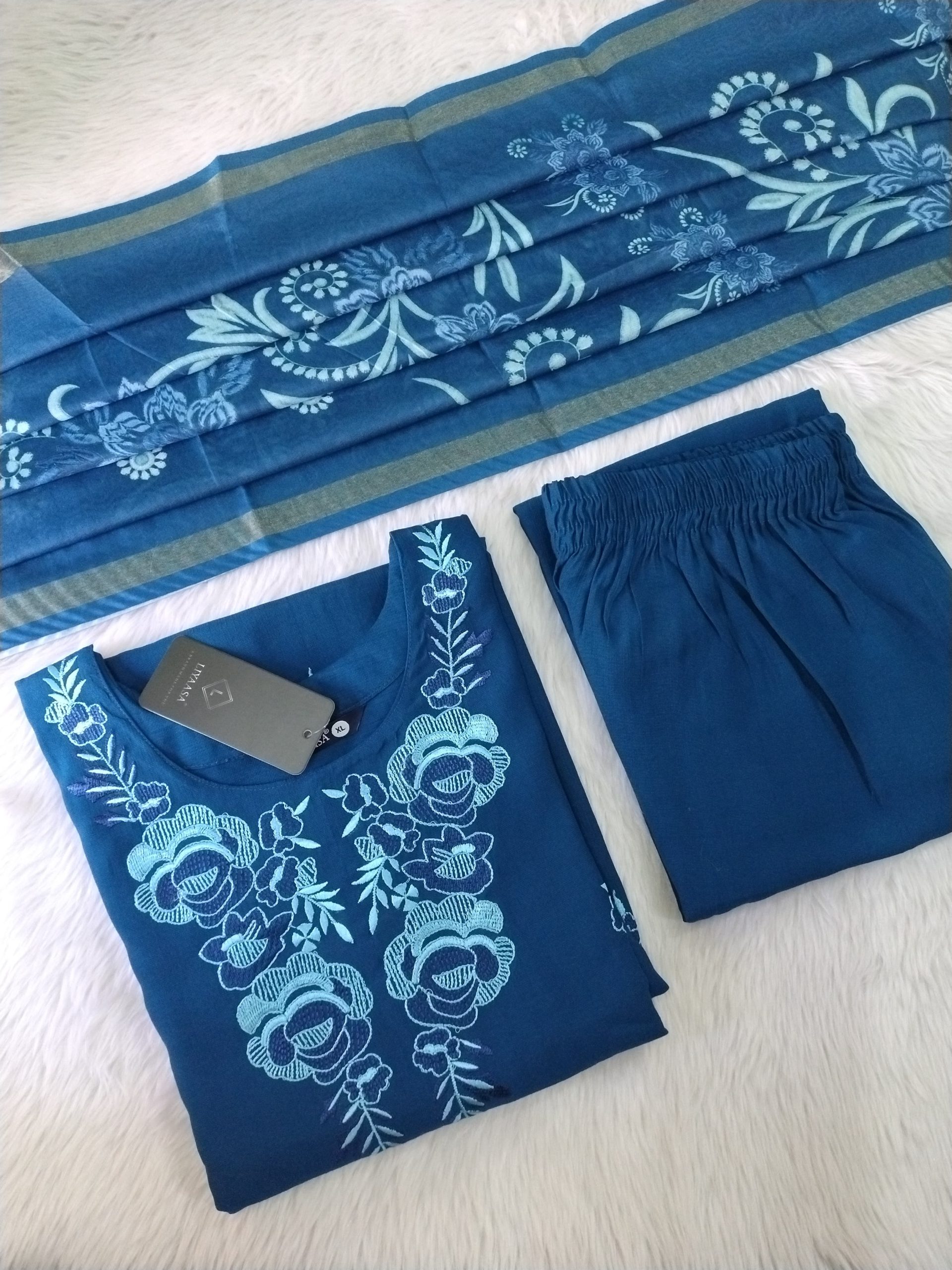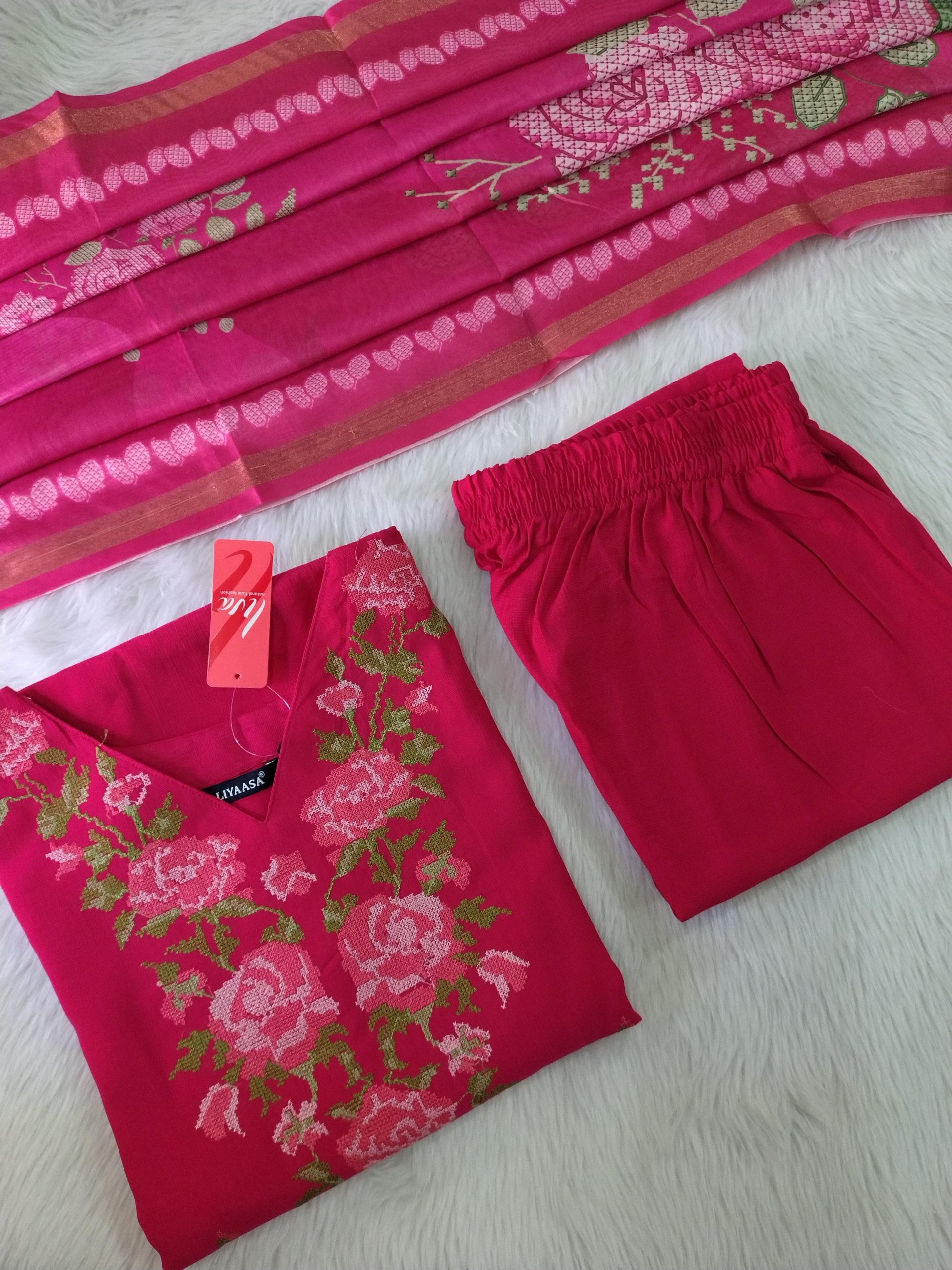 Step into luxurious elegance with this exquisite Premium Vatican Silk Kurti Set, thoughtfully designed to elevate your festive and occasion wear wardrobe. Crafted from rich Vatican silk fabric, the kurti showcases all-over intricate embroidery, giving it a regal and eye-catching finish that reflects fine craftsmanship. The side cut kurti design adds a modern twist to the traditional silhouette, creating a flattering and stylish look for every body type. Paired with a trending contrast pant, this set brings a perfect balance of color and sophistication, ensuring a standout appearance. Completing the ensemble is a stunning ombre-dyed Banarasi dupatta, approximately 2.5 meters in length, featuring a graceful blend of shades with a subtle sheen that enhances the overall elegance. The combination of premium materials, detailed embroidery, and contemporary styling makes this outfit ideal for festive celebrations, weddings, parties, and special gatherings. Designed for both comfort and style, it offers a refined look while allowing ease of movement throughout the day. With its timeless appeal and modern detailing, this kurti set is a must-have for anyone looking to make a graceful and stylish statement in ethnic fashion.