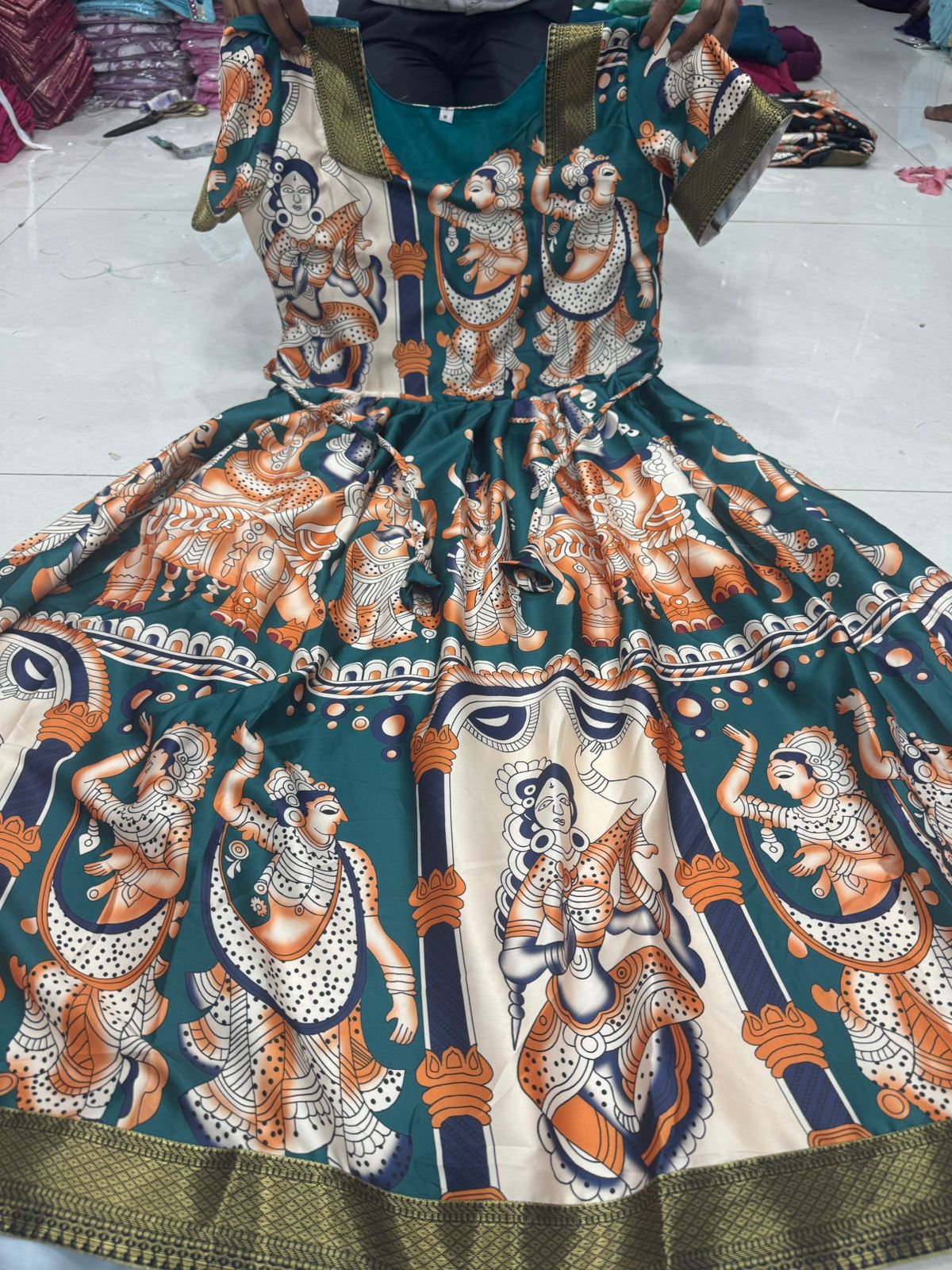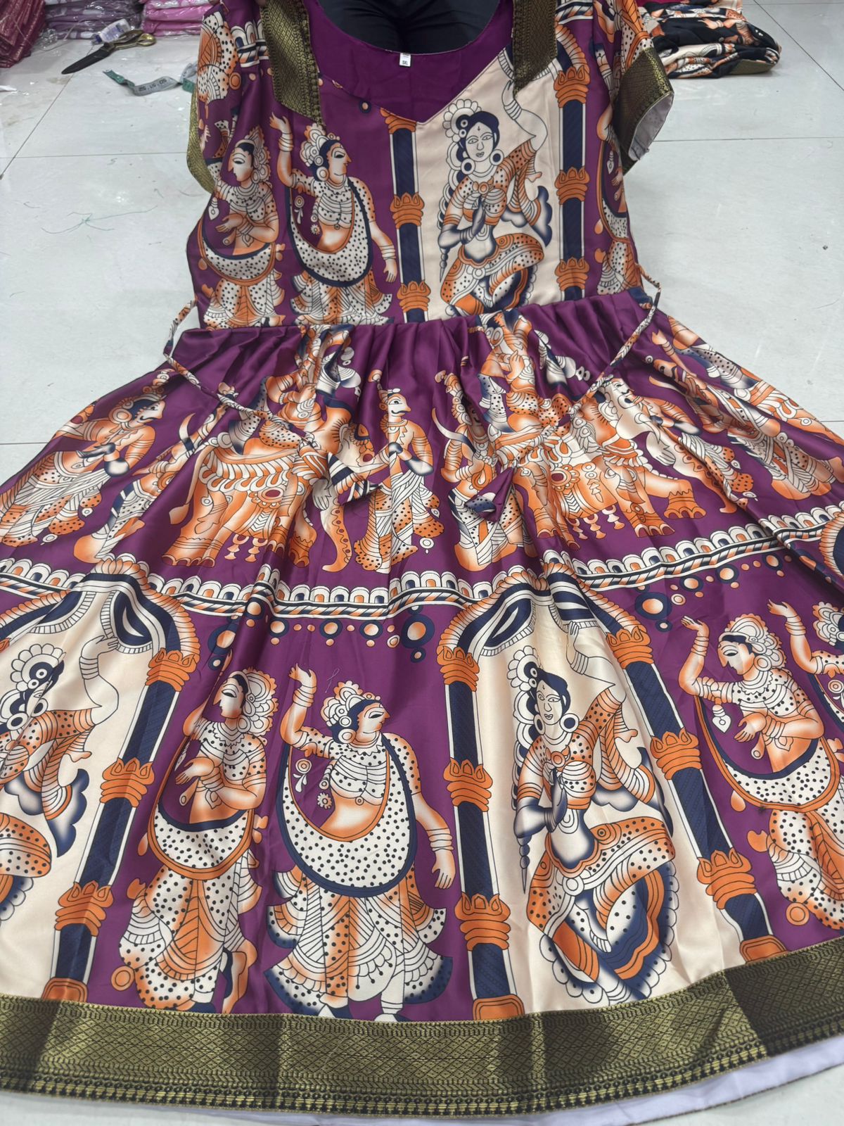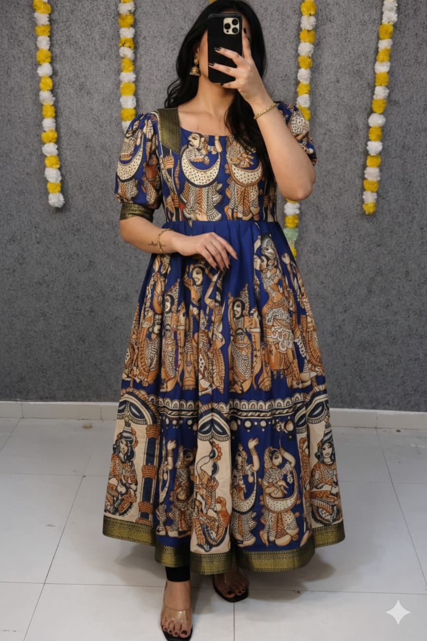 Step into timeless elegance with this stunning Kalamkari Anarkali Dress, inspired by celebrity style and crafted to bring a regal touch to your wardrobe. Made from luxurious malai satin fabric with heavy digital print, this outfit showcases rich Kalamkari patterns that reflect traditional artistry with a modern twist. The Anarkali is beautifully designed with a flowy full-length silhouette, enhanced by a soft crepe lining that ensures comfort while maintaining a graceful drape. Featuring stylish puff elbow sleeves, both the sleeves and the flare are finished with elegant Mangalagiri lace borders, adding a refined and sophisticated detail to the overall look. The long length design creates a flattering and royal appearance, perfect for festive occasions, weddings, cultural events, and special gatherings. Available in a wide range of sizes, it is tailored to provide a comfortable and confident fit for every body type. With its premium fabric, intricate prints, and elegant finishing, this Anarkali dress beautifully blends traditional charm with contemporary fashion, making it a must-have statement piece for those who love classic ethnic wear with a modern edge.