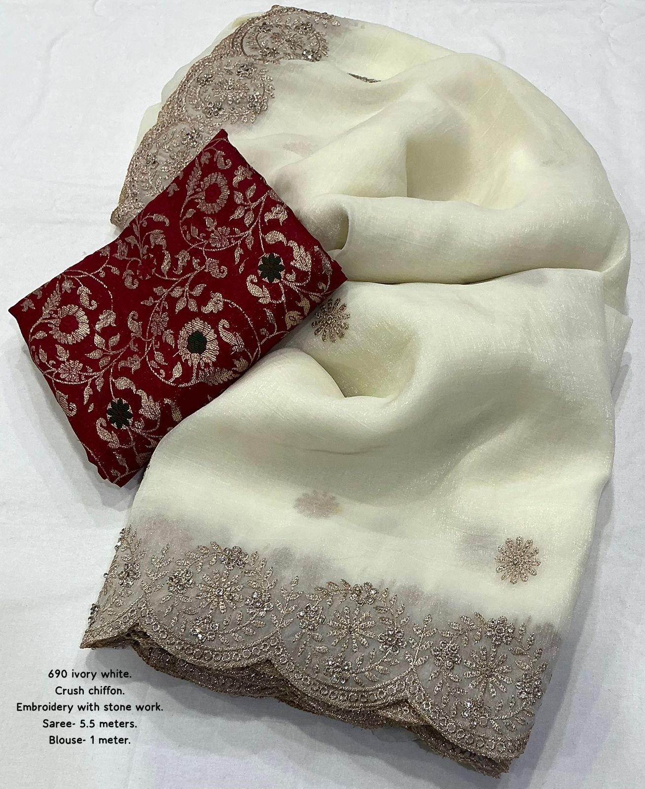 Exclusive new fancy off white embroidery saree designed for elegant and graceful occasions, crafted in premium soft crunchy crush chiffon that drapes beautifully and feels feather-light on the body, highlighted with rich zari embroidery and delicate stone work that adds a subtle festive sparkle, single colour edition makes it rare and classy, paired with a striking contrast red zari jaal Banarasi blouse that enhances the overall royal appeal, perfect for weddings, festive functions, parties and special celebrations, saree length of 5.5 meters with a generous 1 meter blouse piece allows comfortable styling, top premium quality finish ensures a luxurious look and long-lasting wear, an ideal choice for those who love timeless elegance with modern finesse.