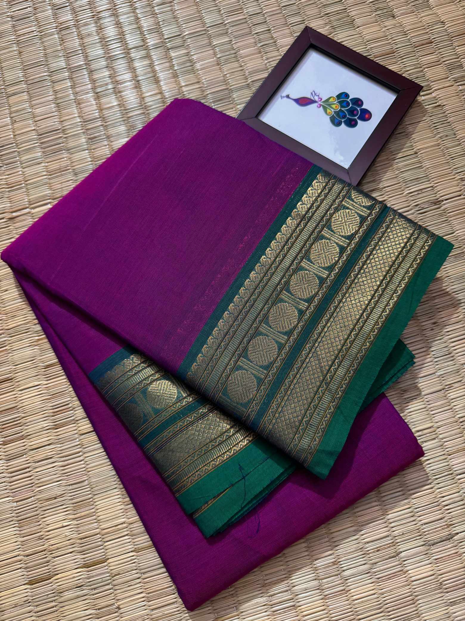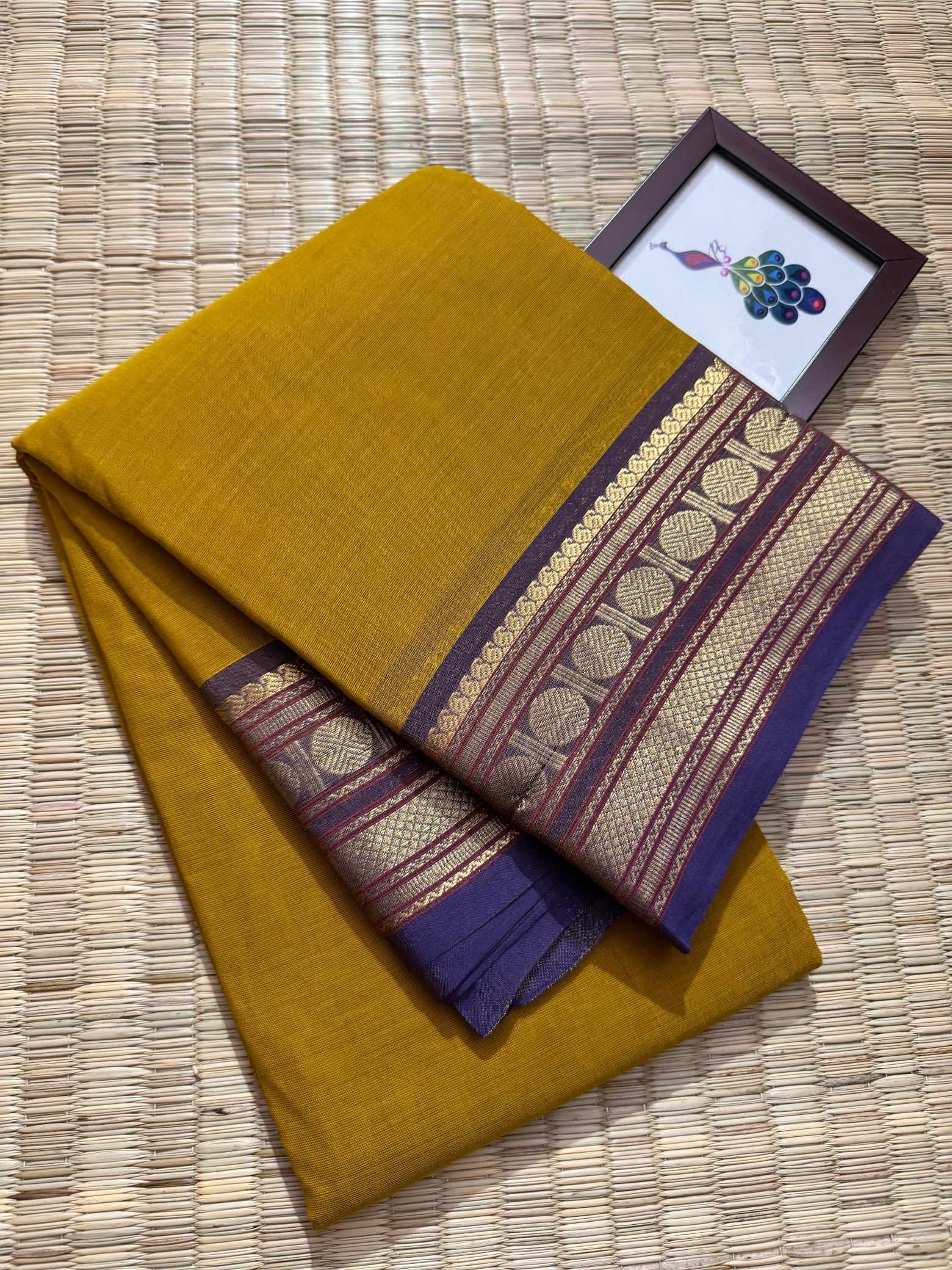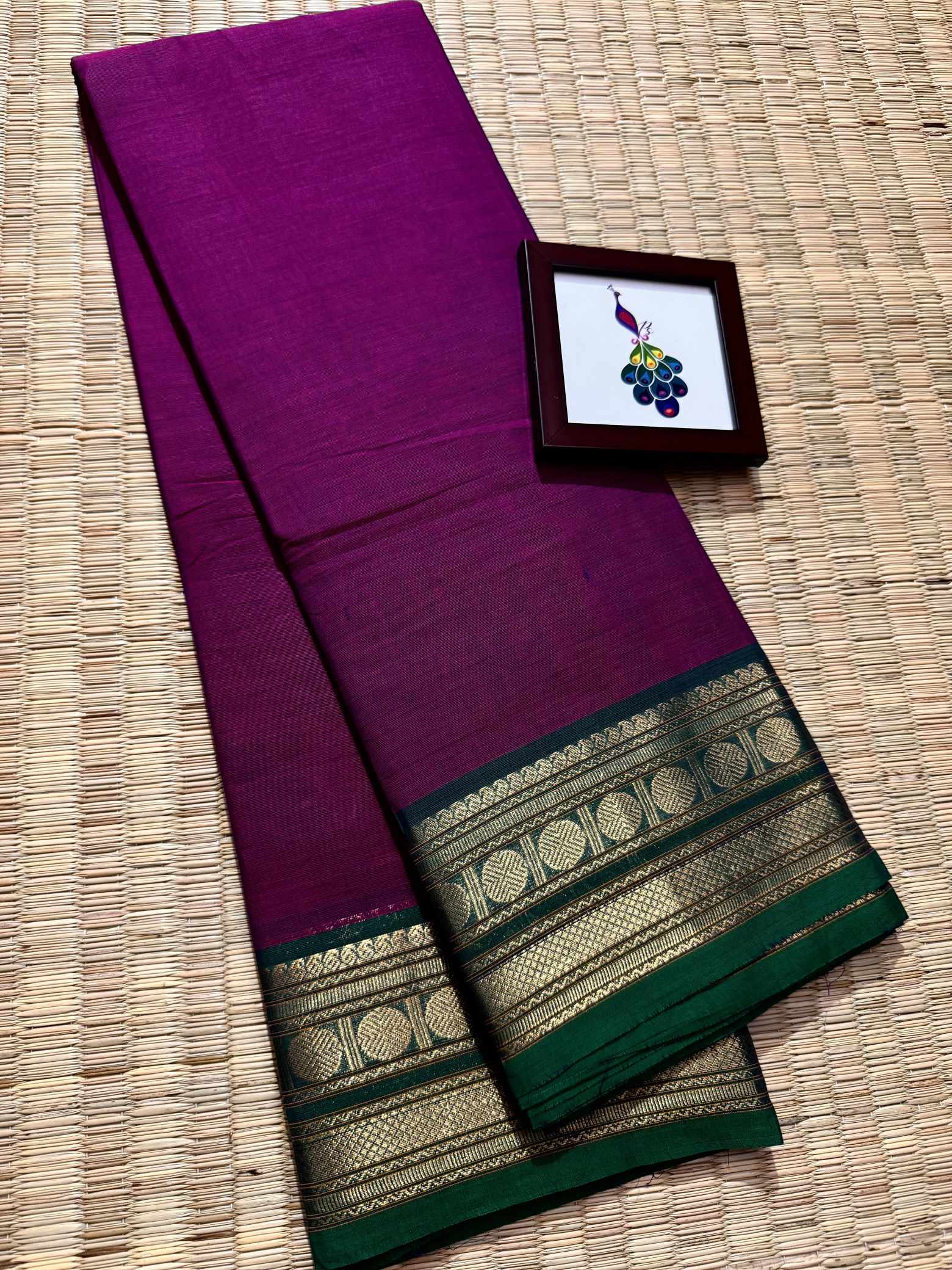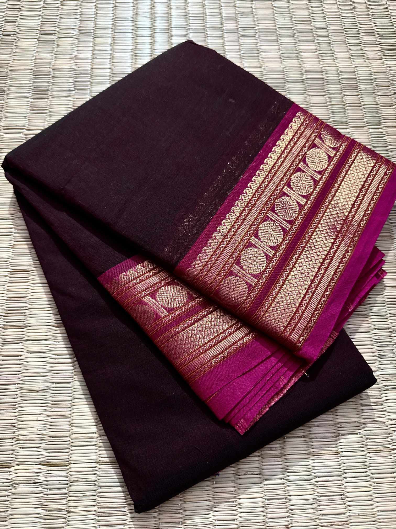 This saree is a beautiful expression of grace, confidence, and timeless leadership woven into every fold, designed for women who love to carry elegance with quiet power. Crafted in pure, breathable cotton, it offers unmatched comfort while maintaining a rich, dignified appearance that suits office wear, festive mornings, traditional gatherings, and elegant day events. The striking contrast gold Rudraksham border adds a heritage-inspired charm, while the zari-rich pallu finished with graceful tassels enhances the overall grandeur of the drape. Each pleat falls effortlessly, creating a polished and royal silhouette that looks refined yet understated. The saree comes with a perfectly matching running blouse, allowing you to style it traditionally or creatively—using the inner end border for sleeves on a contrast blouse to elevate the look further. Soft on the skin, rich to the eye, and rooted in tradition, this saree blends everyday elegance with festive richness, making it a versatile and exclusive addition to a woman’s wardrobe that celebrates both comfort and class.