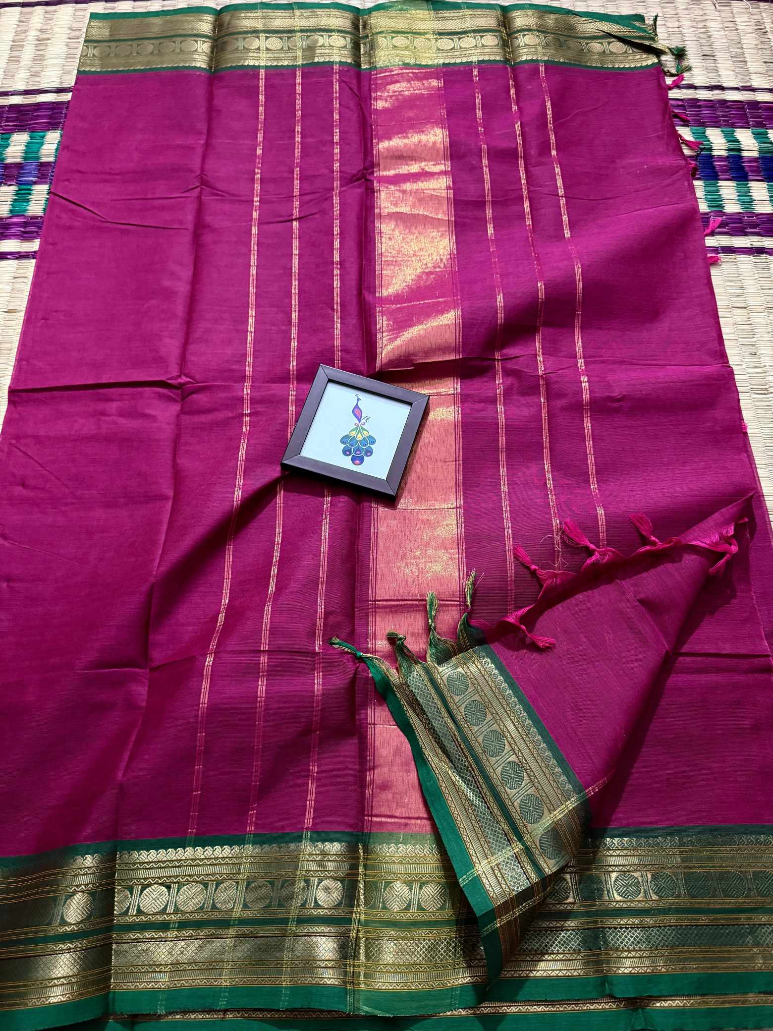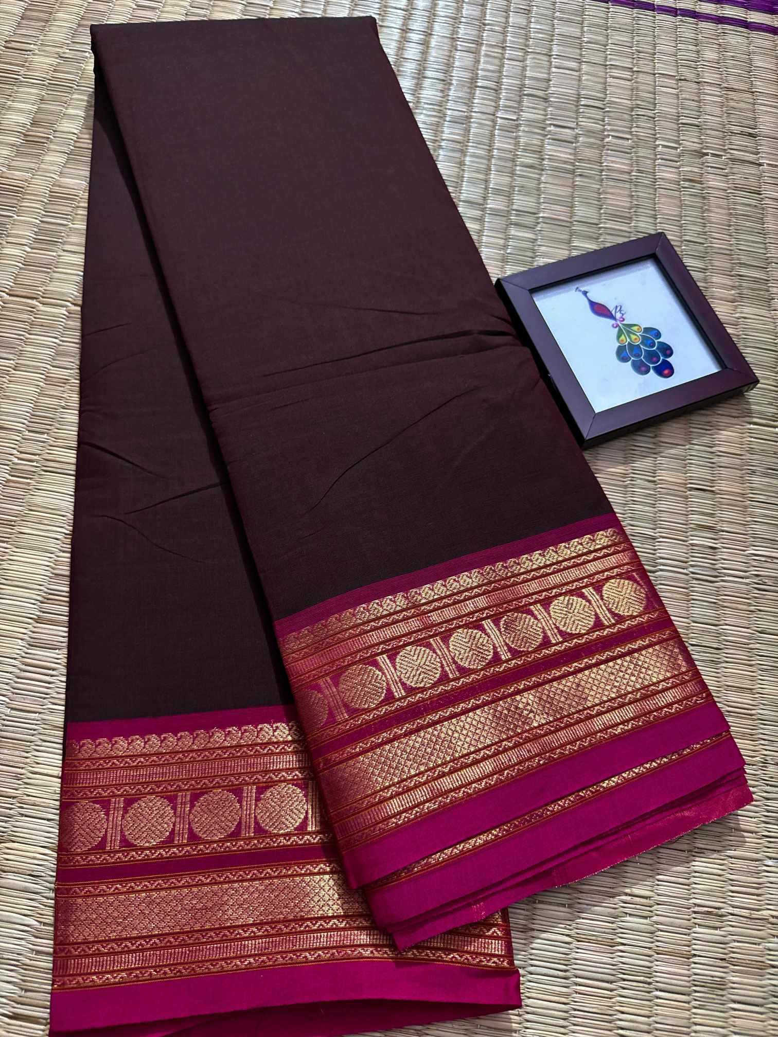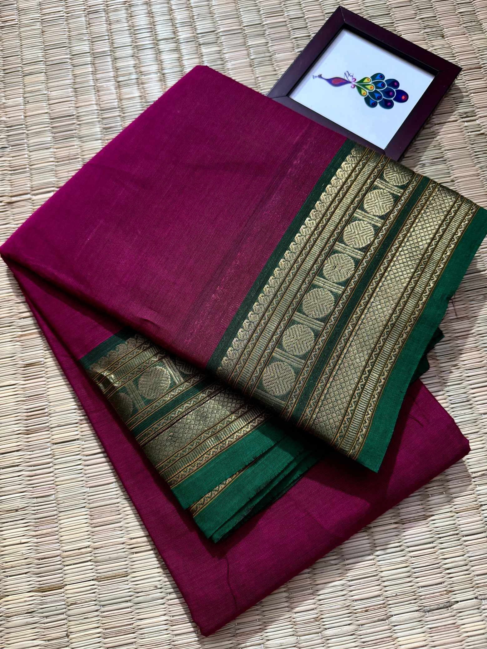 This saree is a beautiful expression of grace, confidence, and timeless leadership woven into every fold, designed for women who love to carry elegance with quiet power. Crafted in pure, breathable cotton, it offers unmatched comfort while maintaining a rich, dignified appearance that suits office wear, festive mornings, traditional gatherings, and elegant day events. The striking contrast gold Rudraksham border adds a heritage-inspired charm, while the zari-rich pallu finished with graceful tassels enhances the overall grandeur of the drape. Each pleat falls effortlessly, creating a polished and royal silhouette that looks refined yet understated. The saree comes with a perfectly matching running blouse, allowing you to style it traditionally or creatively—using the inner end border for sleeves on a contrast blouse to elevate the look further. Soft on the skin, rich to the eye, and rooted in tradition, this saree blends everyday elegance with festive richness, making it a versatile and exclusive addition to a woman’s wardrobe that celebrates both comfort and class.