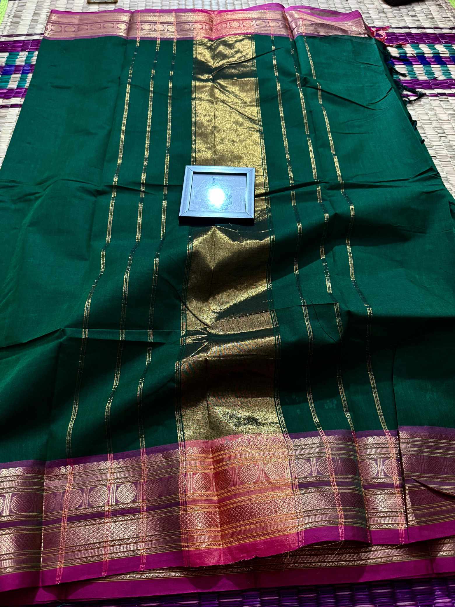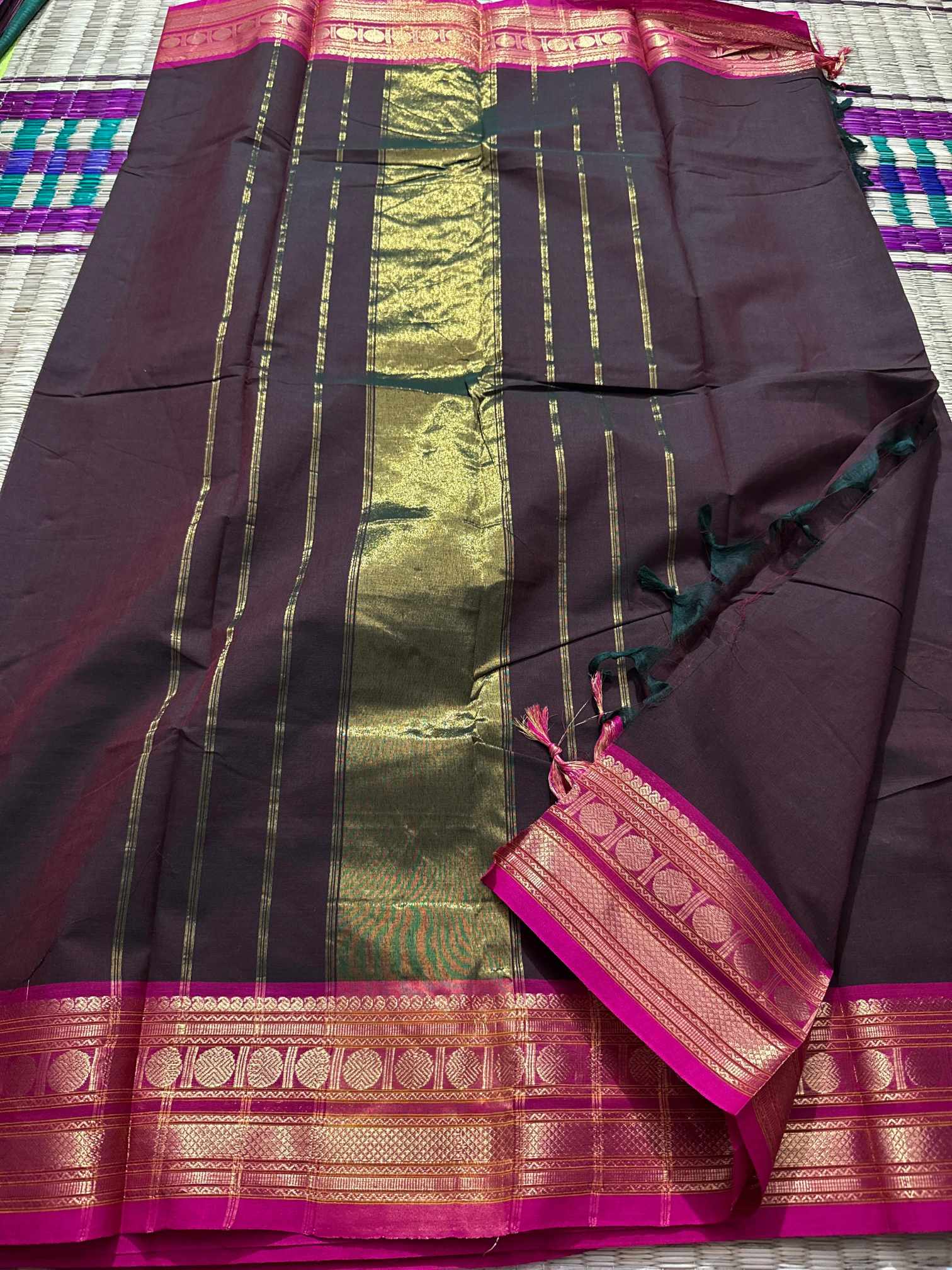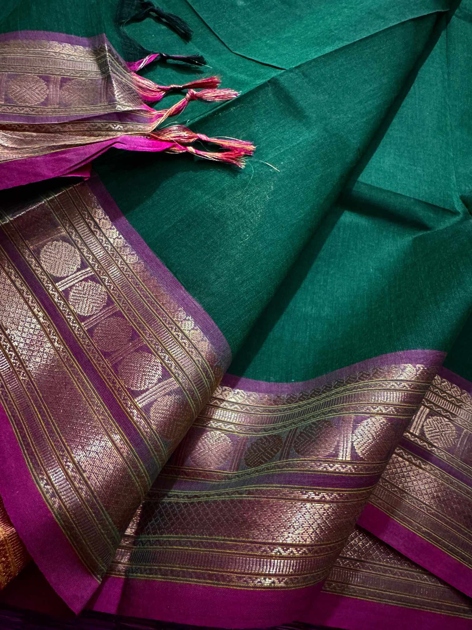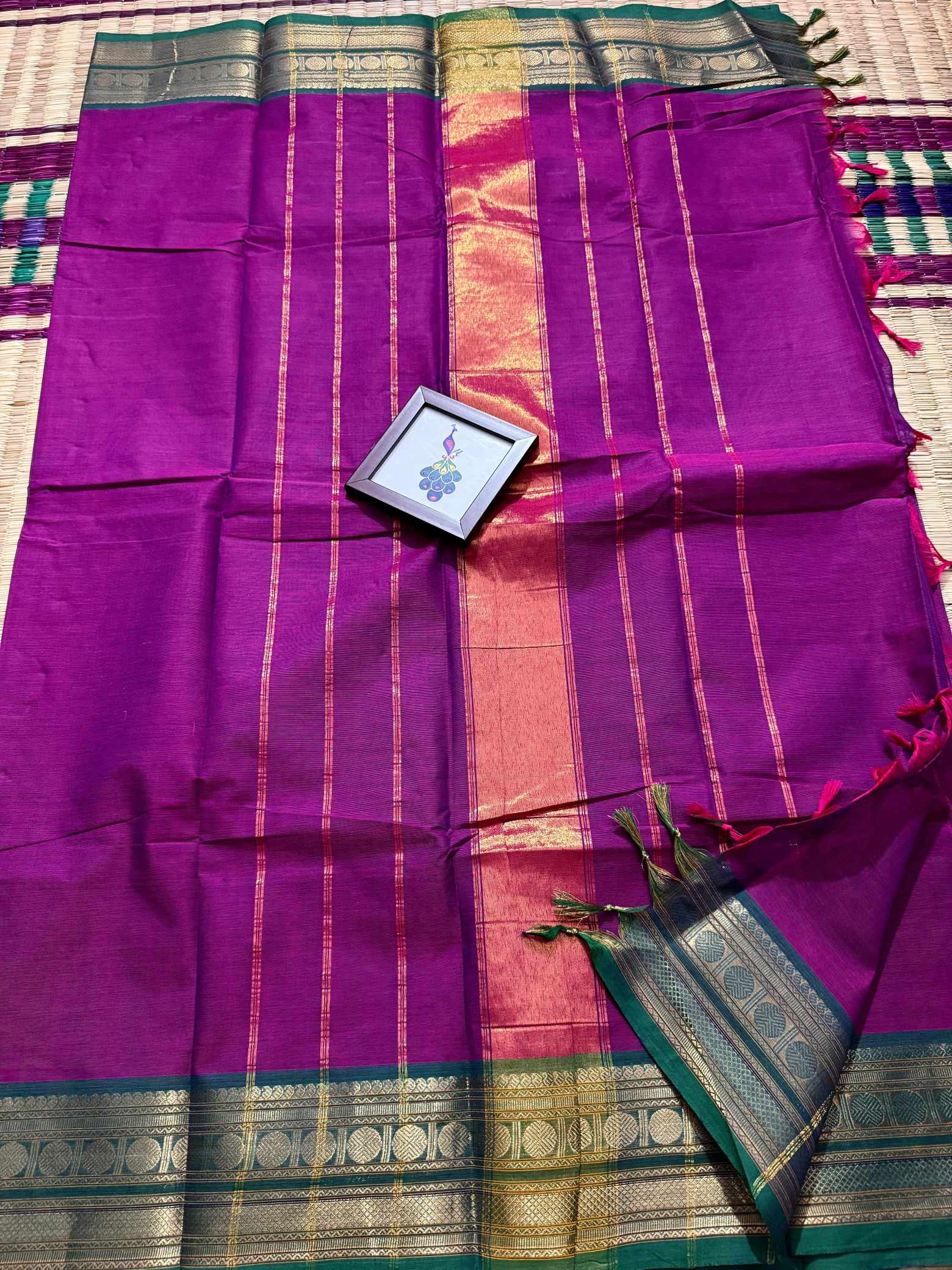 This saree is a beautiful expression of grace, confidence, and timeless leadership woven into every fold, designed for women who love to carry elegance with quiet power. Crafted in pure, breathable cotton, it offers unmatched comfort while maintaining a rich, dignified appearance that suits office wear, festive mornings, traditional gatherings, and elegant day events. The striking contrast gold Rudraksham border adds a heritage-inspired charm, while the zari-rich pallu finished with graceful tassels enhances the overall grandeur of the drape. Each pleat falls effortlessly, creating a polished and royal silhouette that looks refined yet understated. The saree comes with a perfectly matching running blouse, allowing you to style it traditionally or creatively—using the inner end border for sleeves on a contrast blouse to elevate the look further. Soft on the skin, rich to the eye, and rooted in tradition, this saree blends everyday elegance with festive richness, making it a versatile and exclusive addition to a woman’s wardrobe that celebrates both comfort and class.