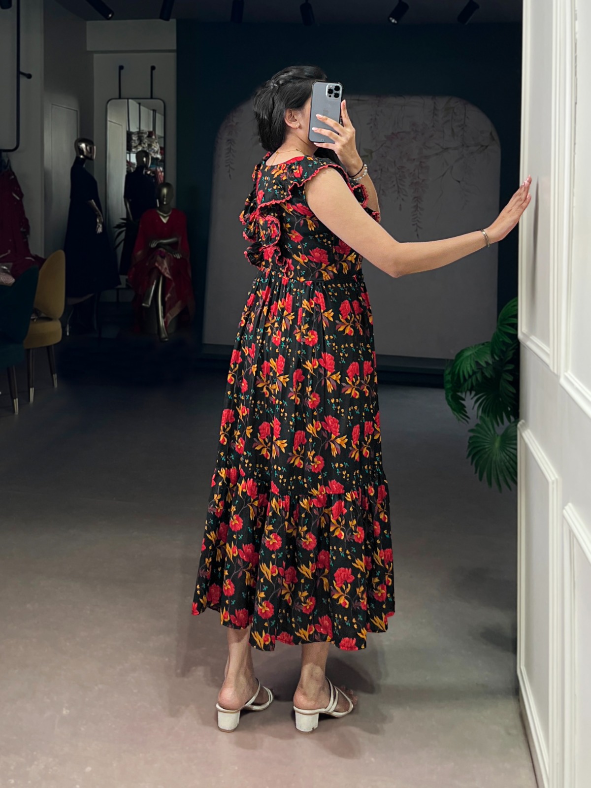 Add a touch of elegance and charm to your wardrobe with this beautiful Ethnic Floral Maslin Silk Frock, designed to make you stand out effortlessly. Crafted from premium maslin silk fabric, this outfit offers a smooth texture with a subtle sheen, enhanced by graceful floral prints that bring a fresh and feminine appeal. The frock features a flattering full-length silhouette with an impressive 4-meter flare, creating a flowy and voluminous look that moves beautifully with every step. Lined with soft micro crepe, it ensures comfort while maintaining a perfect drape and structure. Designed to suit different body types, it provides a comfortable fit with support for multiple sizes, making it both stylish and practical. The elegant length and well-balanced waist design add to its overall sophistication, making it ideal for festive occasions, casual gatherings, parties, or special outings. Available in multiple attractive shades, each piece reflects a blend of traditional charm and modern style. With its premium fabric, vibrant prints, and graceful flow, this frock is a perfect choice for anyone looking to embrace effortless ethnic fashion with a contemporary twist.