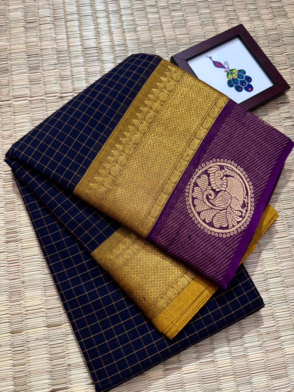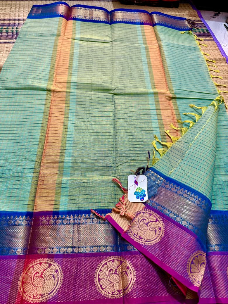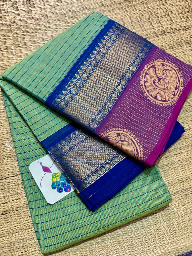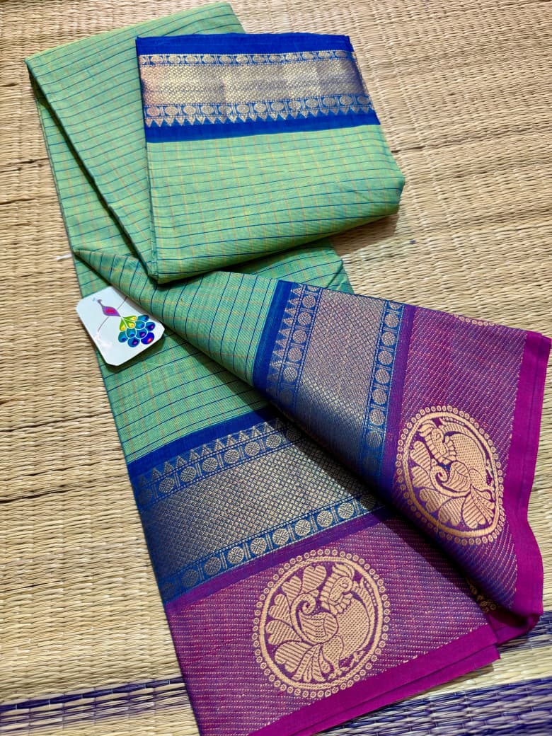 Another soft and smooth version of classic Kanchi cotton saree crafted for women who love comfort blended with timeless elegance, this saree features a graceful full body checks pattern that adds a refined and structured look while keeping the drape light and breathable for all-day wear, beautifully finished with a rich thread pallu adorned with delicate tassels that enhance its traditional charm, complemented by a neatly woven thread border that frames the saree with subtle sophistication, paired with a matching running blouse for a complete and versatile ensemble, perfect for office wear, casual elegance, festive mornings, and traditional gatherings, offering effortless style, comfort, and heritage charm in every fold.