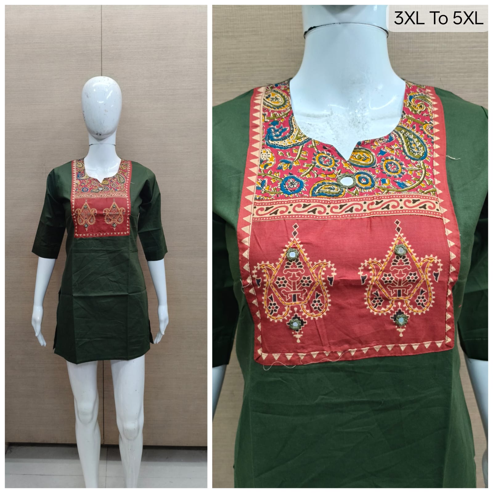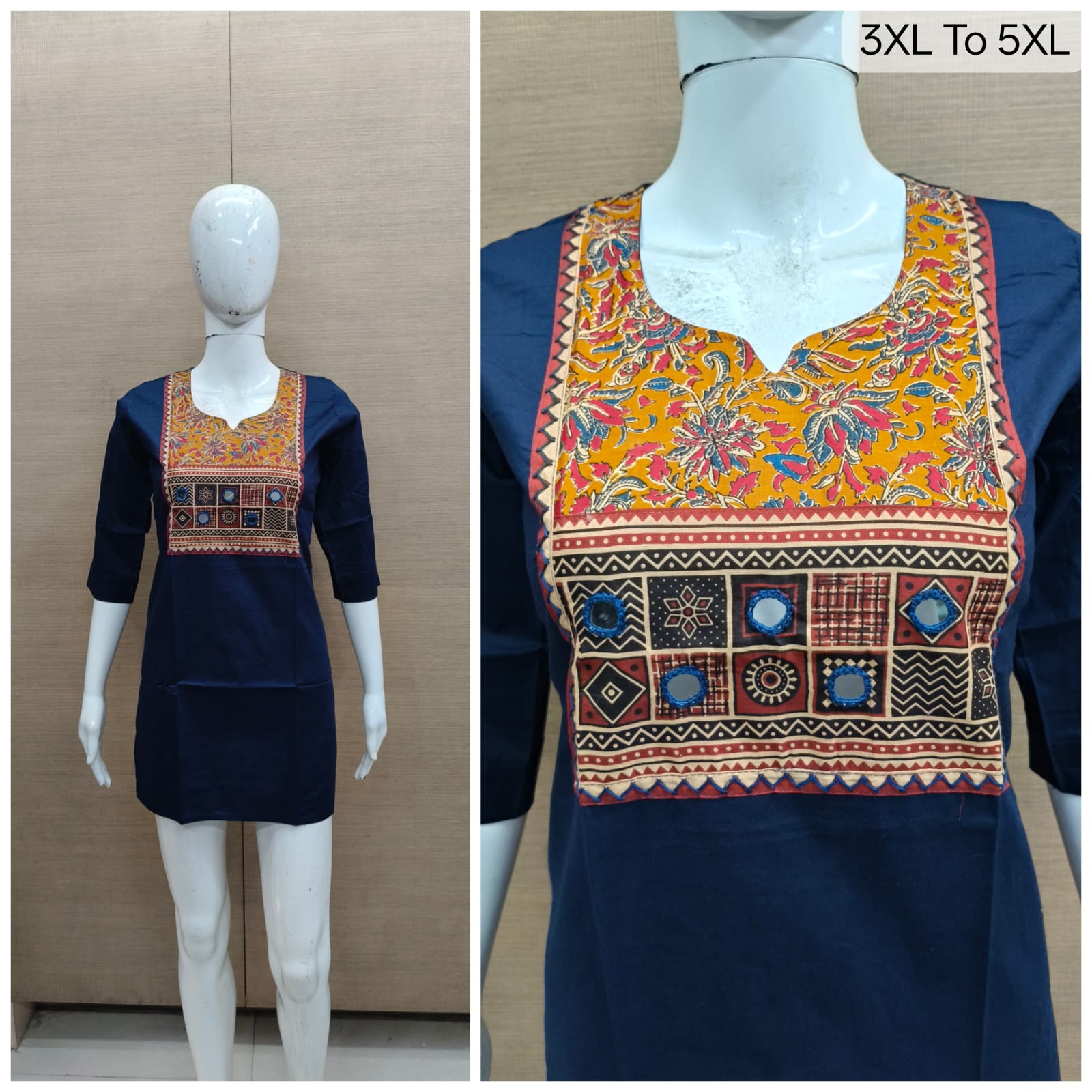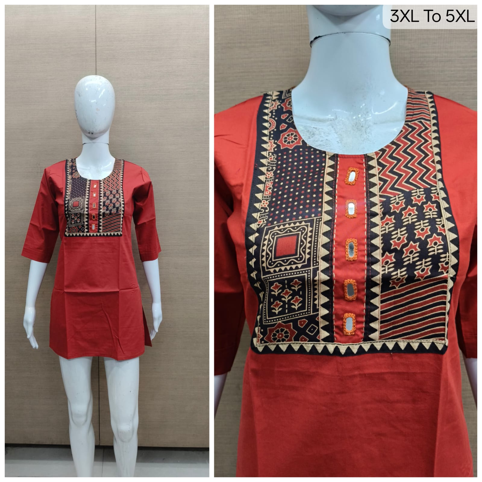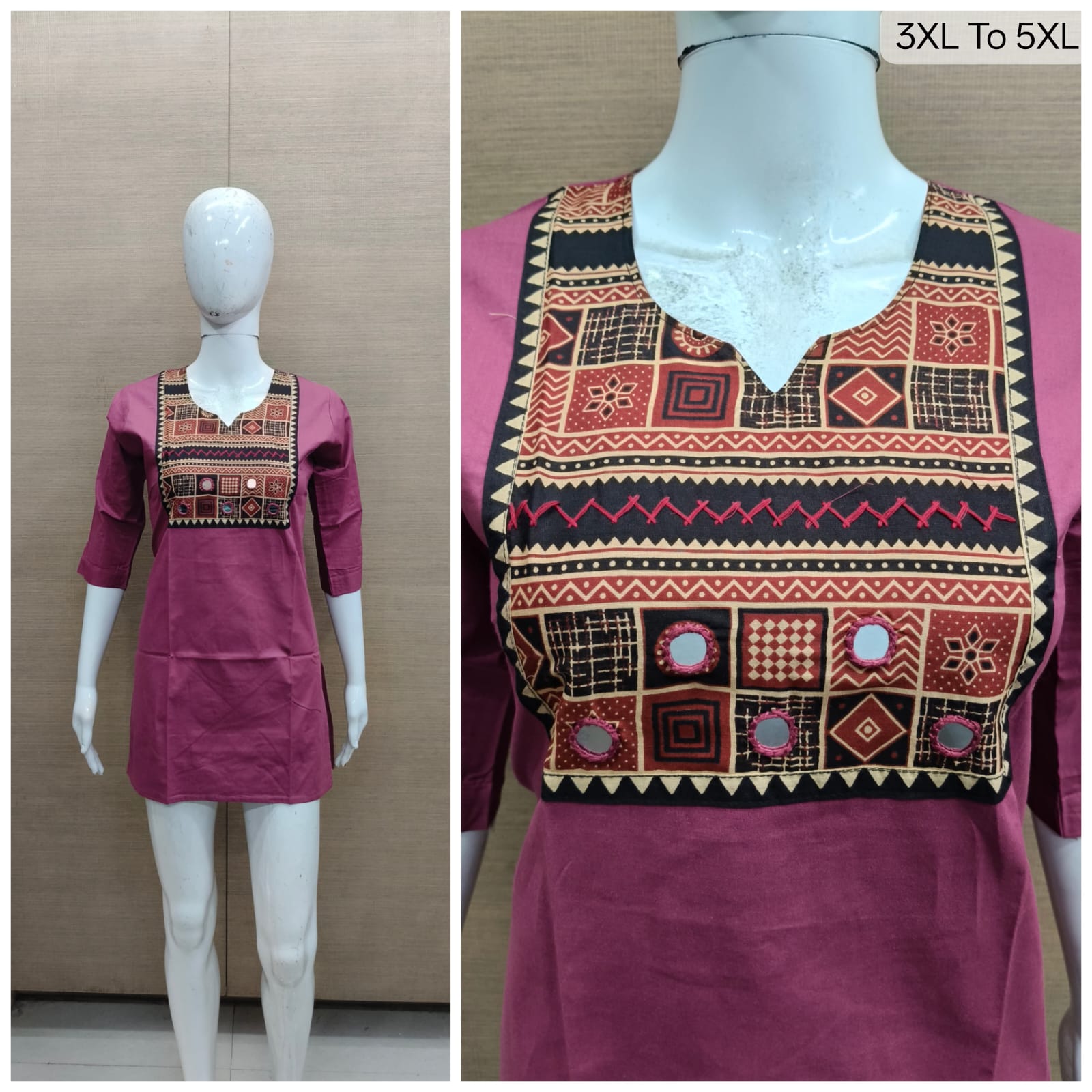 Add a fresh touch to your summer wardrobe with this elegant Dhabu Cotton Short Top, specially designed for women who love comfortable ethnic fashion with stylish handcrafted details. Made from premium quality Dhabu cotton fabric, this top is lightweight, breathable, and perfect for warm weather, ensuring all-day comfort while keeping your style effortlessly graceful. The design highlights a beautiful hand mirror and intricate Aari work on a decorative patch, giving the outfit a unique artisanal charm that reflects traditional craftsmanship with a modern twist. Featuring a round neckline and three-quarter sleeves, the top offers a balanced and flattering look that works perfectly for casual outings, daily wear, or simple festive gatherings. With its comfortable 32-inch length, it pairs easily with jeans, leggings, palazzos, or skirts, allowing you to create multiple stylish outfit combinations. Designed especially with plus size options from 3XL to 5XL, this exclusive collection celebrates inclusivity while maintaining elegance and comfort. Perfect for summer days, travel, casual meetups, or relaxed ethnic styling, this luxurious short top blends heritage-inspired design with contemporary fashion, making it a must-have addition to any modern ethnic wardrobe.