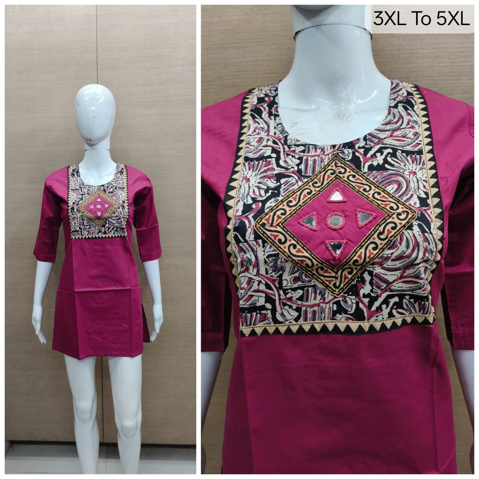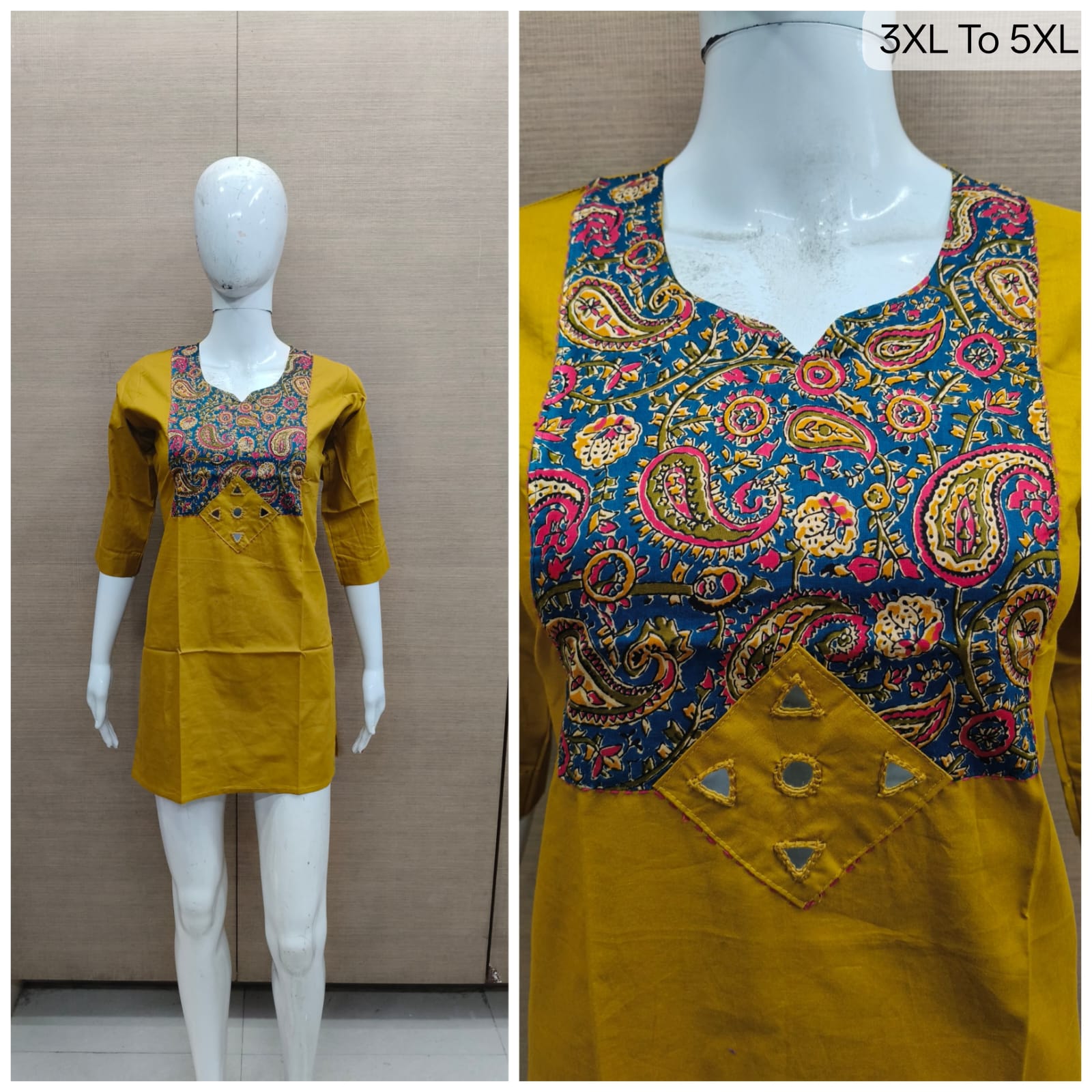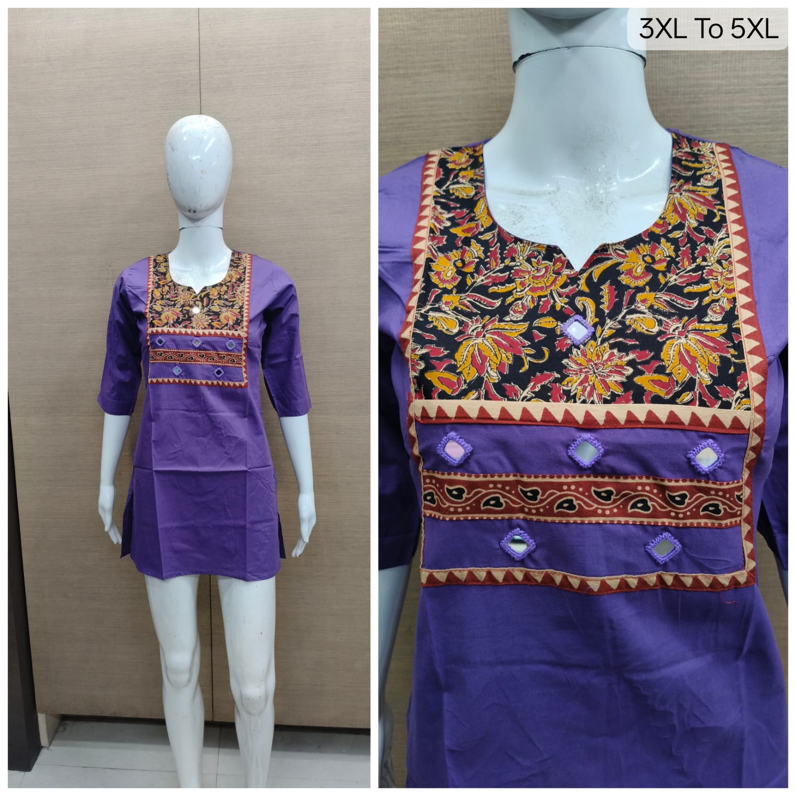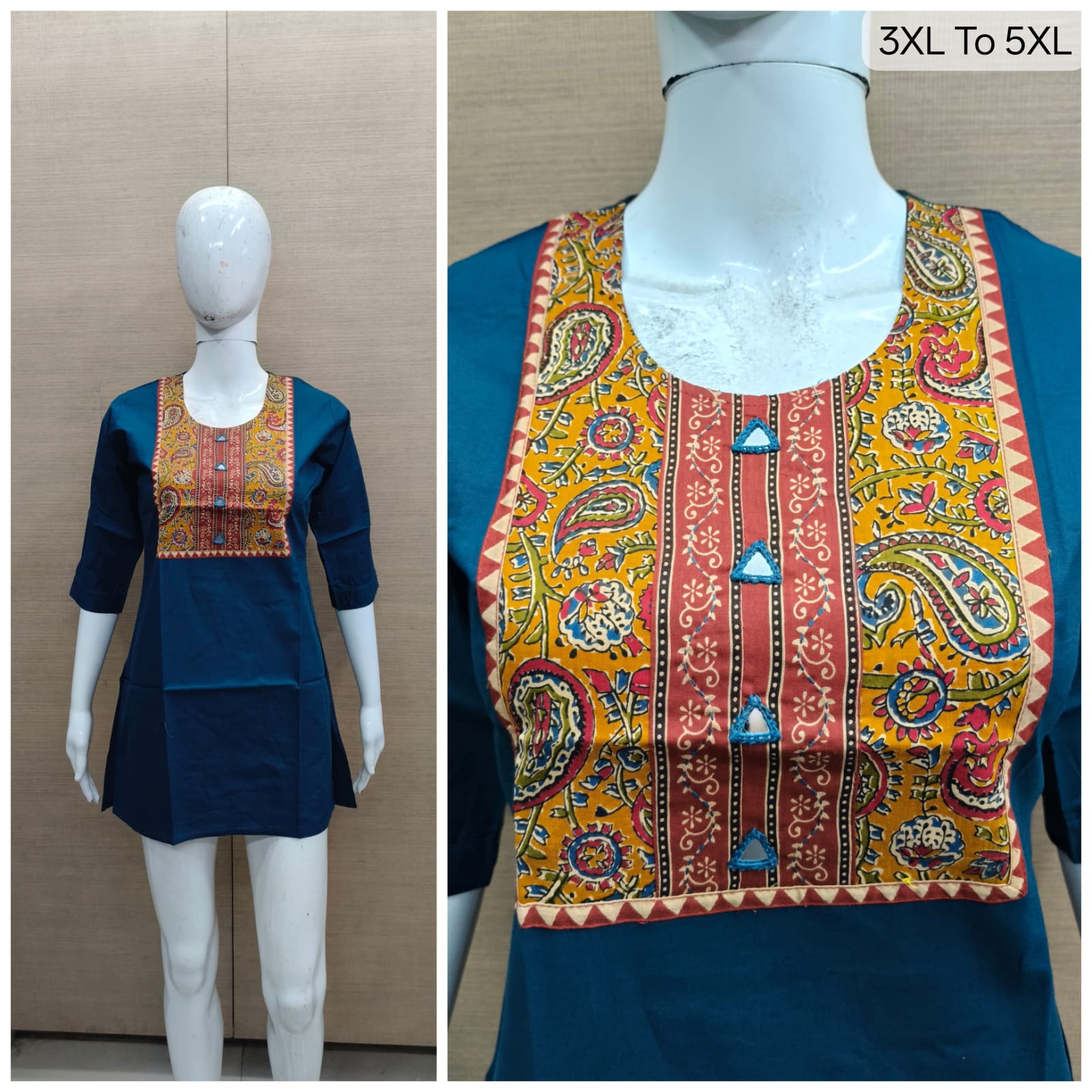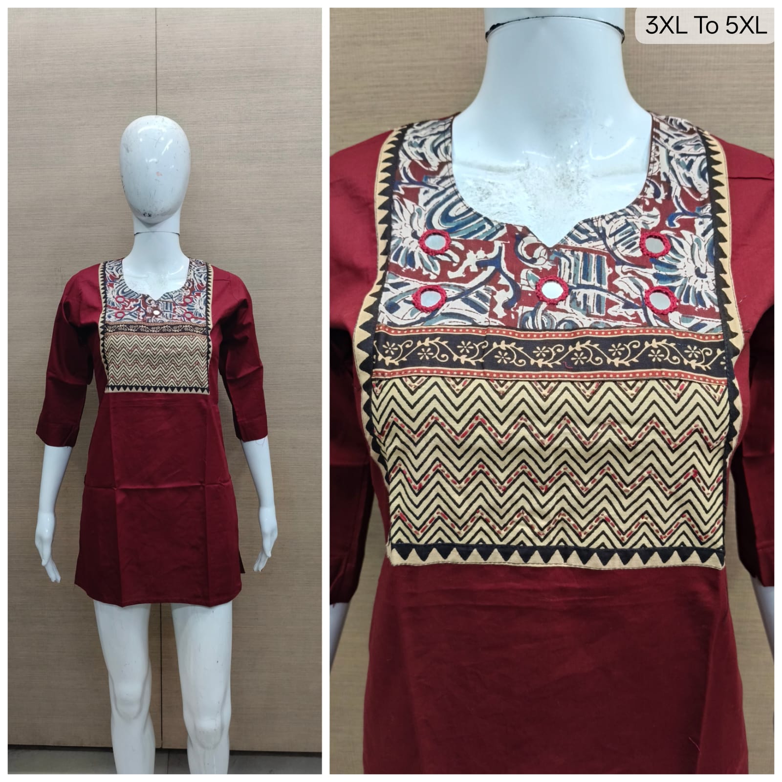 Add a fresh touch to your summer wardrobe with this elegant Dhabu Cotton Short Top, specially designed for women who love comfortable ethnic fashion with stylish handcrafted details. Made from premium quality Dhabu cotton fabric, this top is lightweight, breathable, and perfect for warm weather, ensuring all-day comfort while keeping your style effortlessly graceful. The design highlights a beautiful hand mirror and intricate Aari work on a decorative patch, giving the outfit a unique artisanal charm that reflects traditional craftsmanship with a modern twist. Featuring a round neckline and three-quarter sleeves, the top offers a balanced and flattering look that works perfectly for casual outings, daily wear, or simple festive gatherings. With its comfortable 32-inch length, it pairs easily with jeans, leggings, palazzos, or skirts, allowing you to create multiple stylish outfit combinations. Designed especially with plus size options from 3XL to 5XL, this exclusive collection celebrates inclusivity while maintaining elegance and comfort. Perfect for summer days, travel, casual meetups, or relaxed ethnic styling, this luxurious short top blends heritage-inspired design with contemporary fashion, making it a must-have addition to any modern ethnic wardrobe.