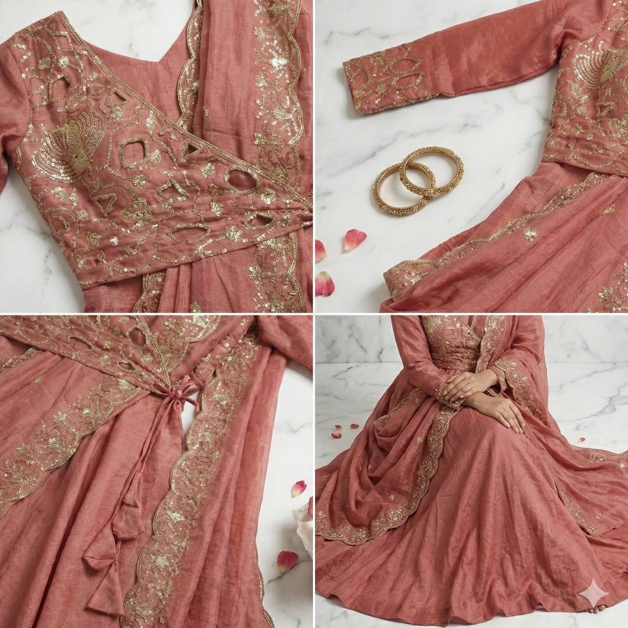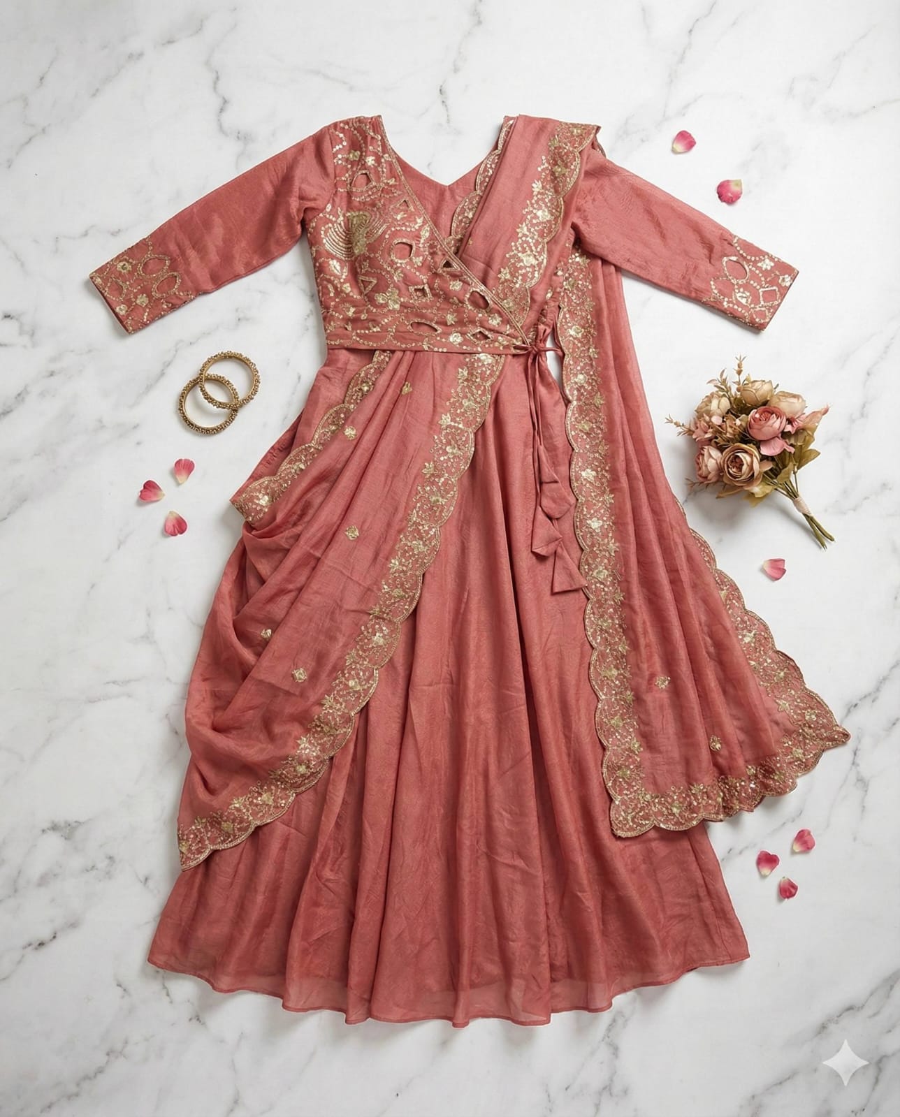 Paired with a matching Vichitra silk dupatta, it is enhanced with scalloped edges and heavy golden embroidery that complements the bodice, along with subtle embroidered butti detailing across the fabric. Available in sizes S (36), M (38), L (40), XL (42), XXL (44), and 3XL (46), it is designed to suit a wide range of body types with a flattering and comfortable fit. Perfect for weddings, festive occasions, and grand celebrations, this Anarkali set combines traditional craftsmanship with modern elegance for a truly timeless look.