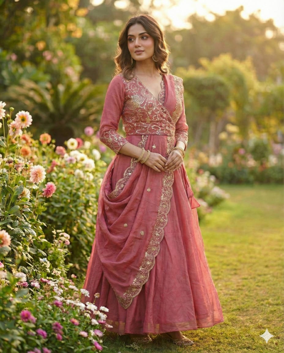 Step into royal elegance with the Swarnima Anarkali, a beautifully designed floor-length gown crafted from premium Vichitra silk that exudes grace and sophistication. The fitted bodice features heavy gold thread embroidery with intricate floral and bird-inspired patterns along with delicate cutwork (jali) detailing, giving it a rich and luxurious appeal. Designed with a graceful flare of approximately 3.5 meters, this Anarkali creates a stunning silhouette, while the complete inner lining ensures comfort for long hours of wear. It comes with elegant sleeves of around 18 inches and a gown length of approximately 50 inches, offering a perfect blend of style and coverage.